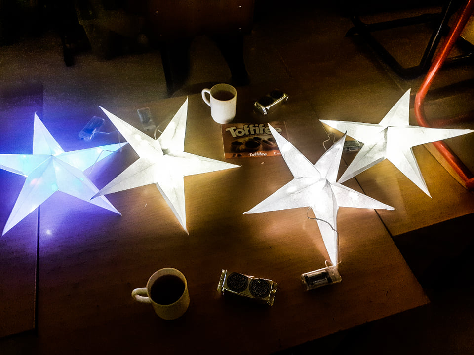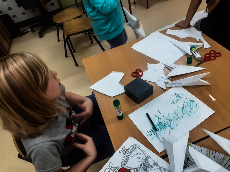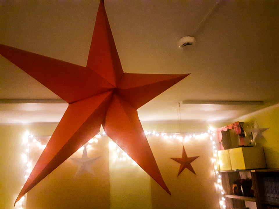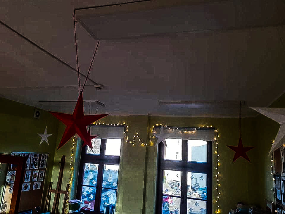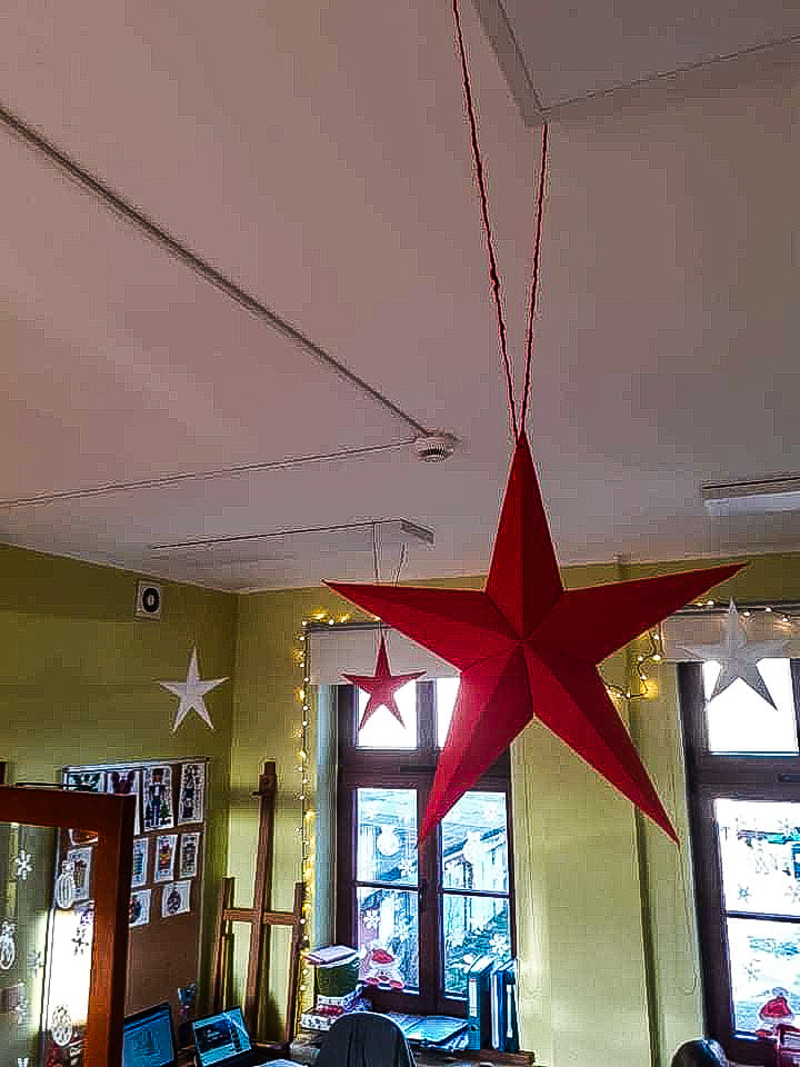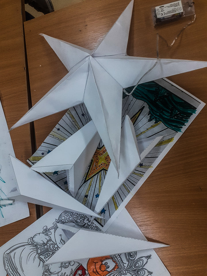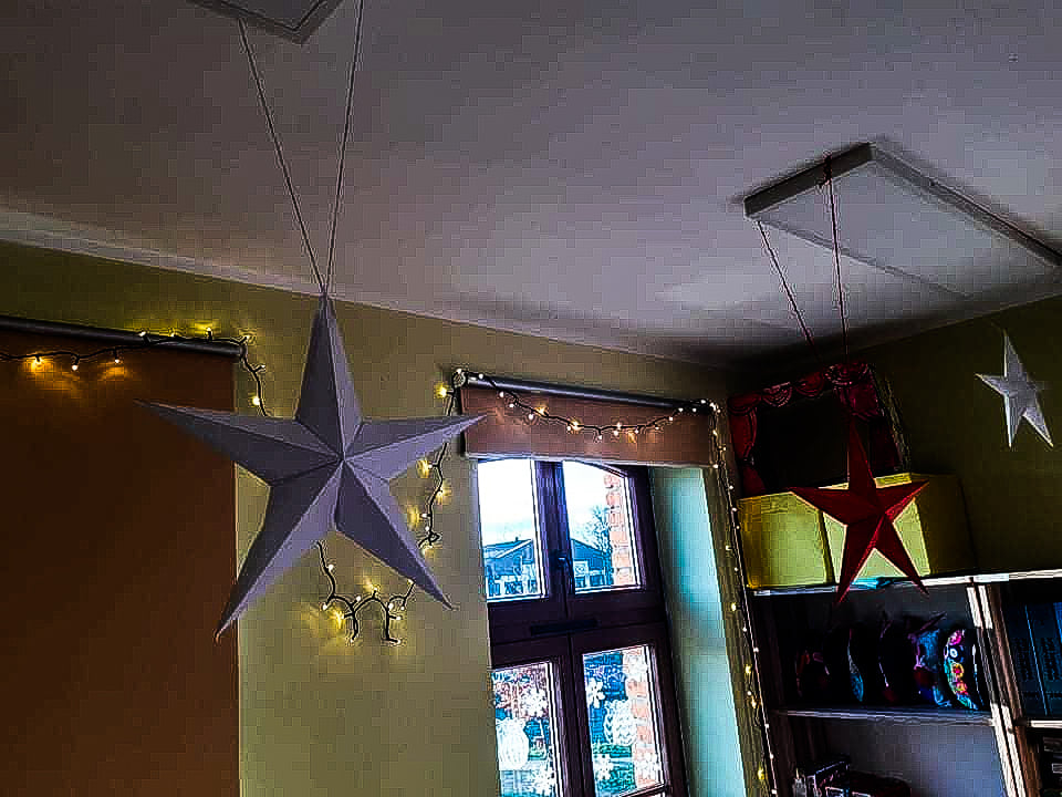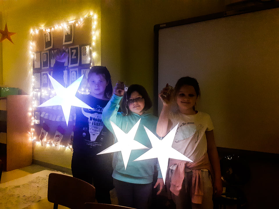 Przygotowania do świąt powoli dobiegają końca. My wykonaliśmy jeszcze gwiazdy z papieru, z bardzo prostego szablonu. Te, które zabraliśmy ze sobą do domów, rozbłysły światełkami led umieszczonymi w ich środku. Efekt był na prawdę niesamowity, ale to możecie zobaczyć na zdjęciach. Niektóre gwiazdy zostały z nami w świetlicy i zawieszone pod lampami nadają pomieszczeniom świątecznego charakteru.