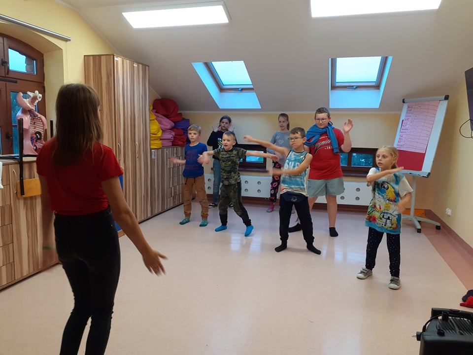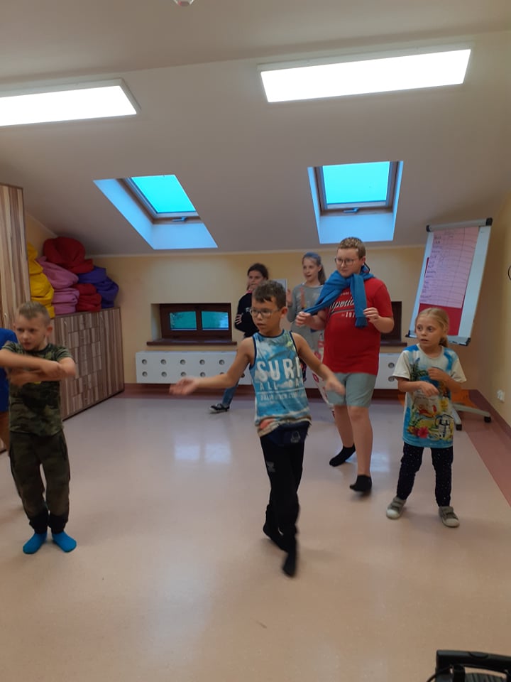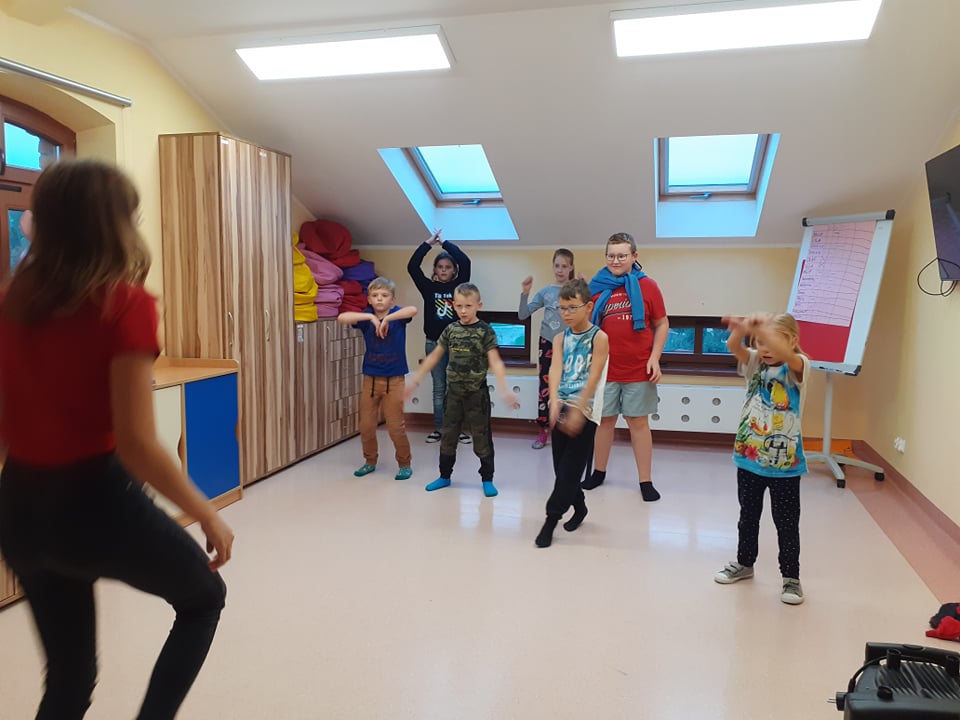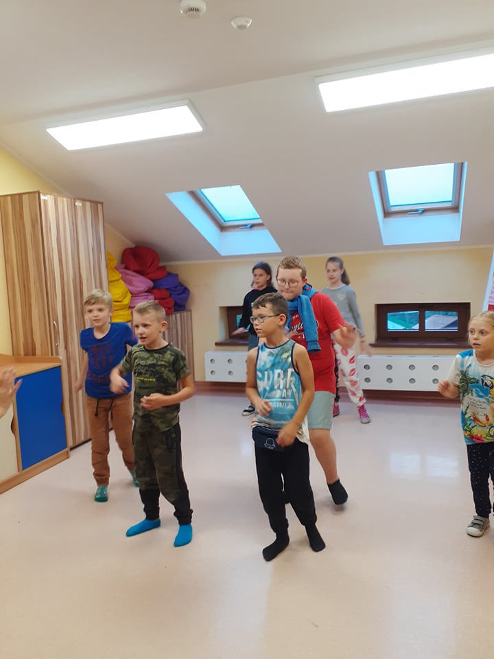 Deszczowa pogoda nie mogła nam popsuć dnia. Postanowiliśmy trochę się poruszać przy dźwiękach muzyki. Julia zgodziła się być instruktorką. W tej roli spisuje się rewelacyjnie, a dzieciaki chętnie włączyły się w naukę układu. Planujemy go regularnie ćwiczyć, a co z tego wyjdzie? Któż to wie… Czekajcie na nasze dalsze taneczne doniesienia!