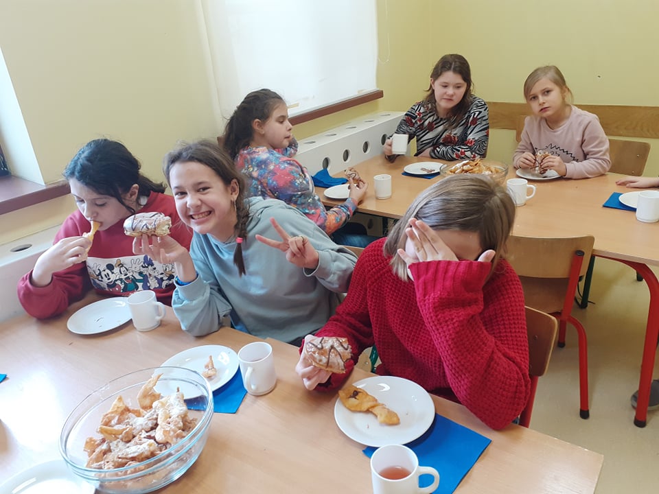 W Tłusty Czwartek było u nas na prawdę słodko. A to za sprawą pysznych pączków z marmoladą, wanilią i czekoladą oraz faworków, które przygotowaliśmy zupełnie sami! Chruścików było tyle, że każdy z nas zabrał do domu małą paczuszkę, aby nasi bliscy mogli się przekonać, jakimi zdolnymi cukiernikami jesteśmy 😉