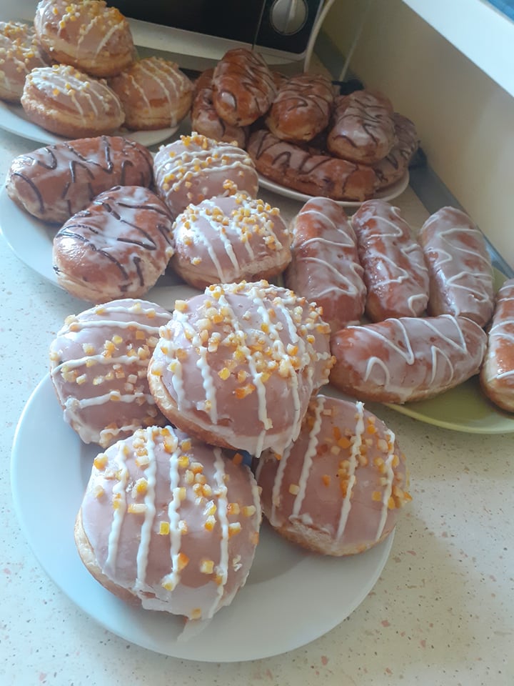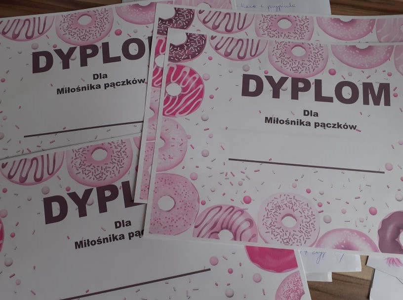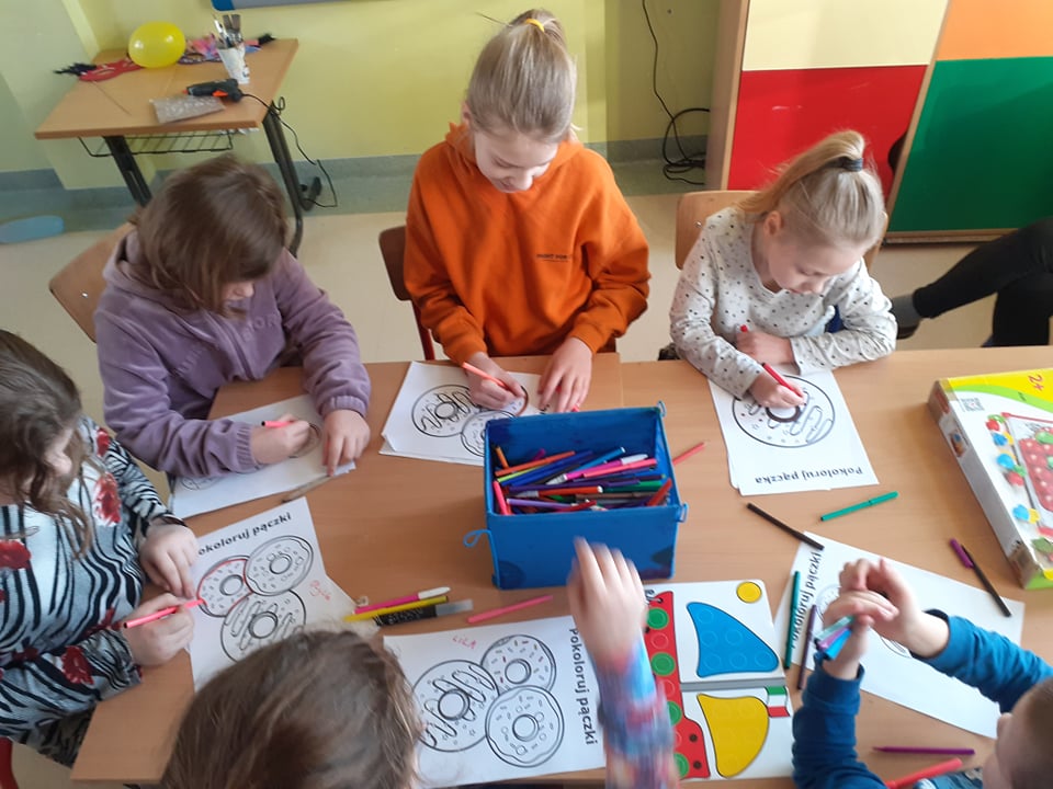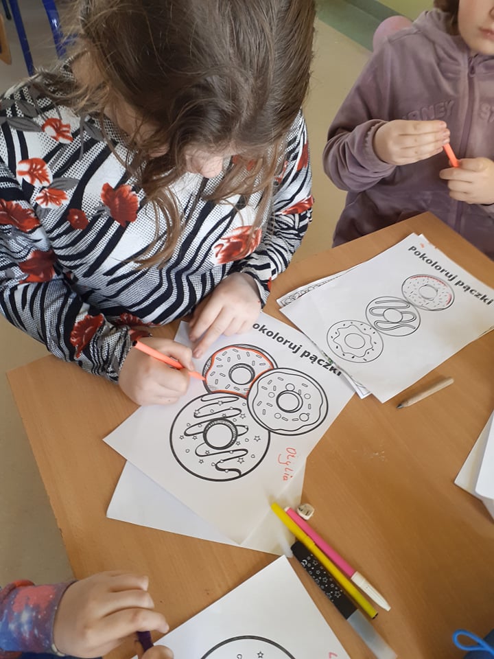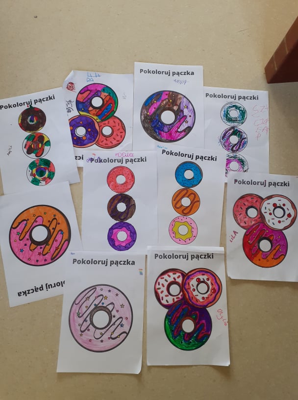 Na zakończenie powstały kolorowankowe wariacje pączków. Jako że sami nie byliśmy w stanie ich przygotować ze względów na warunki, pomyśleliśmy, że możemy choć na kartkach puścić wodze naszej fantazji i stworzyć naszego wymarzonego, pysznego pączka!