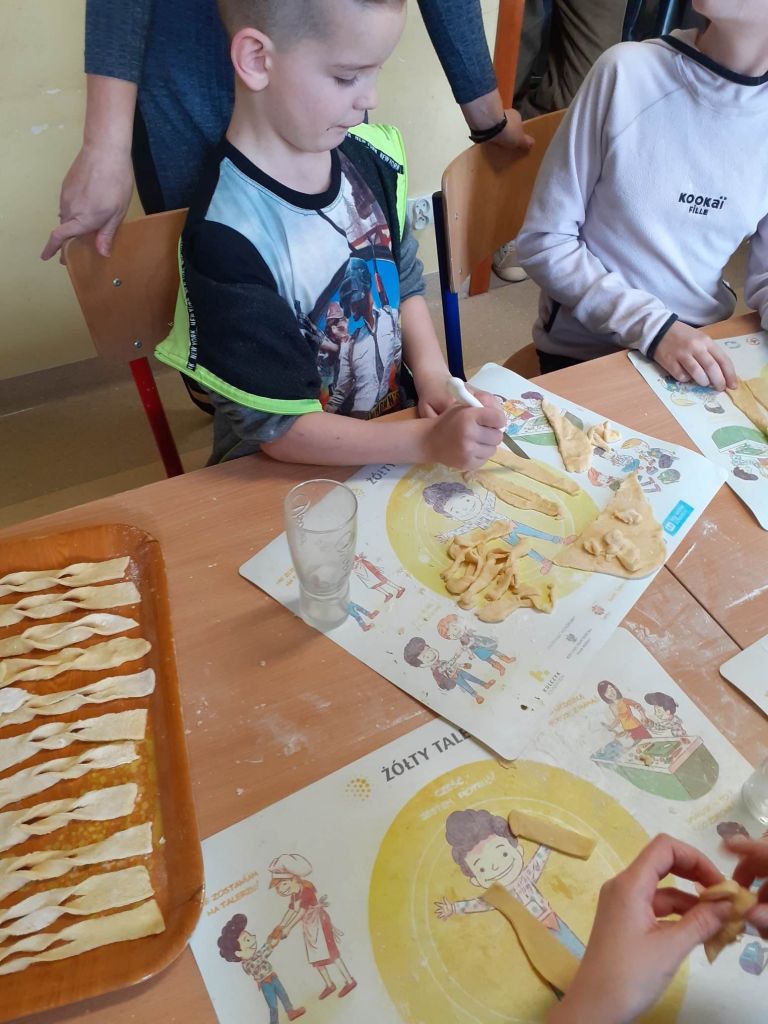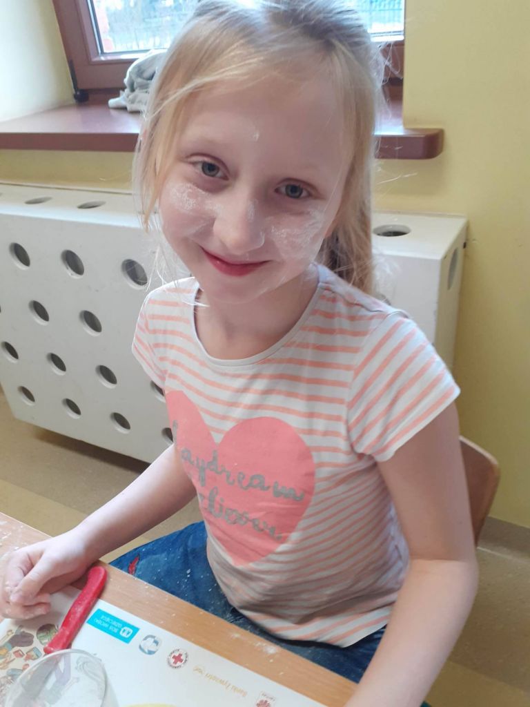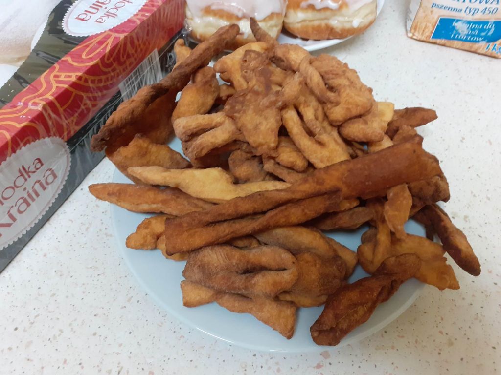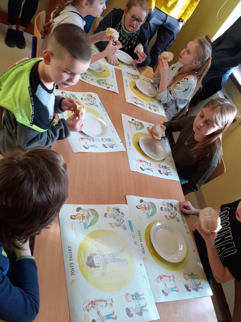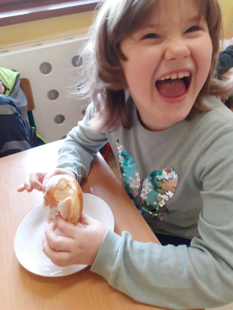 Ale było słodko! Pączki z lukrem i pudrem były głównymi bohaterami naszych dwóch konkurencji: najszybszego zjedzenia pączka i zjedzenia go bez oblizywania się. Ale było śmiechu i zabawy. Najedzeni pączkami zabraliśmy się za przygotowywanie faworków na nasz bal karnawałowy, który już jutro! U nas Tłusty Czwartek będzie trwał dwa dni. Lubimy sobie osładzać życie!