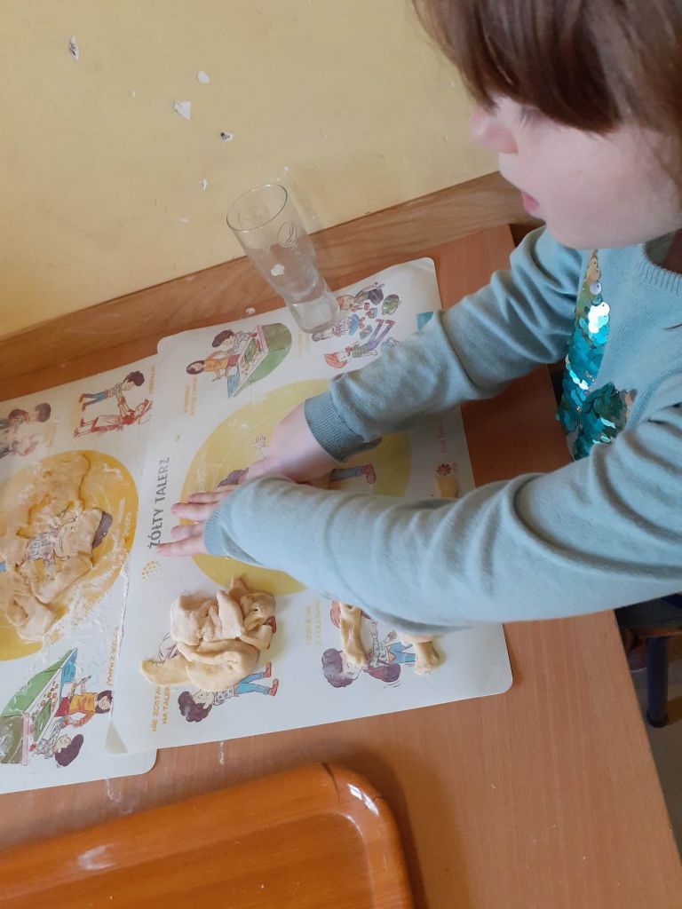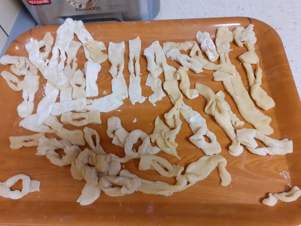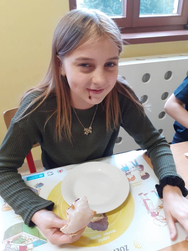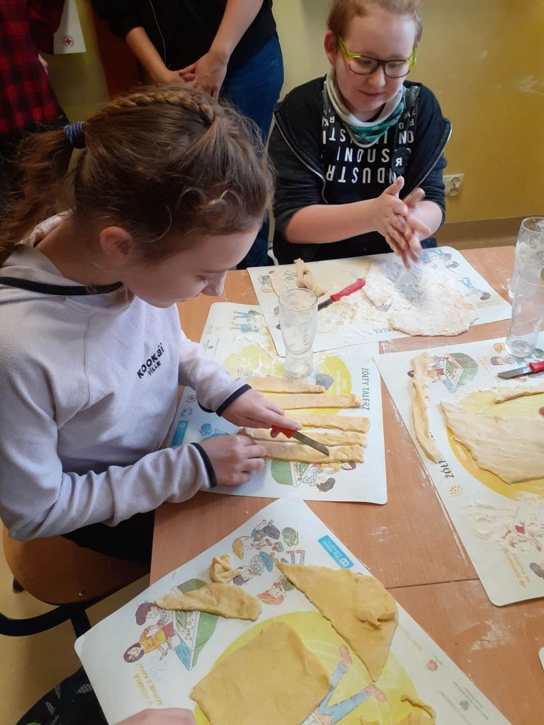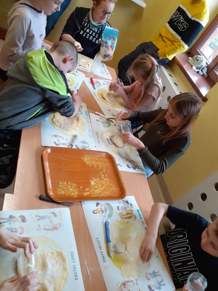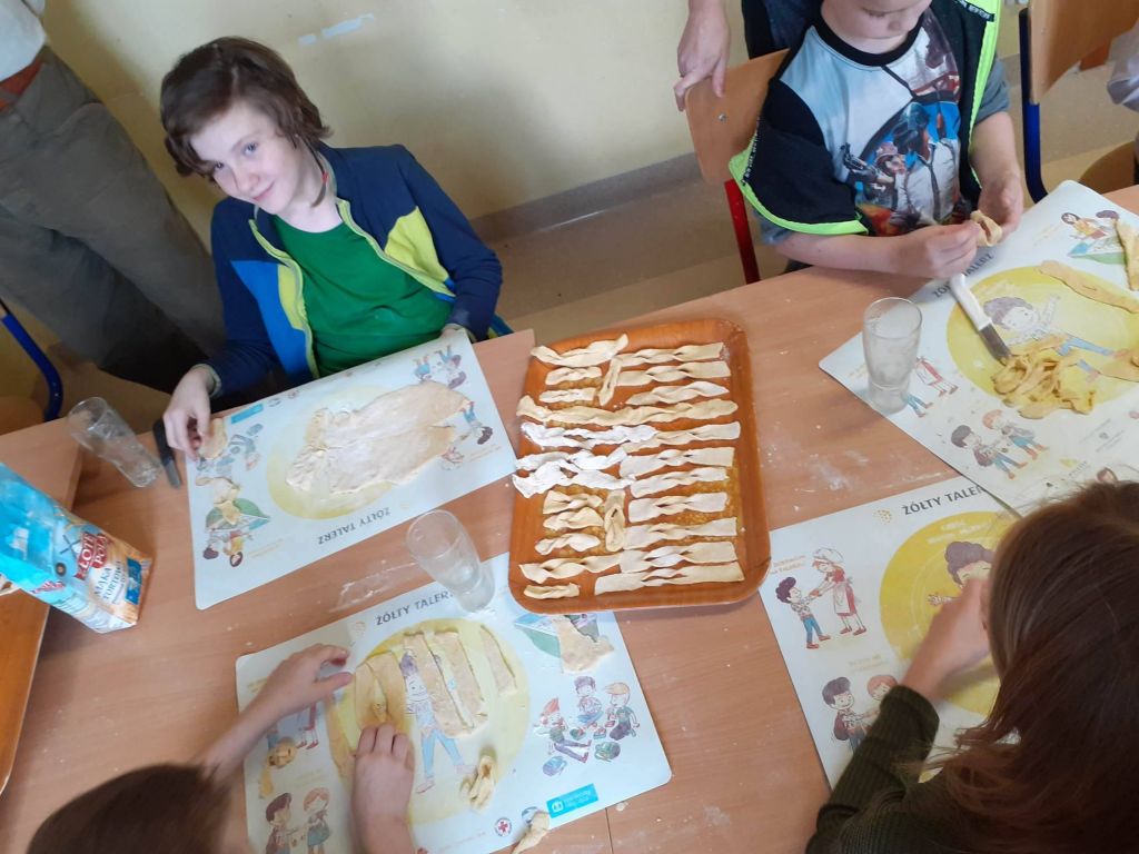Ale było słodko! Pączki z lukrem i pudrem były głównymi bohaterami naszych dwóch konkurencji: najszybszego zjedzenia pączka i zjedzenia go bez oblizywania się. Ale było śmiechu i zabawy. Najedzeni pączkami zabraliśmy się za przygotowywanie faworków na nasz bal karnawałowy, który już jutro! U nas Tłusty Czwartek będzie trwał dwa dni. Lubimy sobie osładzać życie!