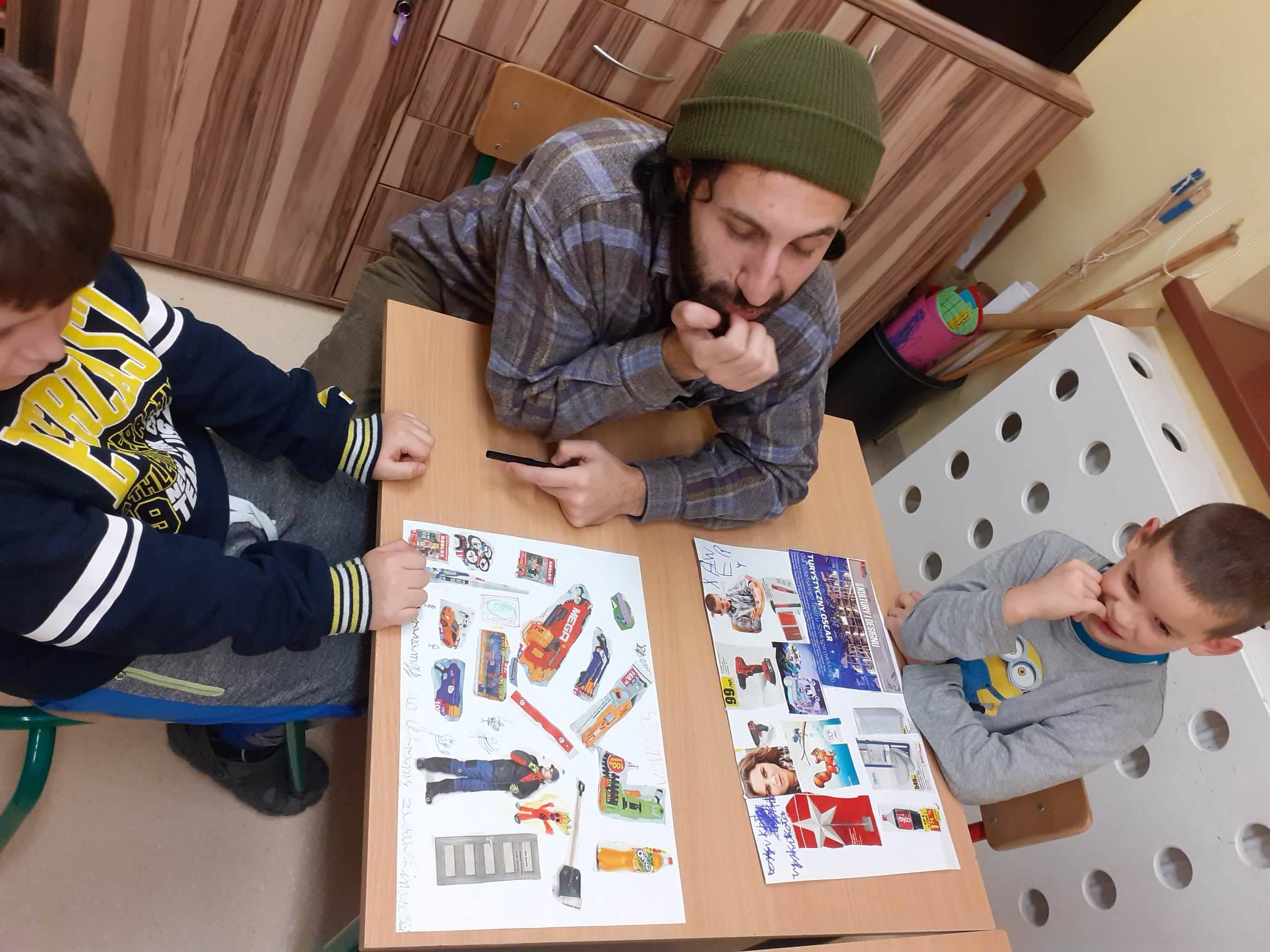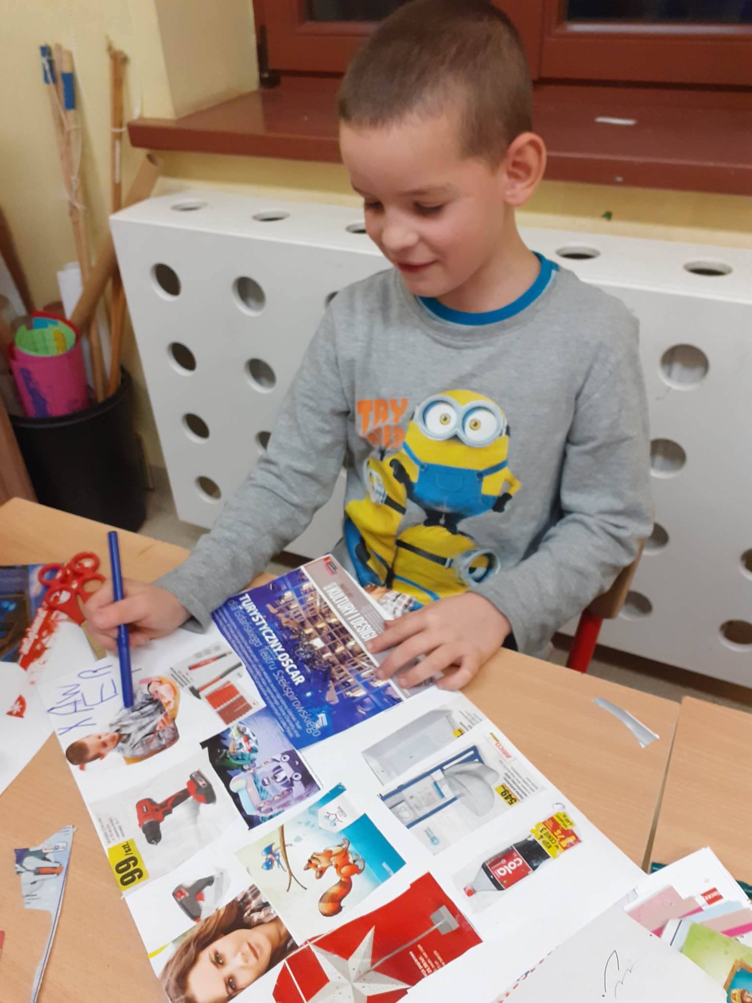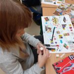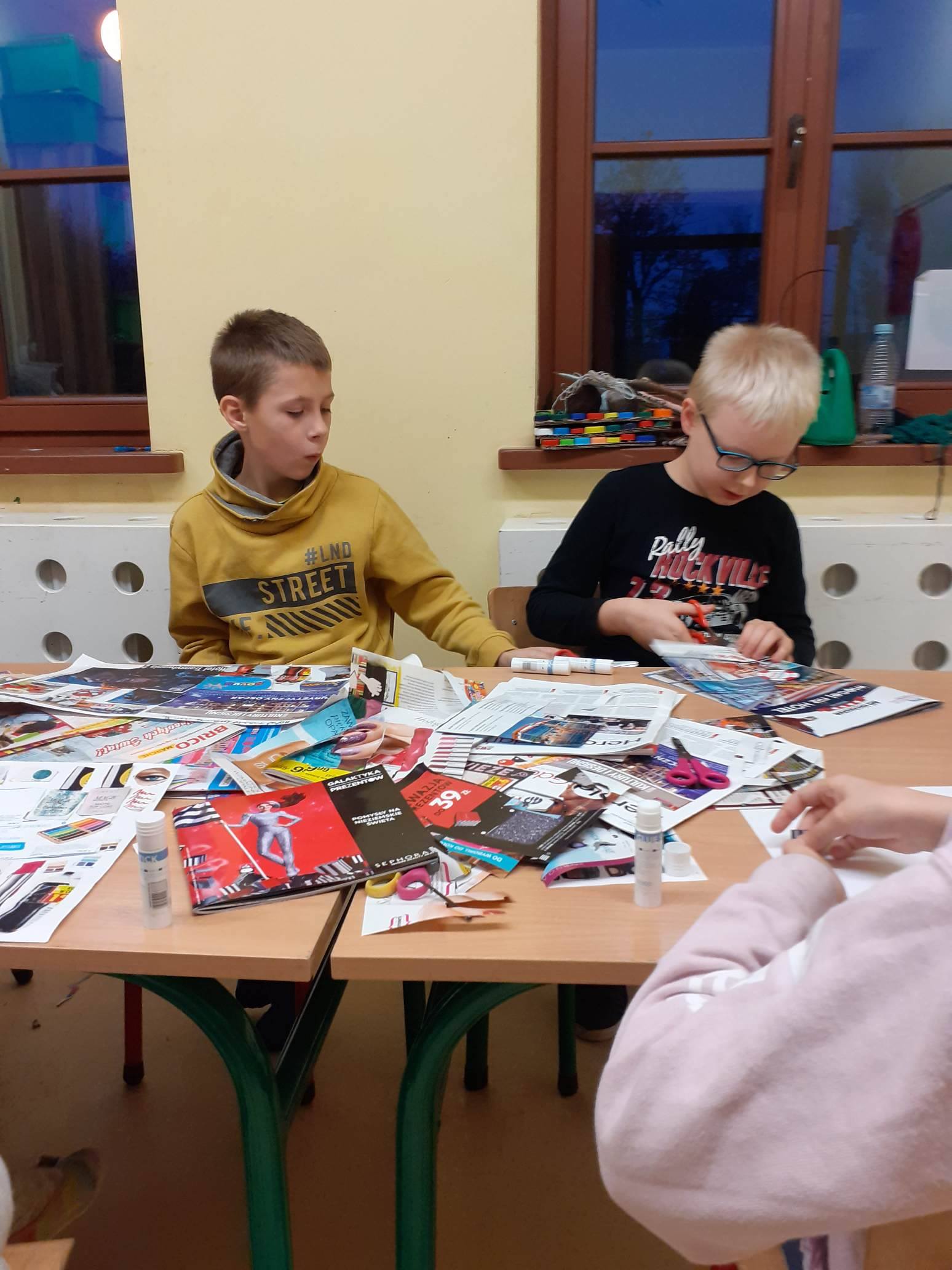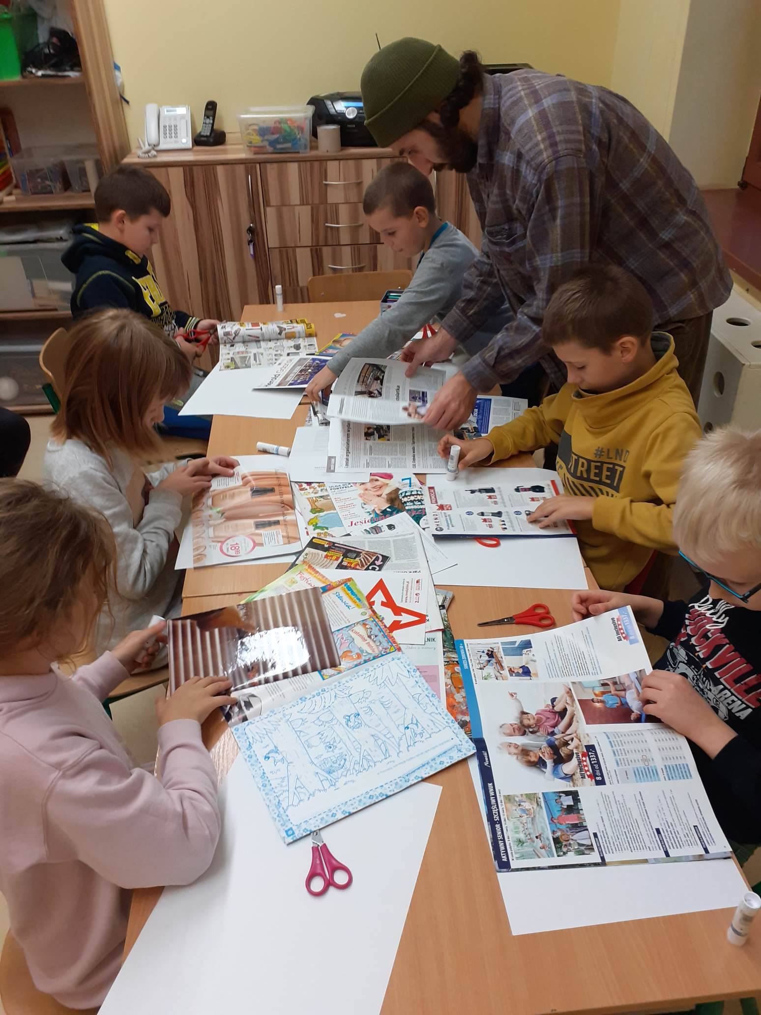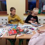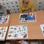 Przejrzeliśmy stare gazety i zastanawialiśmy się co można z nimi zrobić. Okazało się, że nasz wolontariusz Amo ma na nie pomysł – tworzyliśmy kolaże. Wycinaliśmy to, co spodobało nam się z całej sterty prasy i umieściliśmy na naszych kartkach-plakatach. Później zastanawialiśmy się co wpłynęło na taki, a nie inny, nasz wybór. Było ciekawie. Pewnie jeszcze nie raz wrócimy do tej techniki.