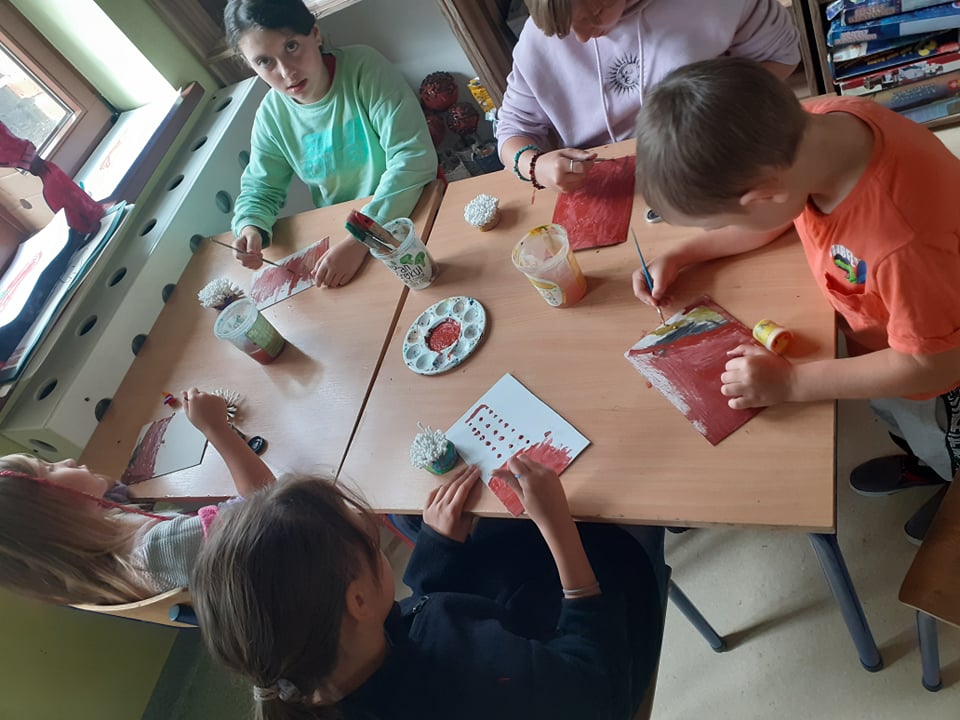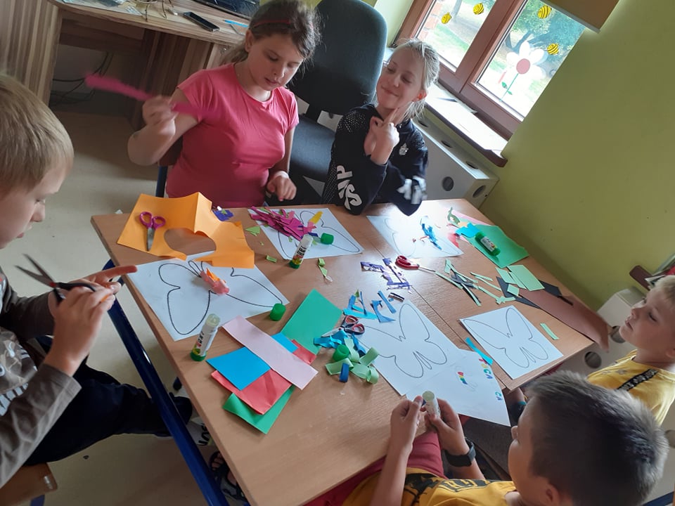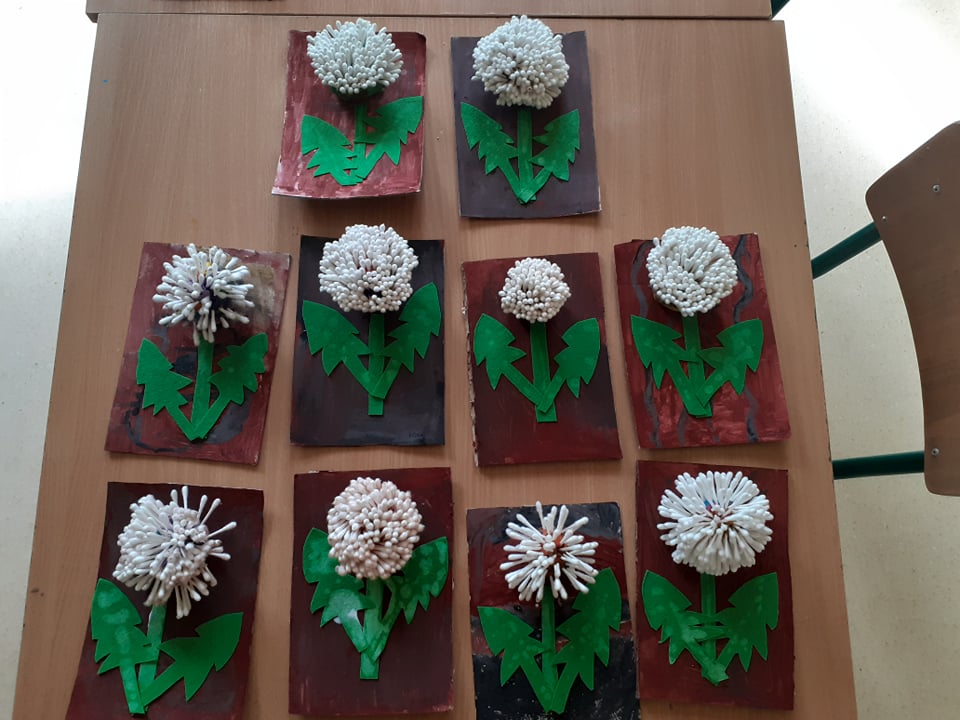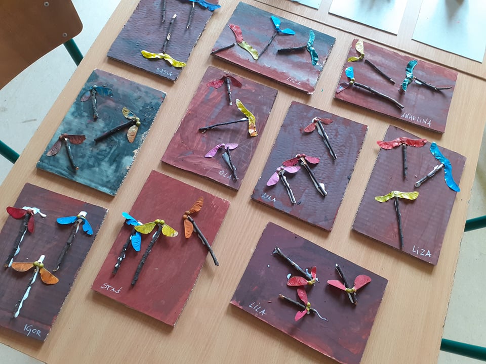 Podziałaliśmy również plastycznie – z patyczków higienicznych, plasteliny i filcu powstały dmuchawce, a z zebranych przez nas liści i patyczków – ważki, które wystarczyło pomalować farbą. Jako że uwielbiamy seanse filmowe, wybraliśmy się do kina na „Wyrolowanych” – historię o śmiesznych stworzonkach z dziurką zamiast brzuszka. Łudząco przypominały nam donaty!
