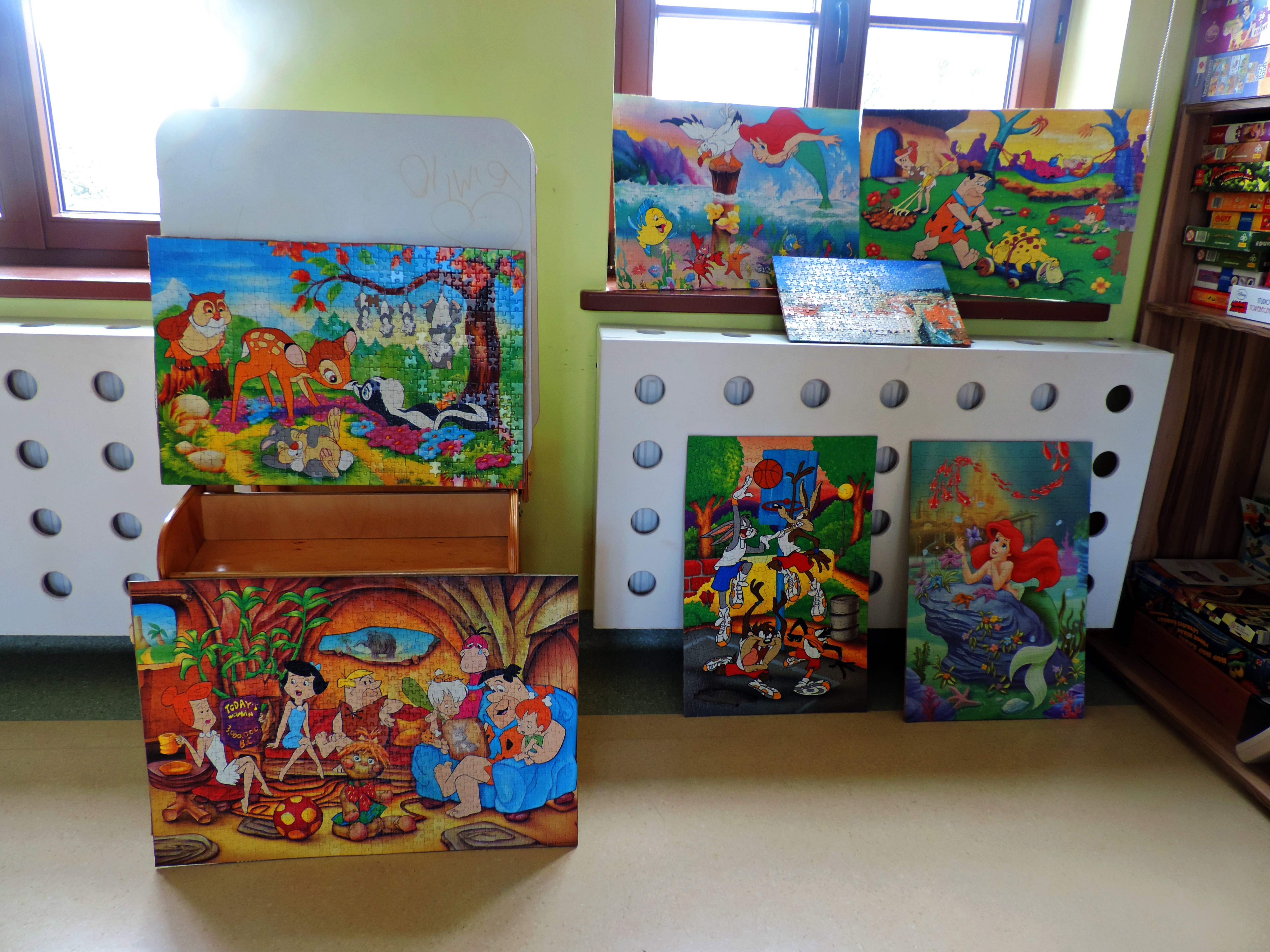W naszej świetlicy nie ma nudy. W tym tygodniu pogoda nas nie rozpieszczała, a deszcz nie pozwalał w pełni korzystać z placu zabaw. Nasze dzieci potrafią znaleźć sobie zajęcie w każdych warunkach. Tym razem padło na puzzle. Przy pomocy wychowawców powstało kilka bajkowych obrazów, które upiększą naszą bawialnię.