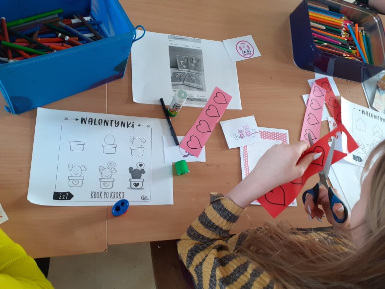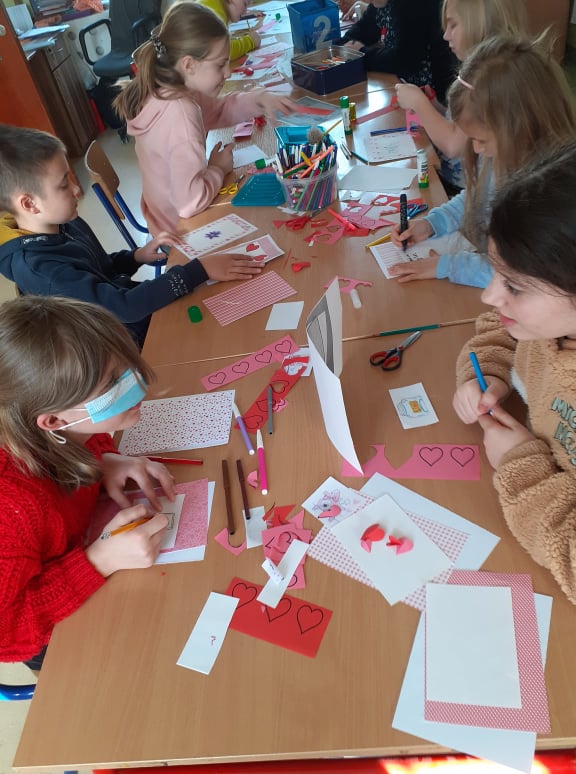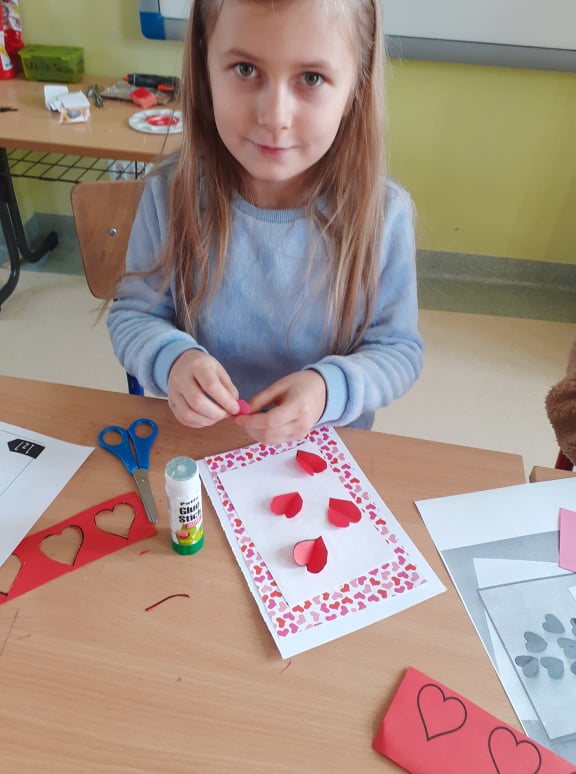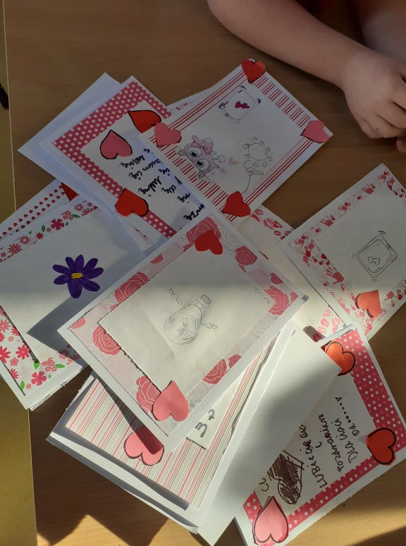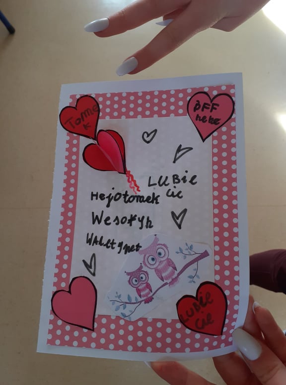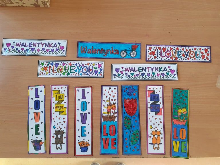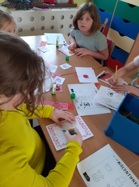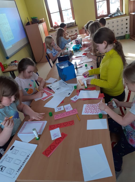 Początek ferii zimowych najlepszy z możliwych, bo w Walentynki, czyli w otoczeniu czerwono-różowych serduszek, wśród uśmiechów, miłych słów i gestów. Mieliśmy naszą walentynkową pocztę – każdy znalazł swoją walentynkę czy przyjaciela od serca. Powstały piękne kartki, zakładki do książek i kolorowanki serc. Były też upominki niespodzianki, które dzieci otrzymały na koniec dnia.