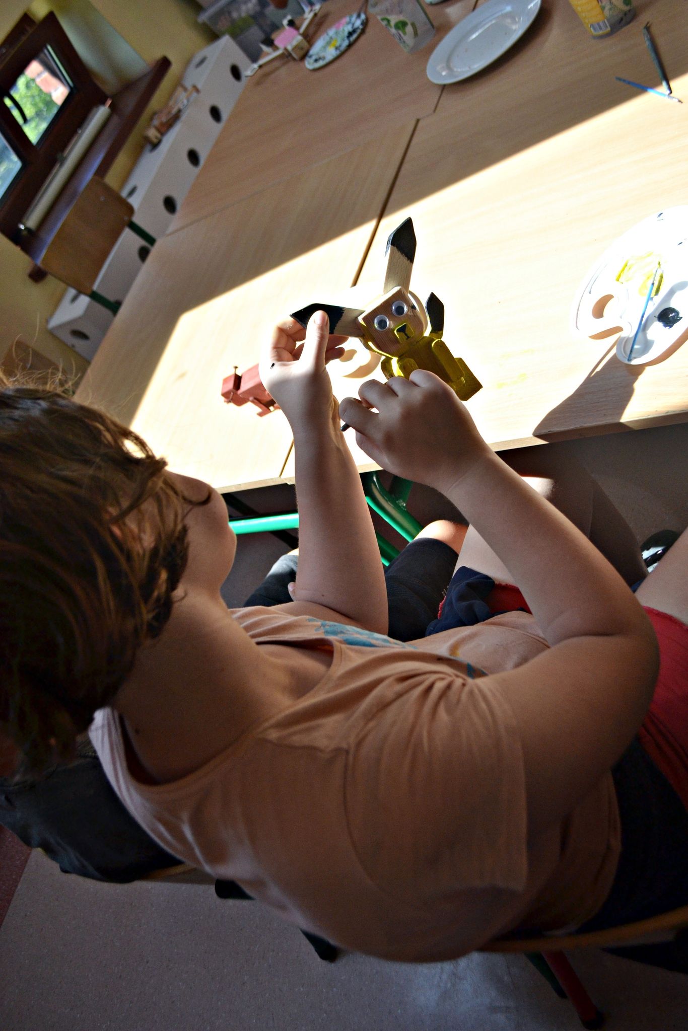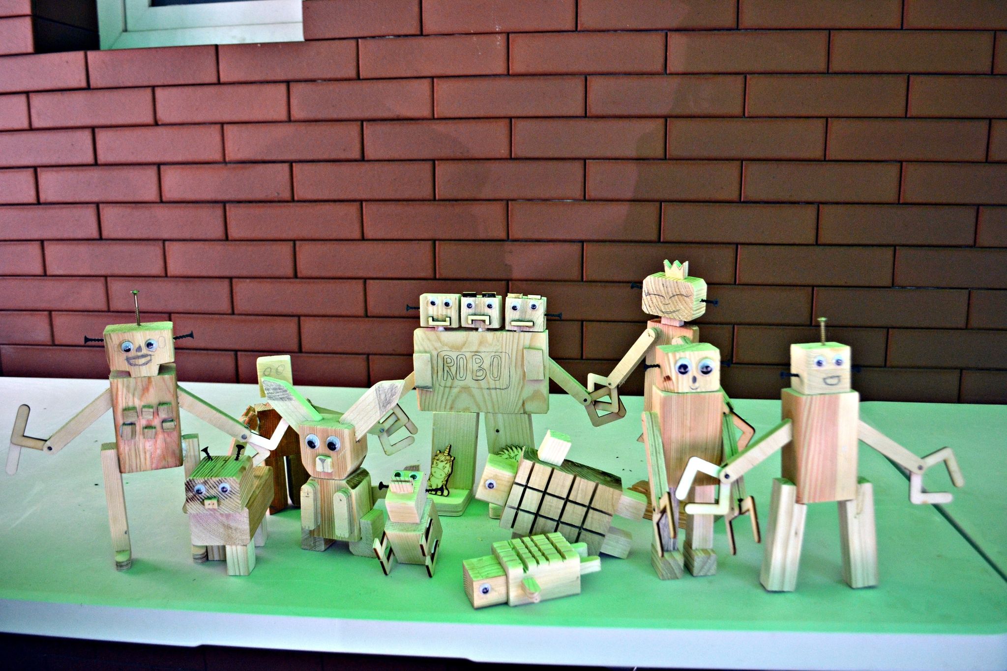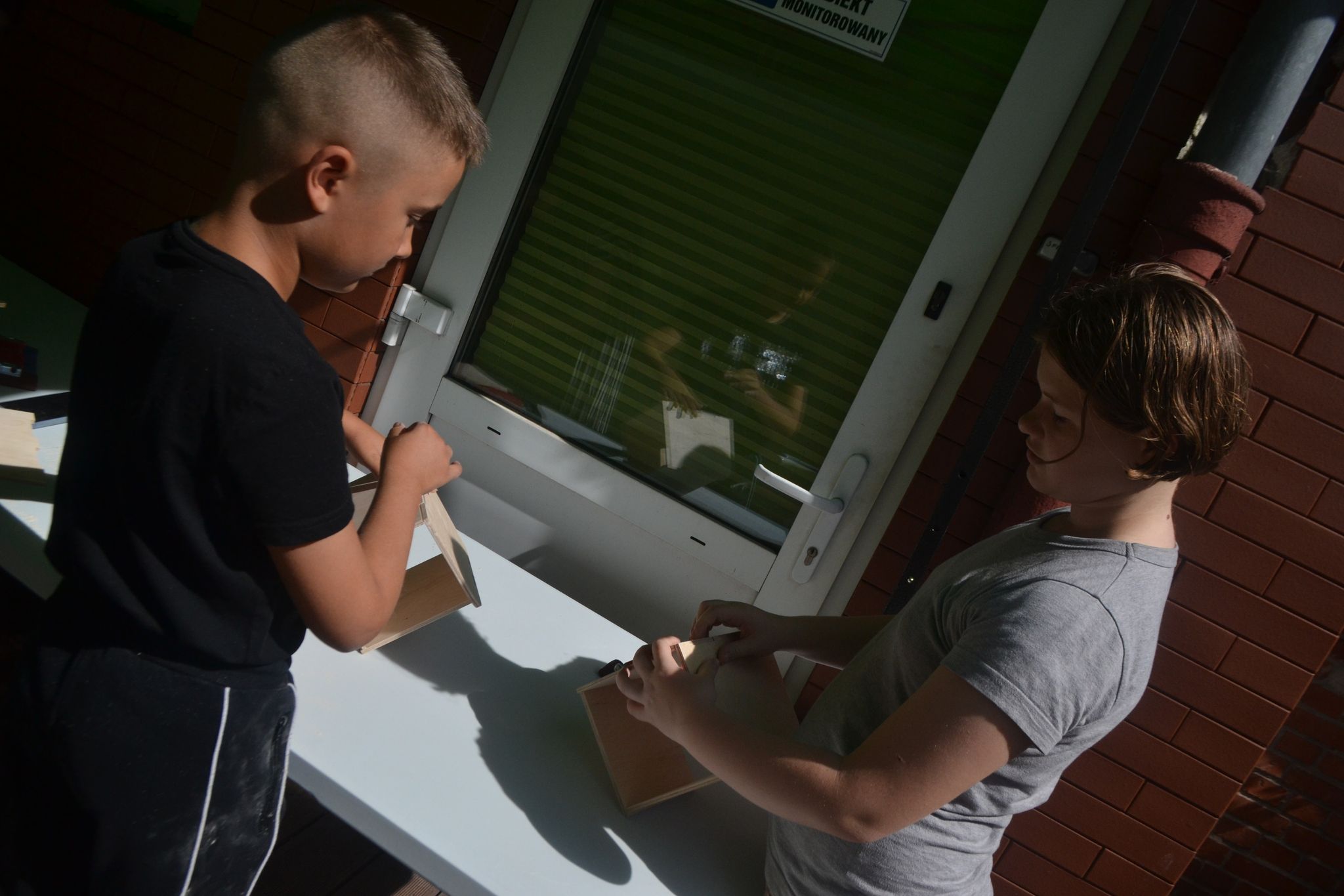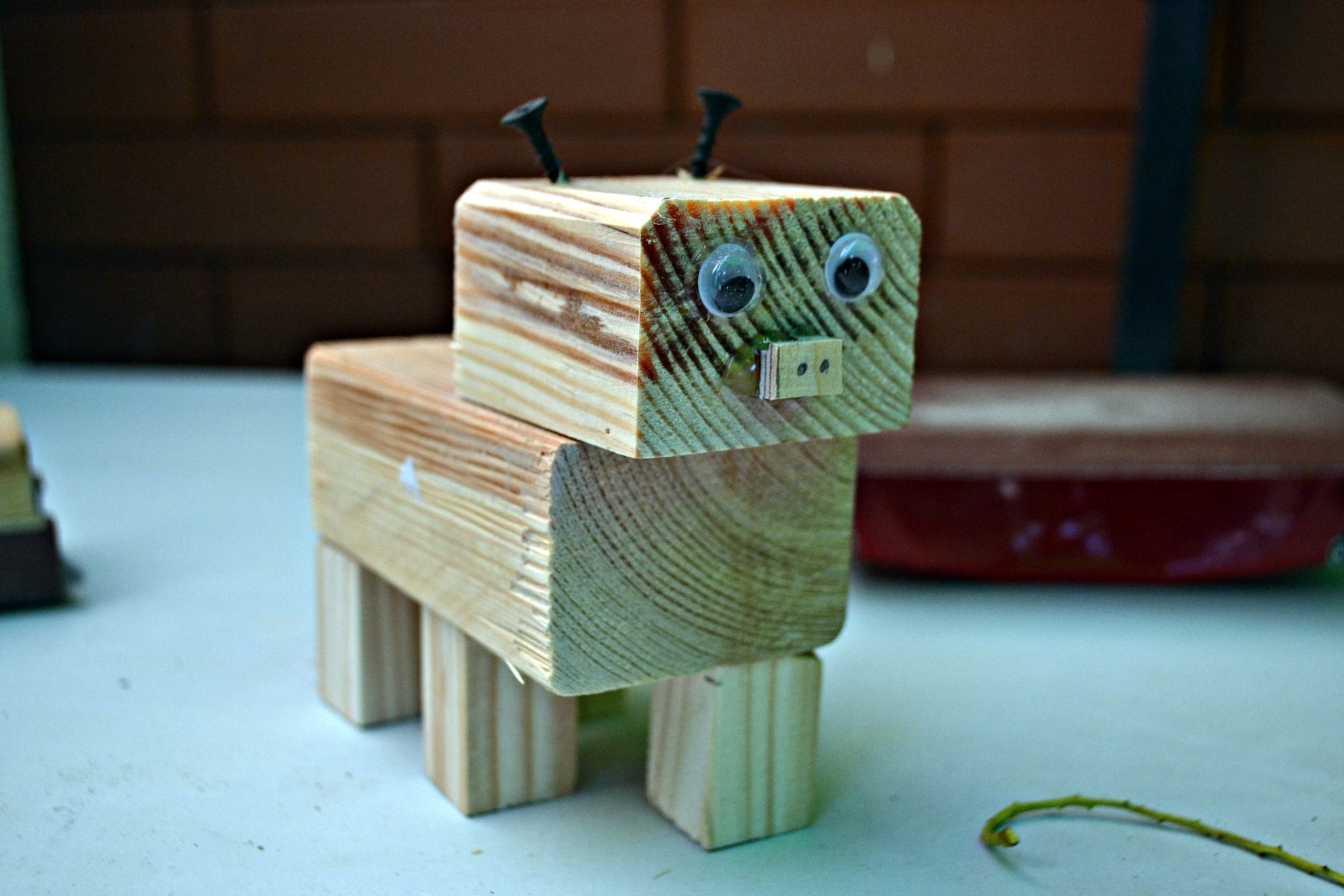 Robociki, które ostatecznie stały się również innymi stworzonkami, kosztowały nas najwięcej pracy. Wybór odpowiednich kawałków drewna, szlifowanie ich, przycinanie, sklejanie, a następnie wybór elementów dekoracyjnych jak oczy czy uszy i antenki ze śrubek. W świetlicy postanowiliśmy jeszcze nadać im barw. Wyszło bardzo oryginalnie!