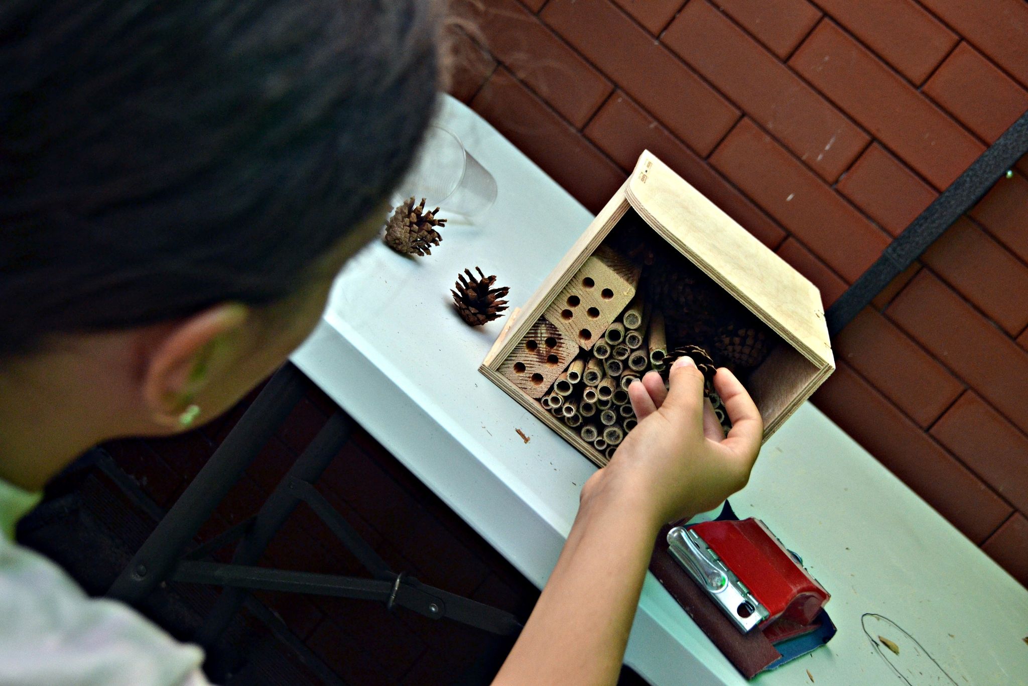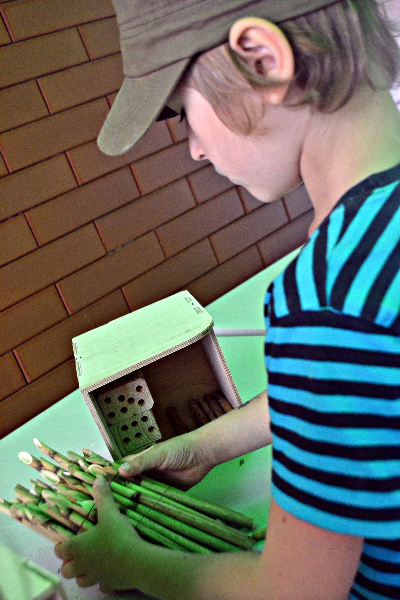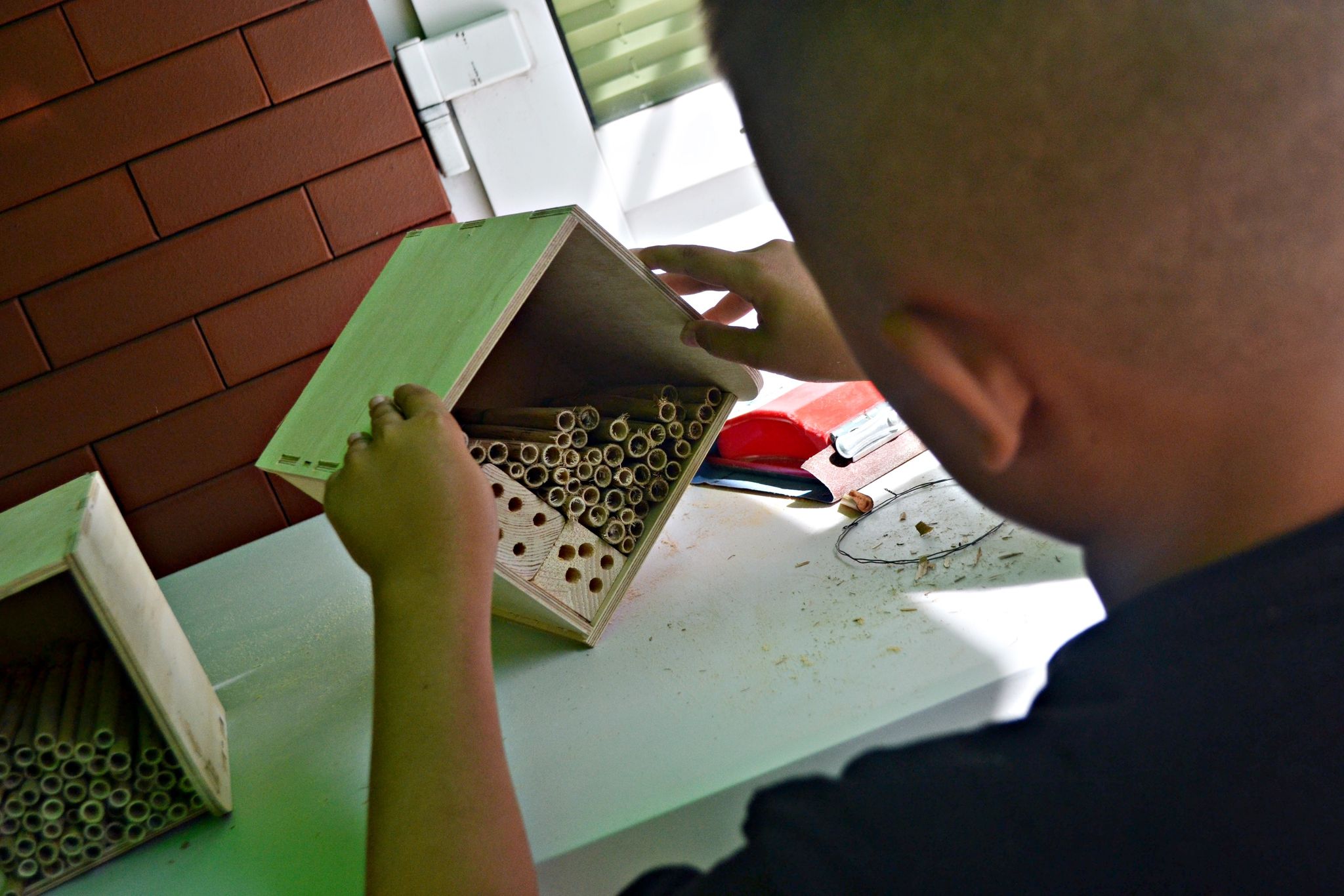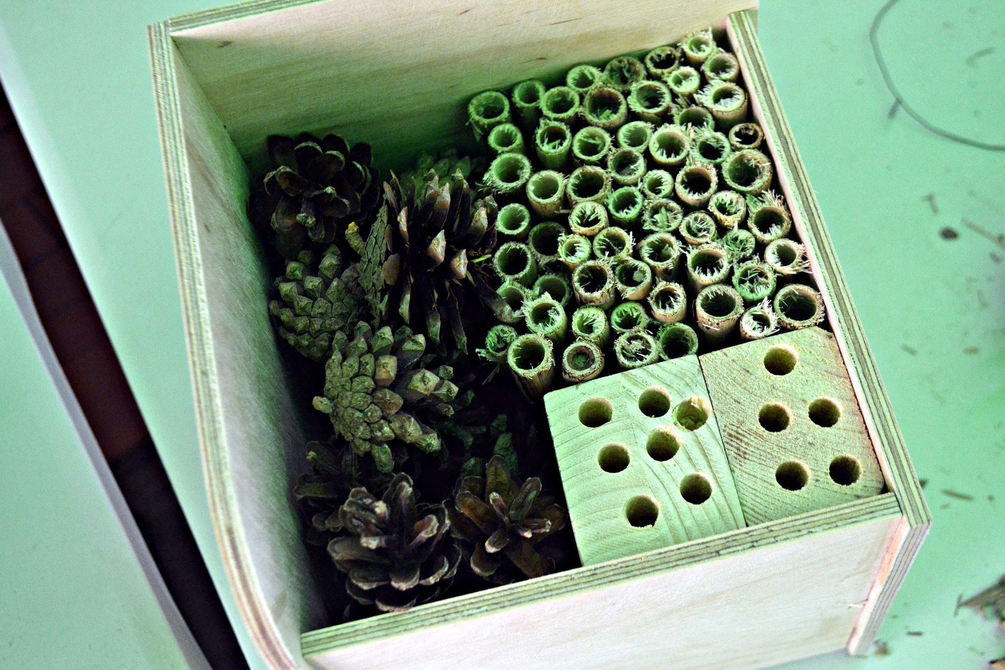 Domki dla owadów trzeba było złożyć, wypełnić trzciną, drewnem i szyszkami. Wszystko zamknąć drucianą siatką i pszczółki murarki mogą już z nich korzystać.