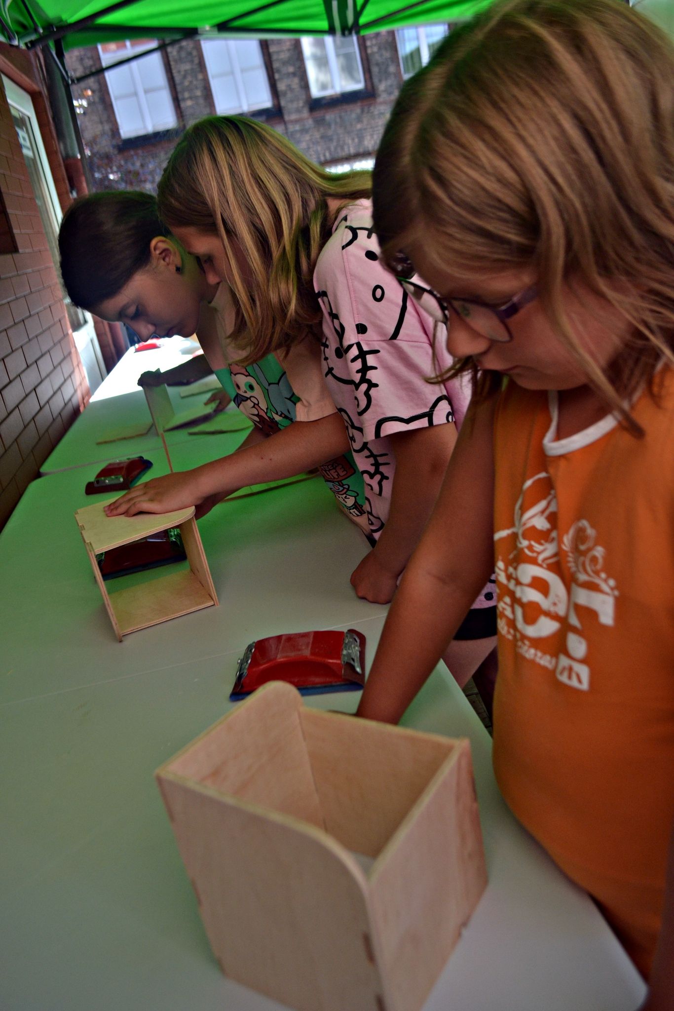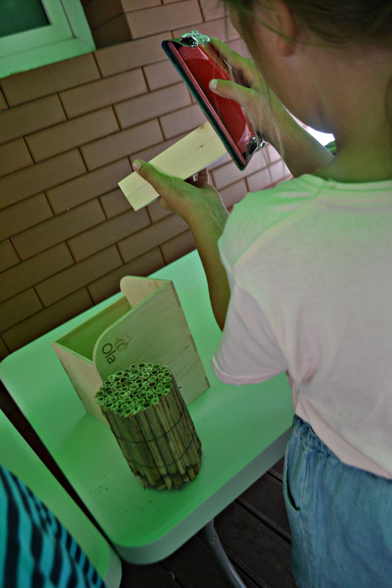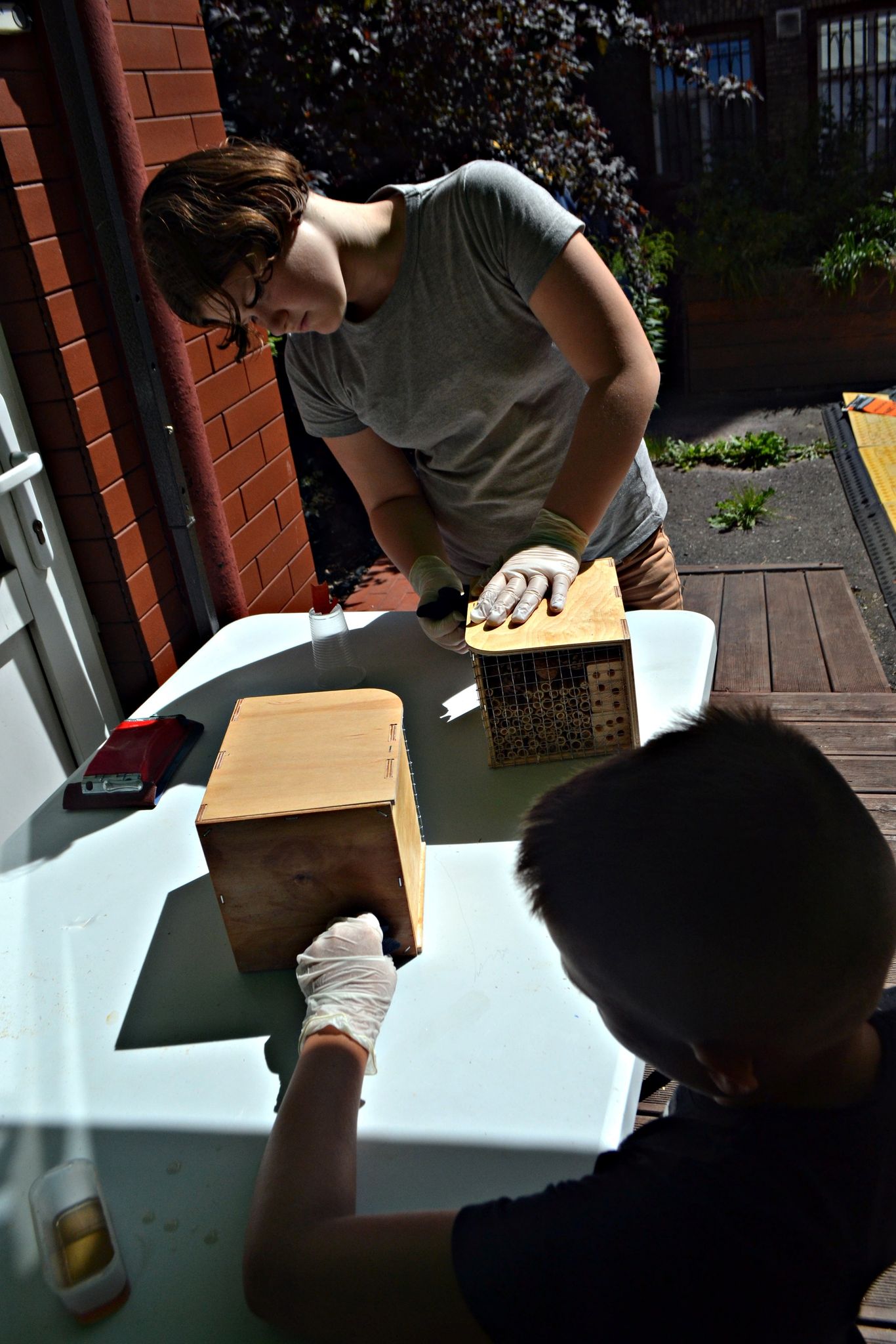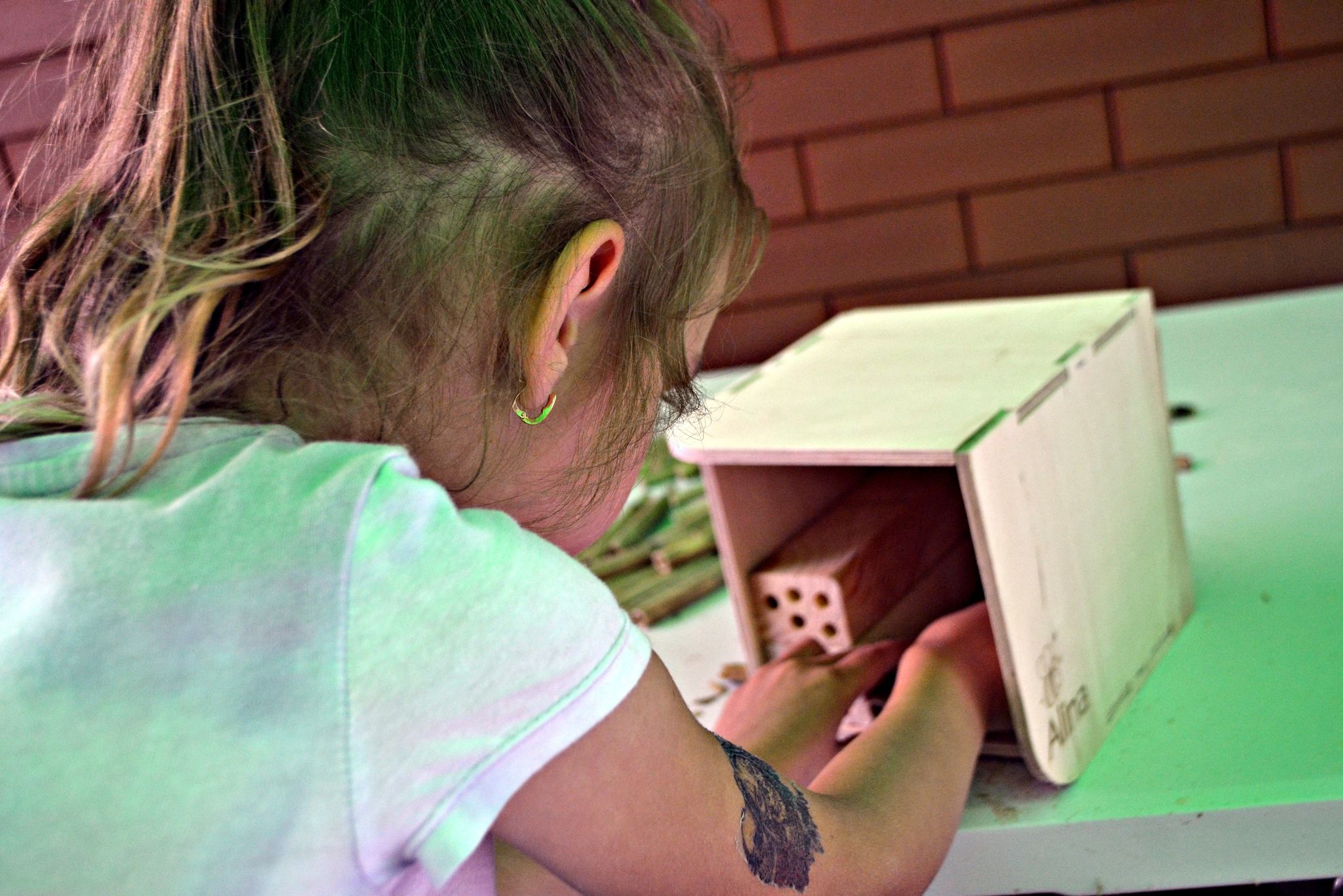 Domki dla owadów trzeba było złożyć, wypełnić trzciną, drewnem i szyszkami. Wszystko zamknąć drucianą siatką i pszczółki murarki mogą już z nich korzystać.