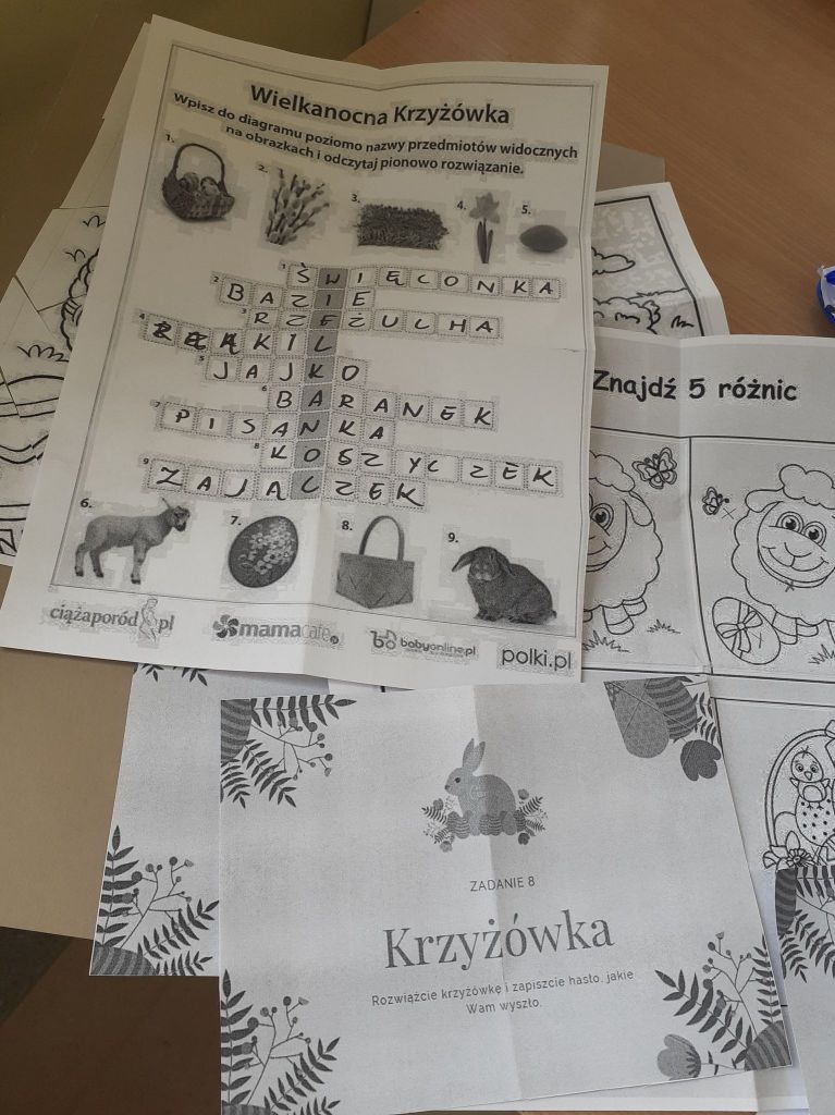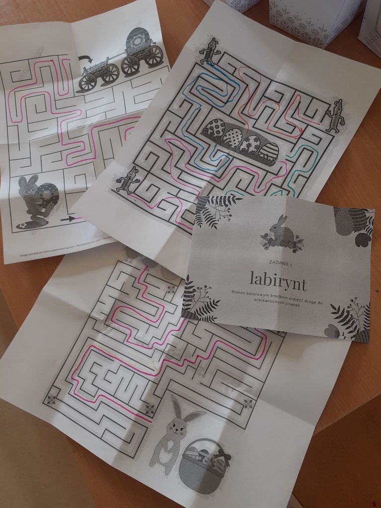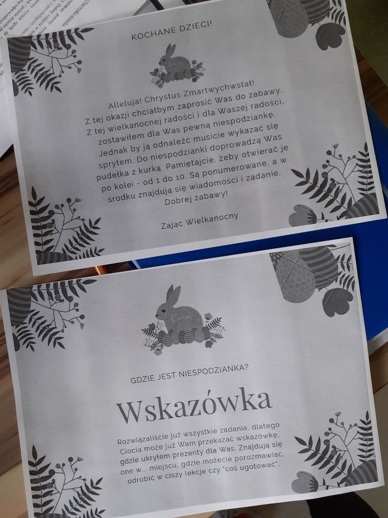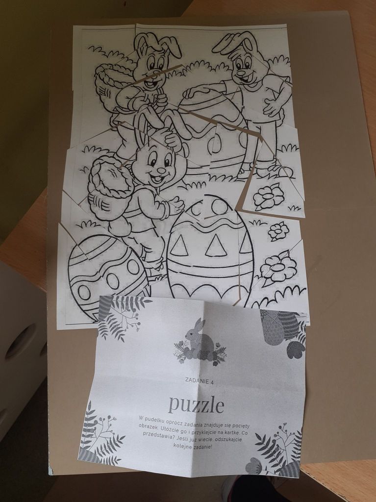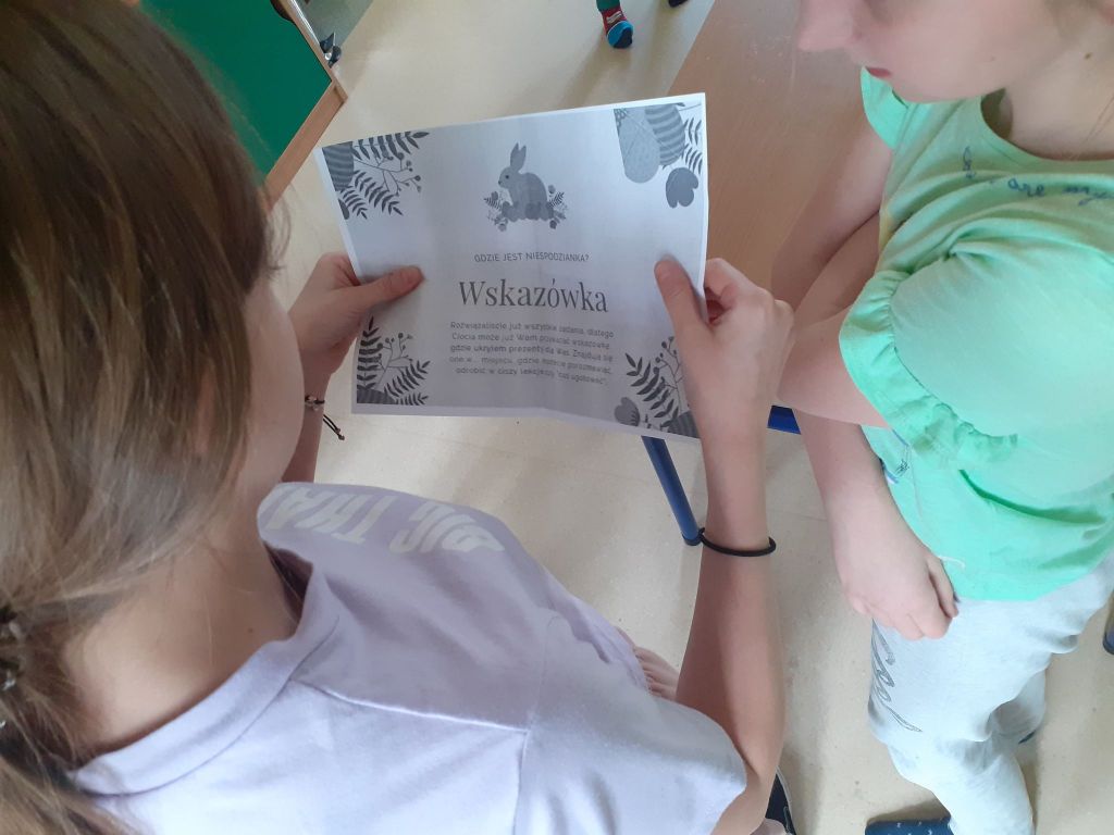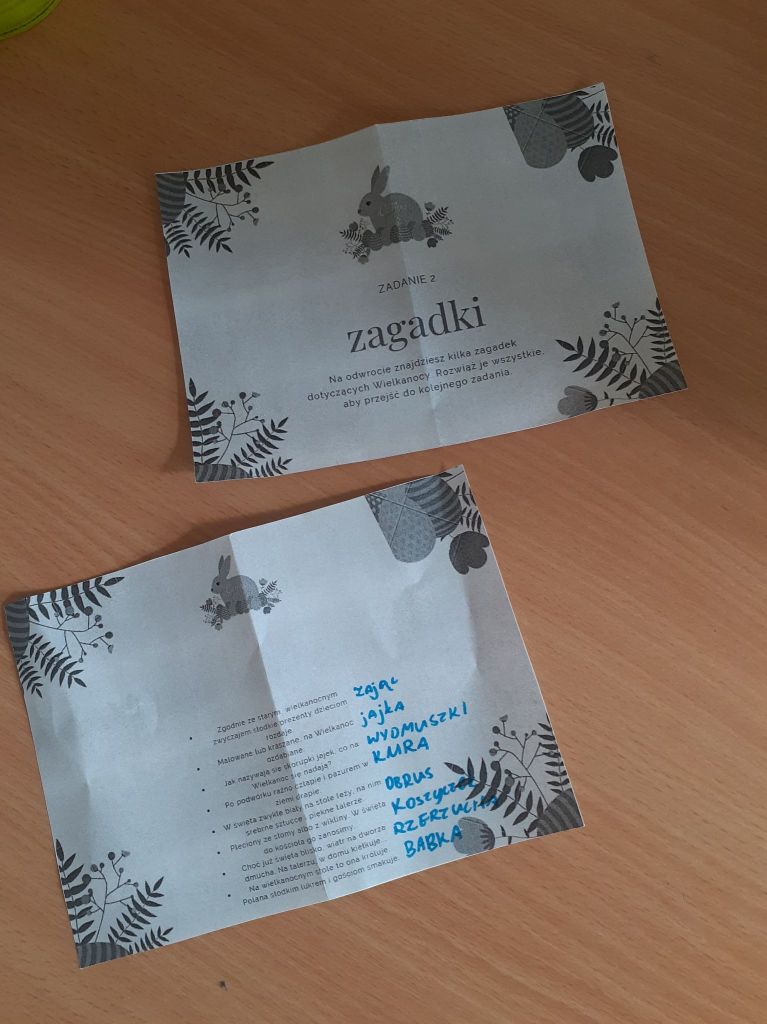 Wielkanocny zając zostawił dla nas list i miłą niespodziankę. Okazało się, że aby do niej dotrzeć musimy najpierw odnaleźć 10 domków ze wskazówkami i zadaniami do wykonania. To było nie lada wyzwanie. W mig znaleźliśmy wszystkie domki i zabraliśmy się za ćwiczenia znajdujące się wewnątrz nich. Były to krzyżówki, szyfrowane wiadomości, puzzle, kolorowanka XXL, zagadki, taniec i inne. Wspólnymi siłami rozwiązaliśmy je wszystkie i dzięki temu ciocia mogła przekazać wskazówkę od Zająca dotyczącą miejsca ukrycia upominków. Okazało się, że czekały na nas słodkie, czekoladowe jajeczka i mini puzzle w koszyczkach w kształcie zajączków. To była bardzo miła niespodzianka!