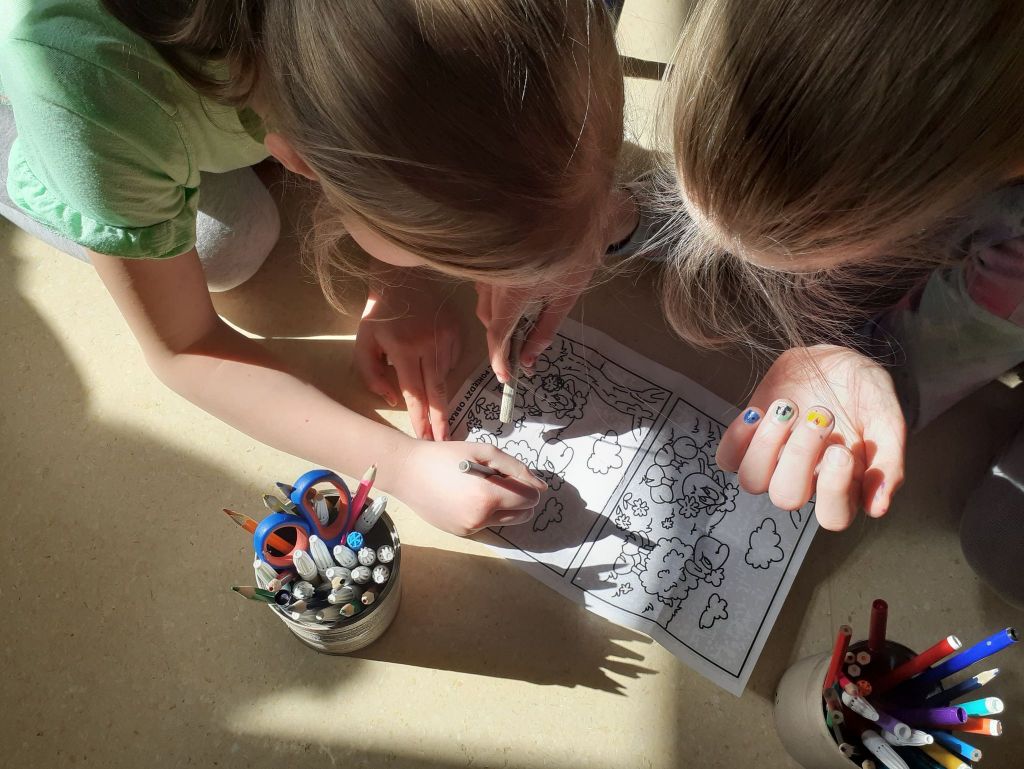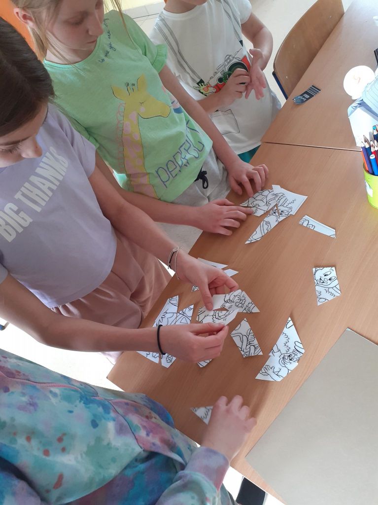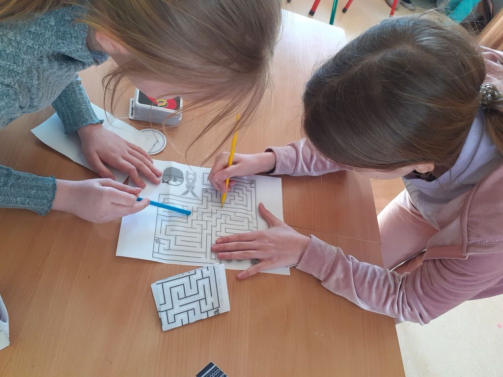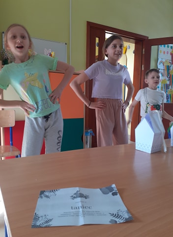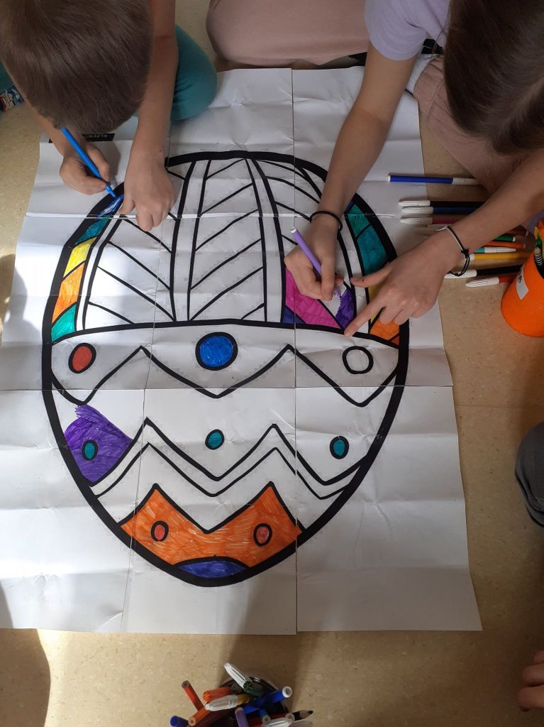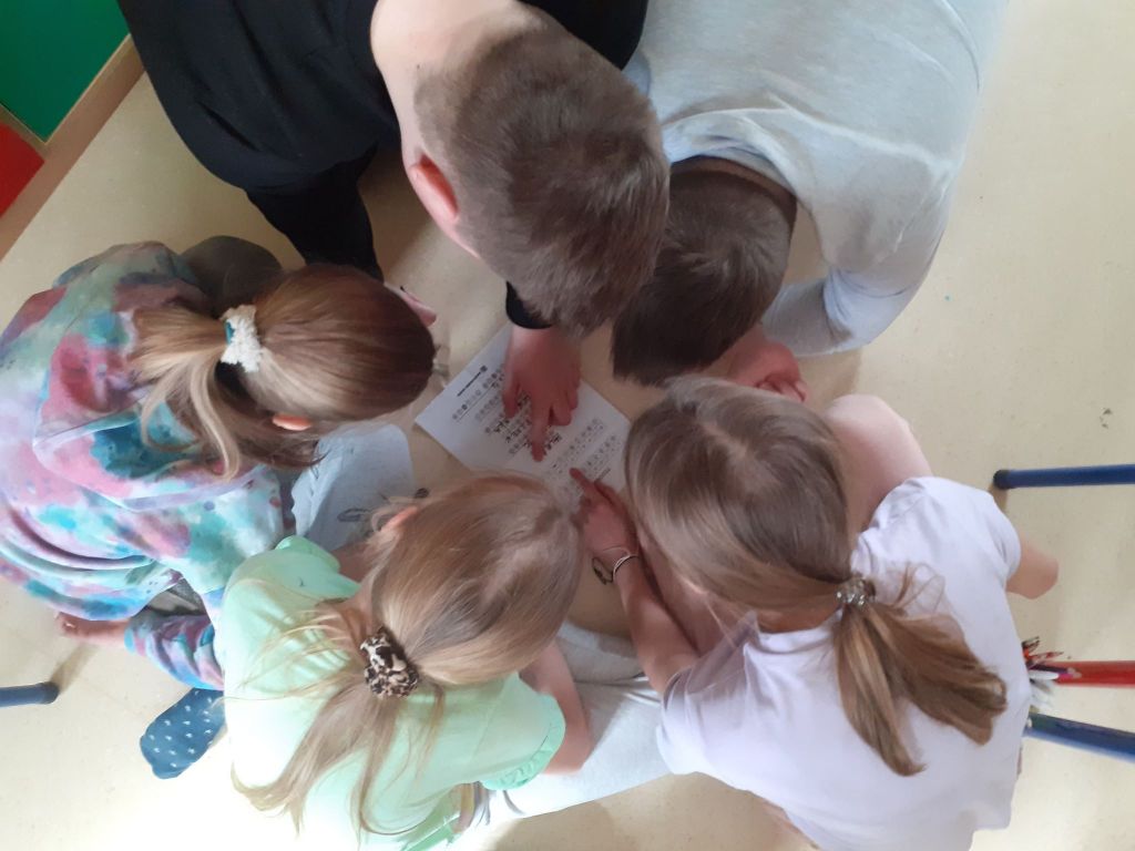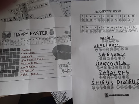 Wielkanocny zając zostawił dla nas list i miłą niespodziankę. Okazało się, że aby do niej dotrzeć musimy najpierw odnaleźć 10 domków ze wskazówkami i zadaniami do wykonania. To było nie lada wyzwanie. W mig znaleźliśmy wszystkie domki i zabraliśmy się za ćwiczenia znajdujące się wewnątrz nich. Były to krzyżówki, szyfrowane wiadomości, puzzle, kolorowanka XXL, zagadki, taniec i inne. Wspólnymi siłami rozwiązaliśmy je wszystkie i dzięki temu ciocia mogła przekazać wskazówkę od Zająca dotyczącą miejsca ukrycia upominków. Okazało się, że czekały na nas słodkie, czekoladowe jajeczka i mini puzzle w koszyczkach w kształcie zajączków. To była bardzo miła niespodzianka!