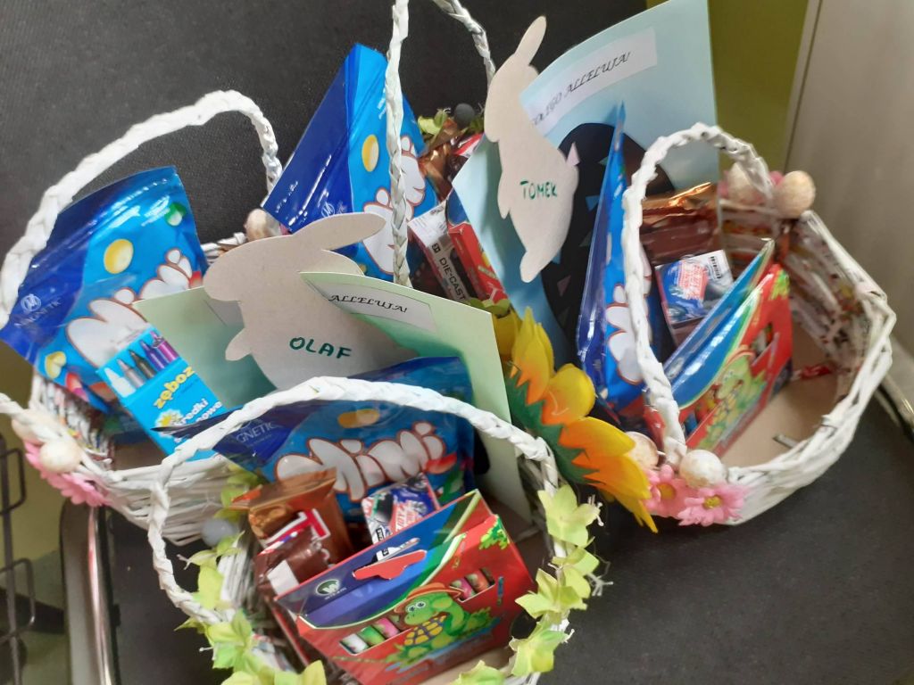Święta już za pasem, więc aby umilić ten czas dzieciom, odwiedziliśmy ich w domach z małymi upominkami od zajączka wielkanocnego. Znalazło się coś słodkiego, coś praktycznego, coś do zabawy. Każdy otrzymał również pakiet edukacyjny zawierający karty pracy, kolorowanki czy elementy potrzebne do wykonania kartki świątecznej. Nie zapomnieliśmy o nikim, bo i rodzice naszych podopiecznych zostali obdarowani małymi niespodziankami, na osłodę najbliższych dni.