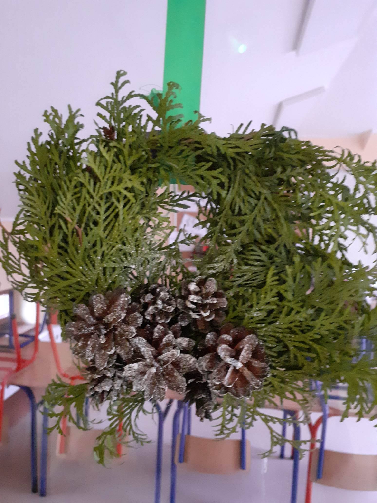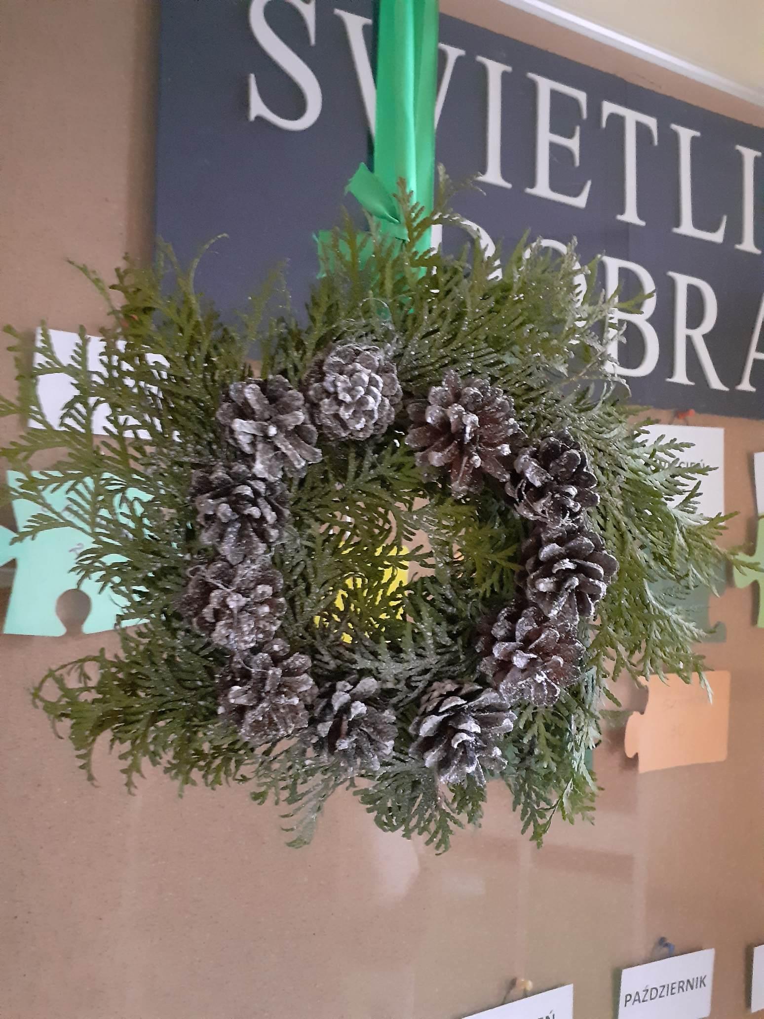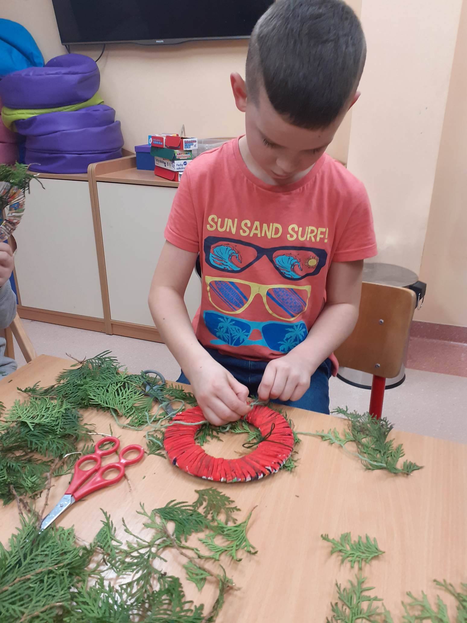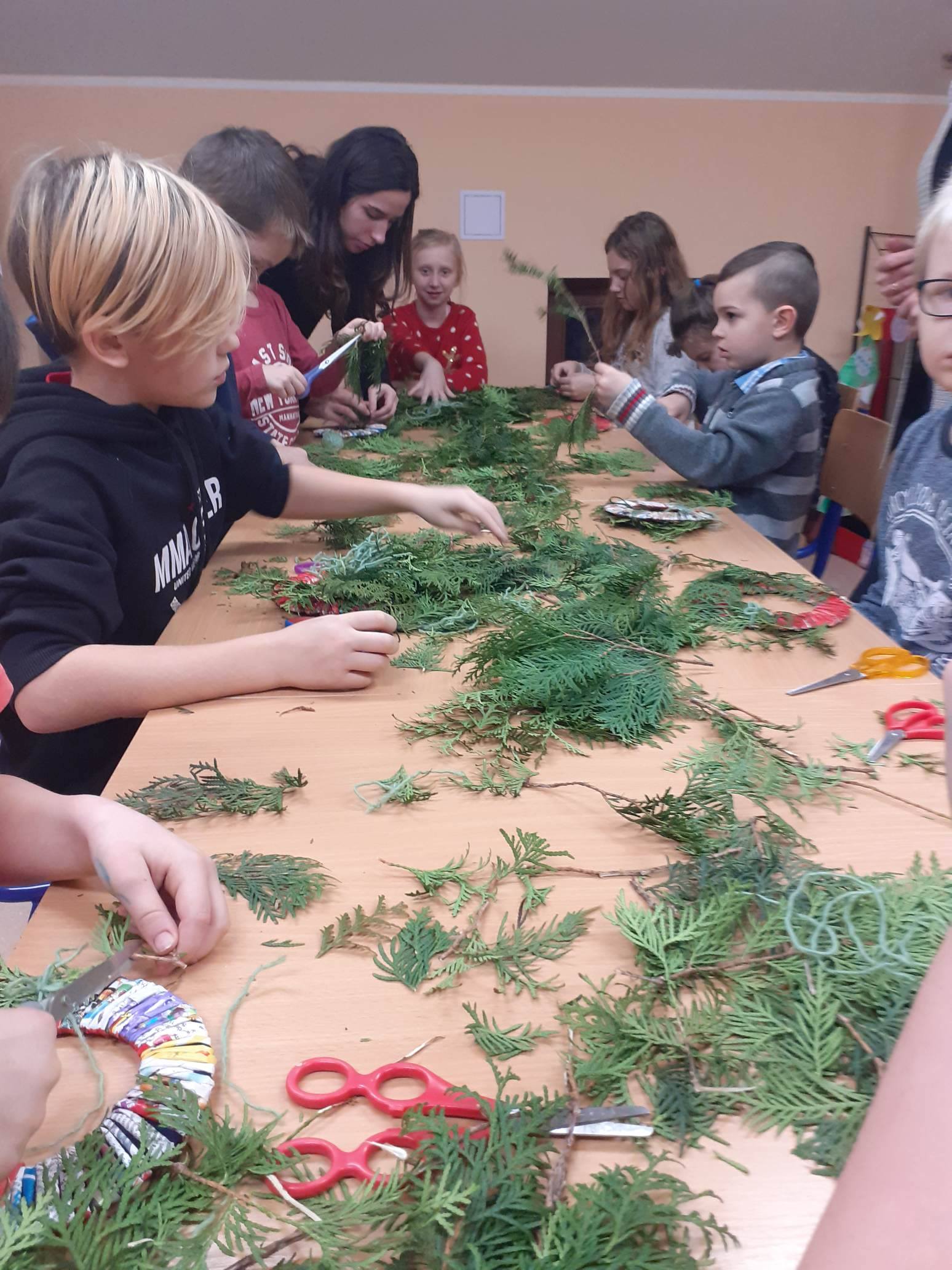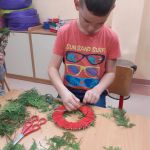 Aby nasza świetlica powoli nabierała bożonarodzeniowego charakteru, przygotowaliśmy wieńce świąteczne. Prawie wszystko z darów natury i recyclingu – okręgi zrobione z papierowej wikliny, a ozdobione darami natury (szyszki, żołędzie, zielone gałązki). Użyliśmy też ozdób, które teoretycznie nie były nam w domu potrzebne, a zyskały drugie życie dzięki umieszczeniu ich na naszych wieńcach. W takiej nowej postaci zabraliśmy je do domu, a placówkę ozdobiły pozostałe.