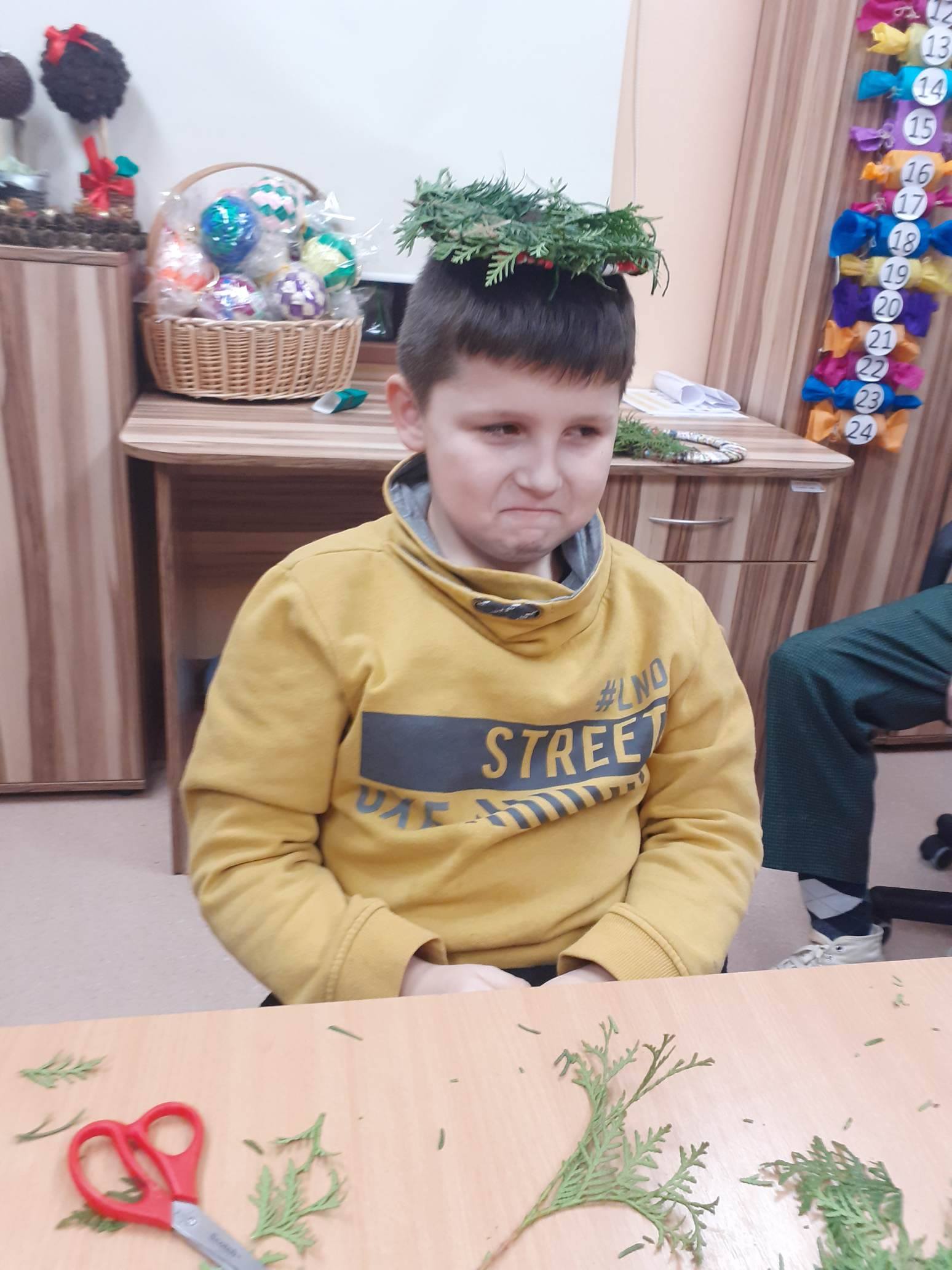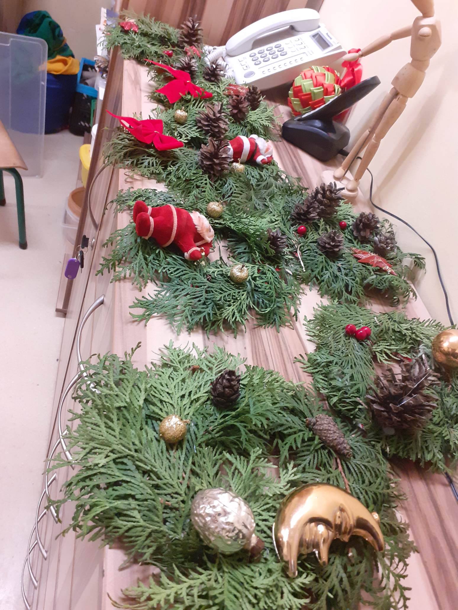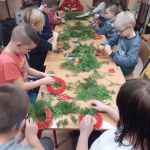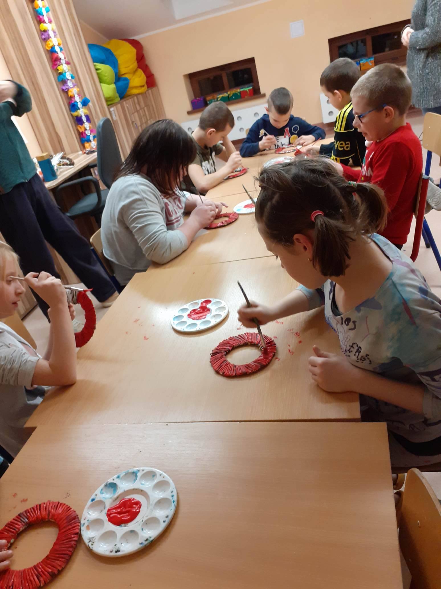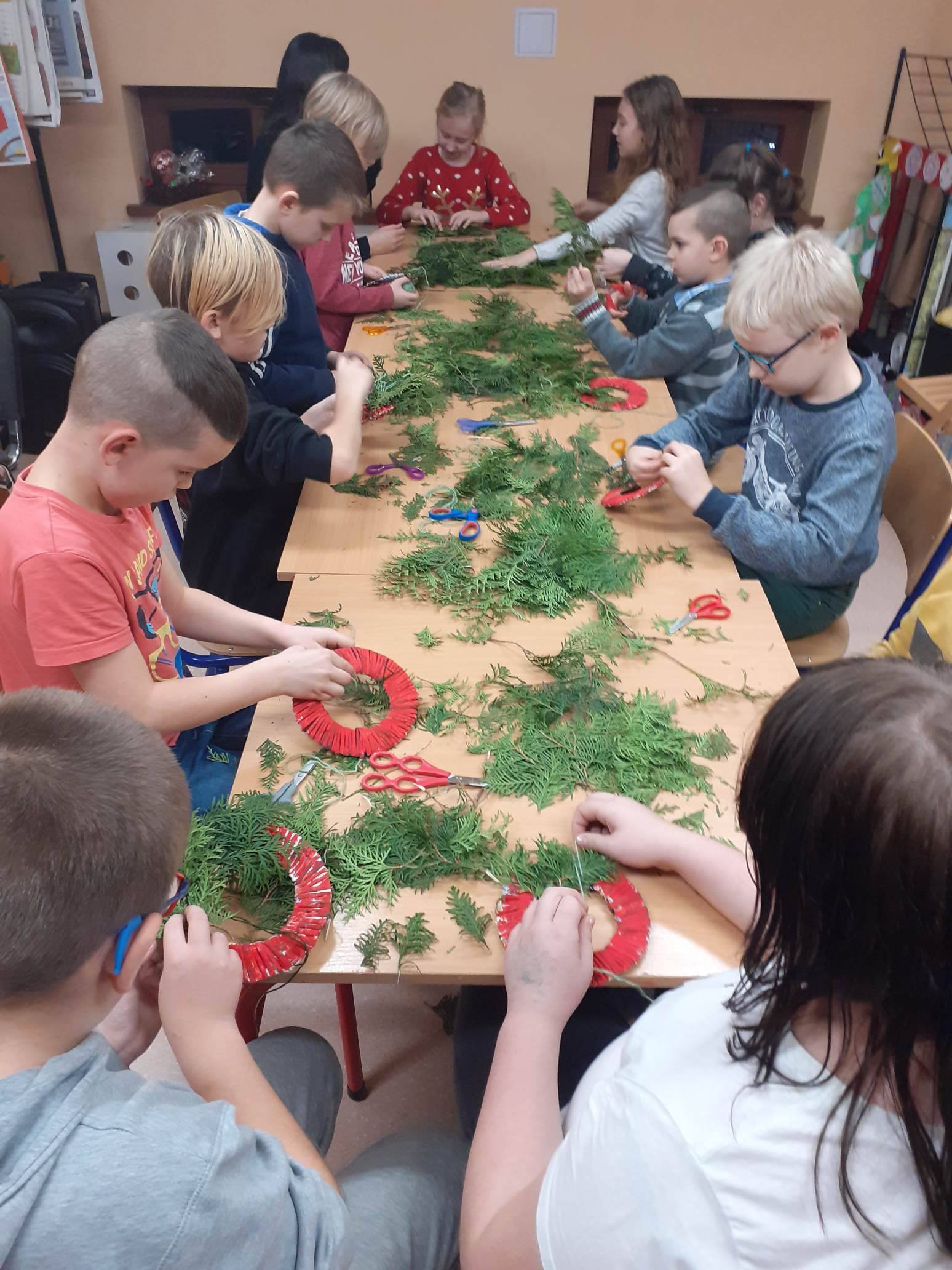 Aby nasza świetlica powoli nabierała bożonarodzeniowego charakteru, przygotowaliśmy wieńce świąteczne. Prawie wszystko z darów natury i recyclingu – okręgi zrobione z papierowej wikliny, a ozdobione darami natury (szyszki, żołędzie, zielone gałązki). Użyliśmy też ozdób, które teoretycznie nie były nam w domu potrzebne, a zyskały drugie życie dzięki umieszczeniu ich na naszych wieńcach. W takiej nowej postaci zabraliśmy je do domu, a placówkę ozdobiły pozostałe.