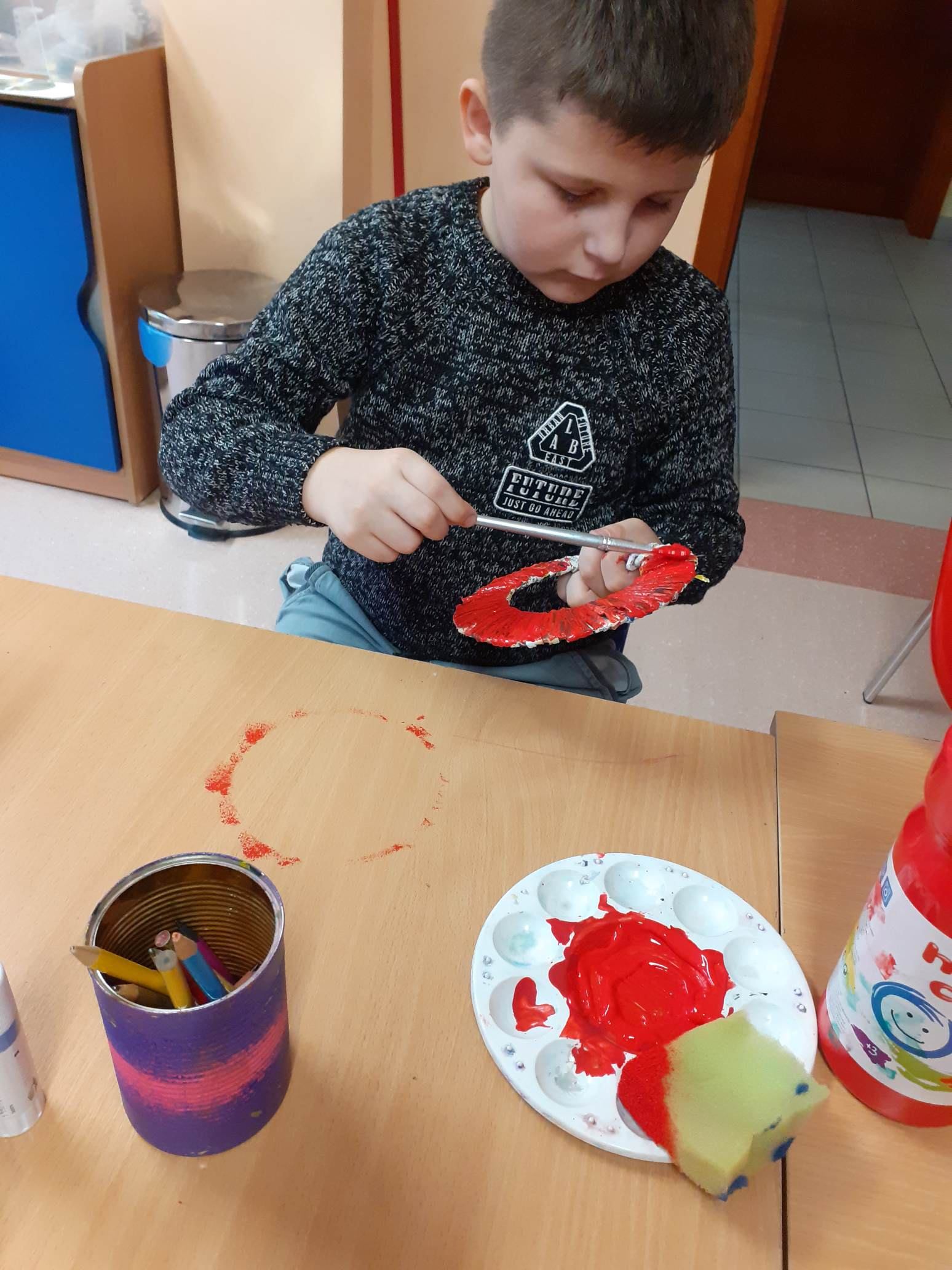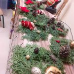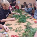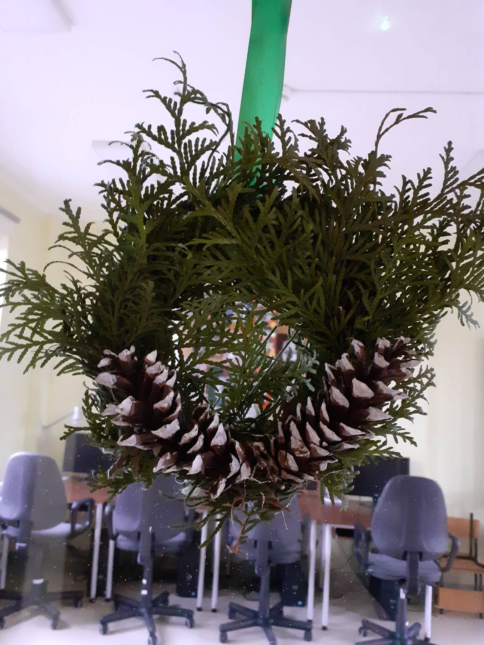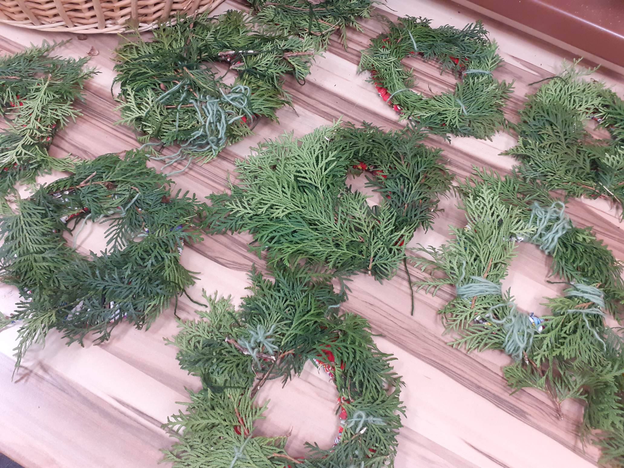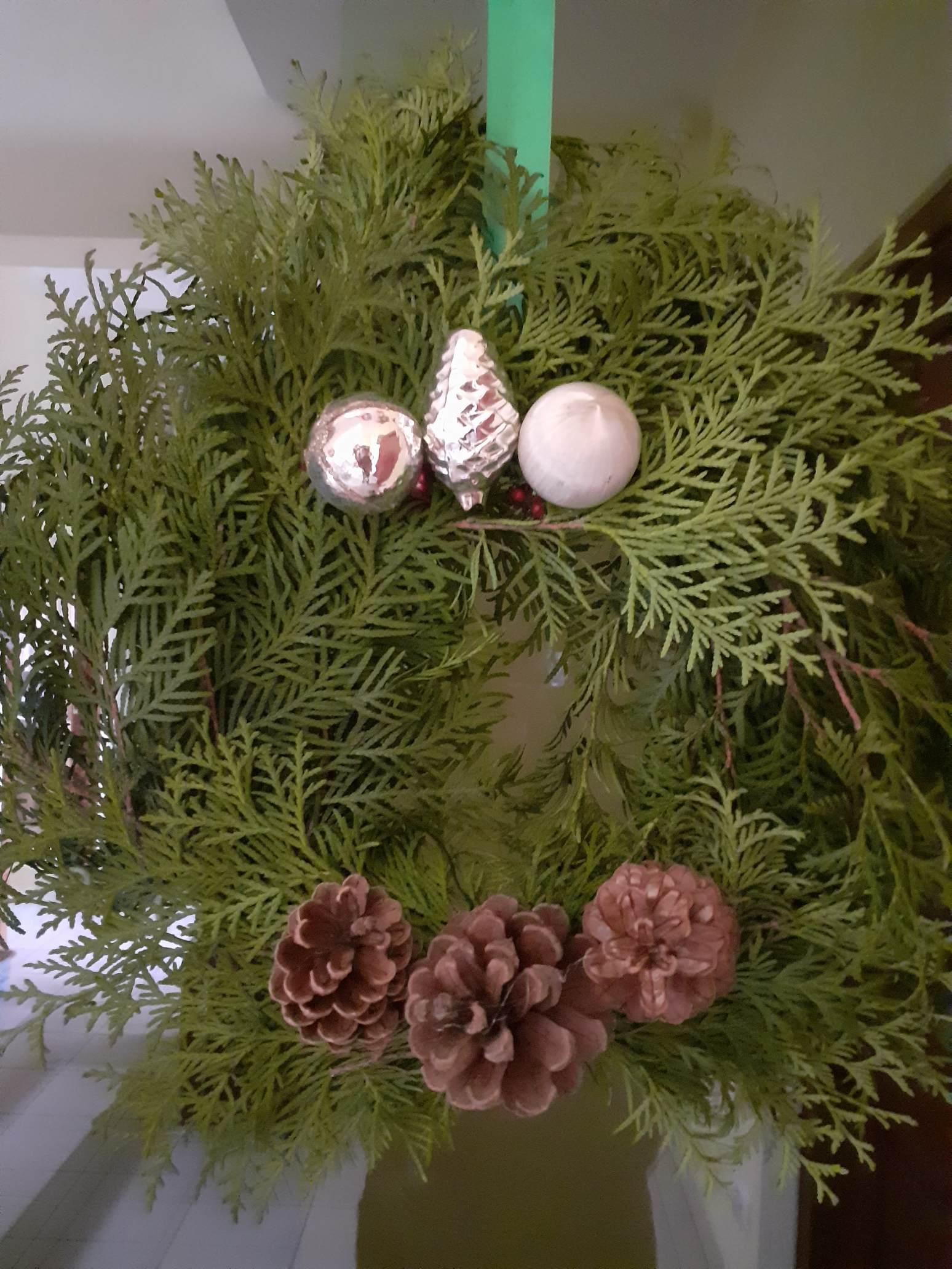Aby nasza świetlica powoli nabierała bożonarodzeniowego charakteru, przygotowaliśmy wieńce świąteczne. Prawie wszystko z darów natury i recyclingu – okręgi zrobione z papierowej wikliny, a ozdobione darami natury (szyszki, żołędzie, zielone gałązki). Użyliśmy też ozdób, które teoretycznie nie były nam w domu potrzebne, a zyskały drugie życie dzięki umieszczeniu ich na naszych wieńcach. W takiej nowej postaci zabraliśmy je do domu, a placówkę ozdobiły pozostałe.
