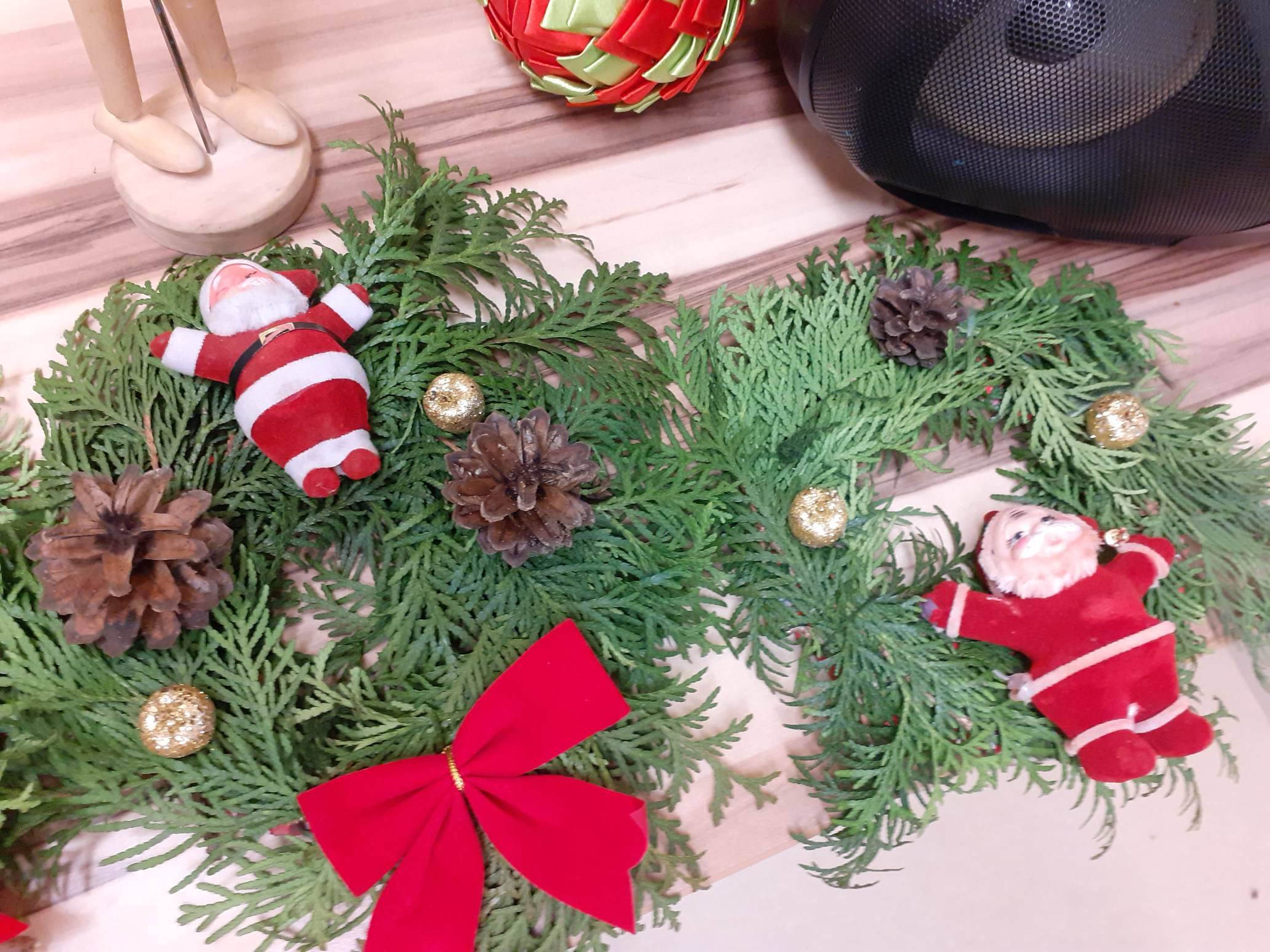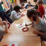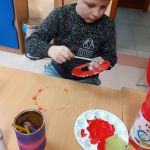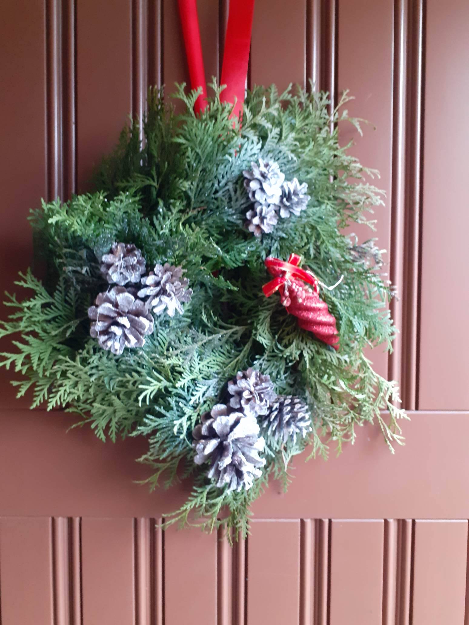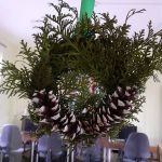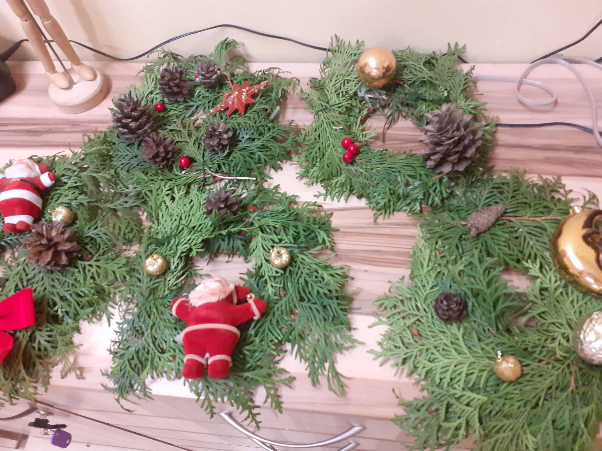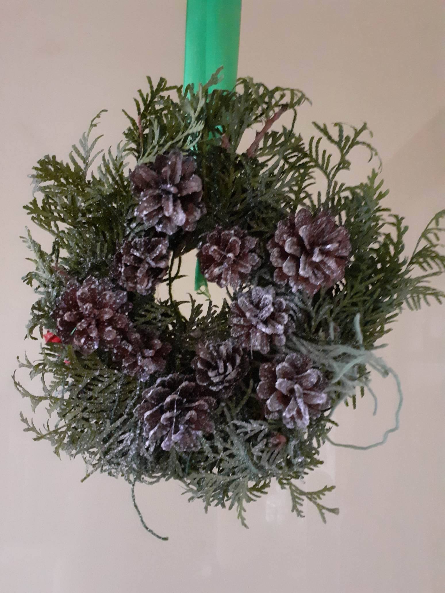 Aby nasza świetlica powoli nabierała bożonarodzeniowego charakteru, przygotowaliśmy wieńce świąteczne. Prawie wszystko z darów natury i recyclingu – okręgi zrobione z papierowej wikliny, a ozdobione darami natury (szyszki, żołędzie, zielone gałązki). Użyliśmy też ozdób, które teoretycznie nie były nam w domu potrzebne, a zyskały drugie życie dzięki umieszczeniu ich na naszych wieńcach. W takiej nowej postaci zabraliśmy je do domu, a placówkę ozdobiły pozostałe.
