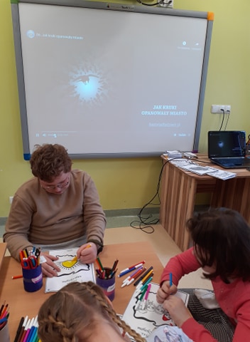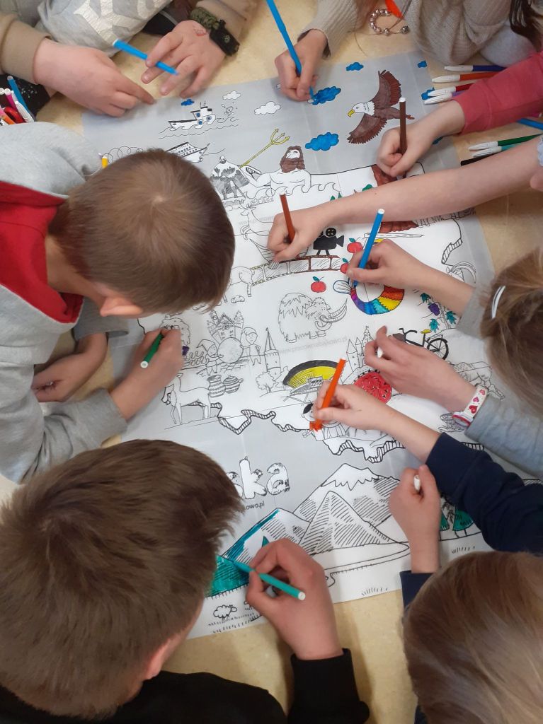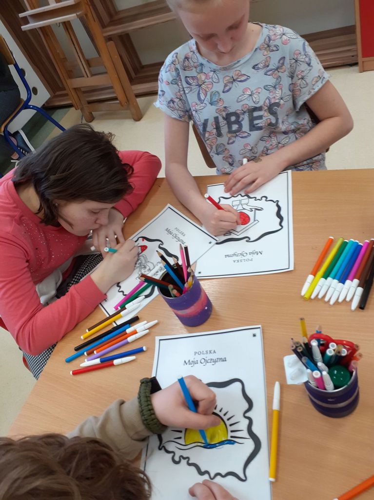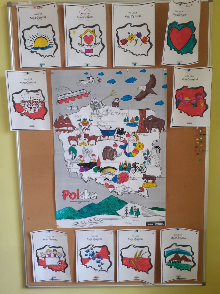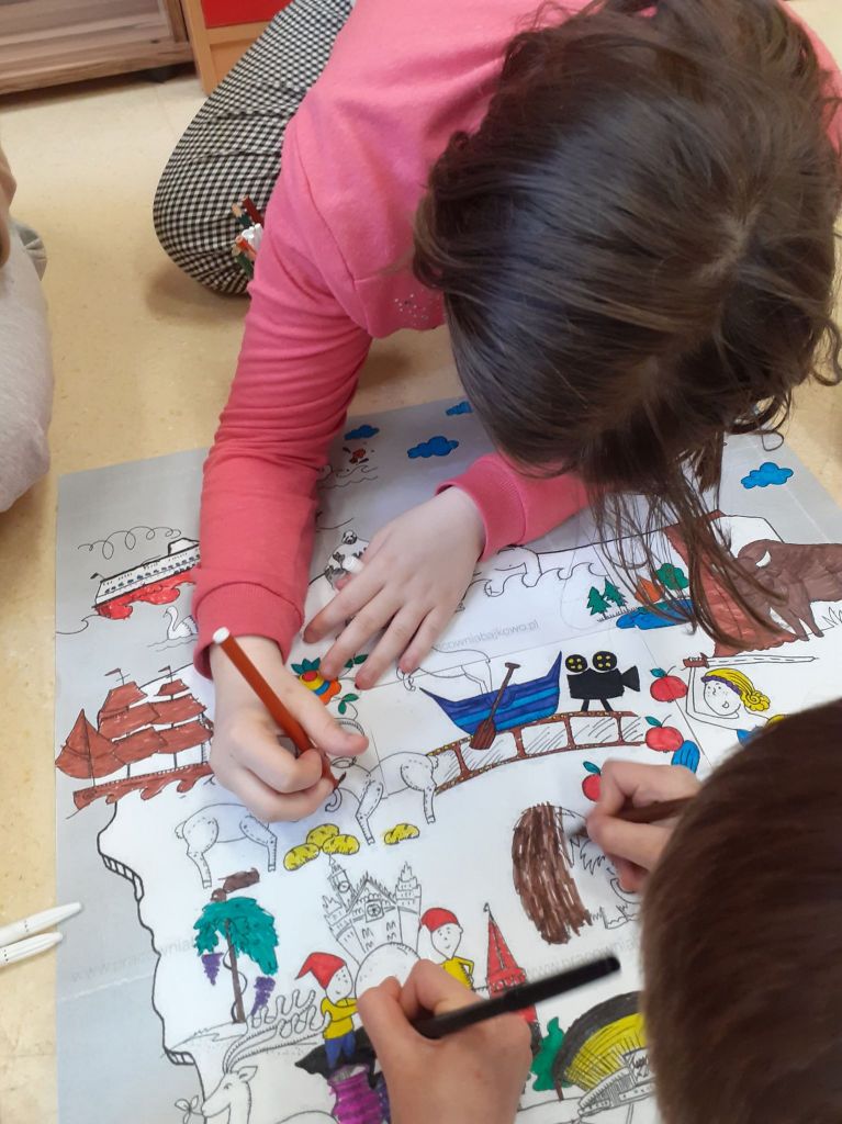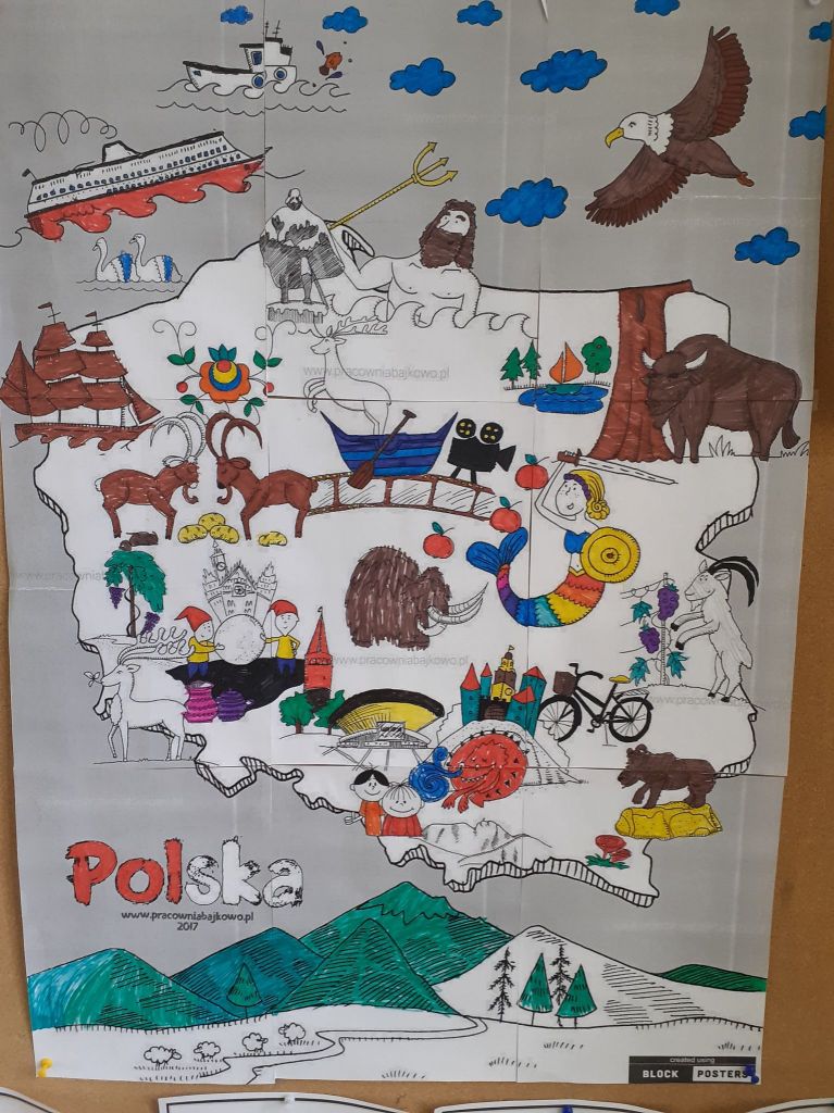 Witaj maj! Trzeci maj! Pod takim hasłem upłynęły nam zajęcia. Po kilkudniowym odpoczynku wróciliśmy wypoczęci i pełni energii. Podjęliśmy zatem dość trudny, bo historyczny temat, jakim jest uchwalenie Konstytucji 3 maja. Obejrzeliśmy krótki filmik wyjaśniający jak do tego doszło. Niektórzy z nas wiedzieli, że ten polski dokument był pierwszym takim w Europie, a drugim na świecie. Dla tych, którzy nie mieli o tym pojęcia było to duże zaskoczenie! A że informacje najlepiej nam się przyswaja za pomocą obrazu właśnie, to następnie zabraliśmy się za kolorowanki przedstawiające symbole i grafiki charakterystyczne dla naszego kraju, pokazujące wszystko to, za co kochamy naszą ojczyznę. Ostatnio bardzo stawiamy na współpracę, więc i tym razem tak było – dzięki wysiłkowi każdego z nas powstał plakat przedstawiający mapę Polski z zaznaczonymi na niej największymi miastami. Ale żeby nie było tak łatwo, to zabrakło ich nazw! Musieliśmy je poznać po symbolach umieszczonych we właściwych miejscach na mapie.