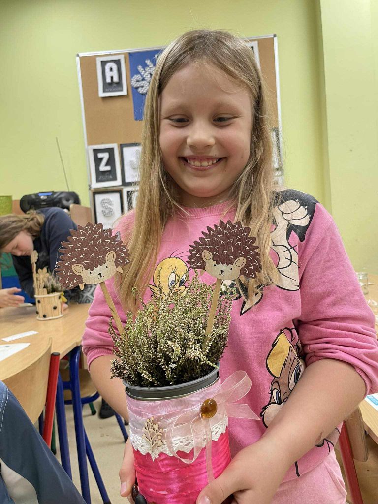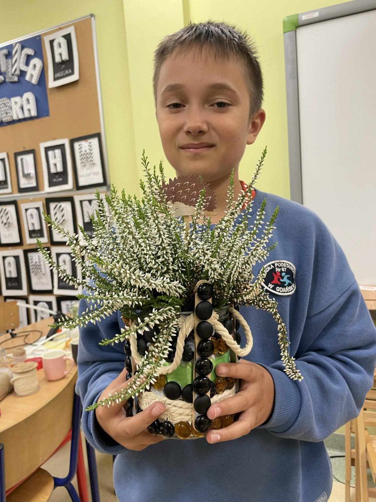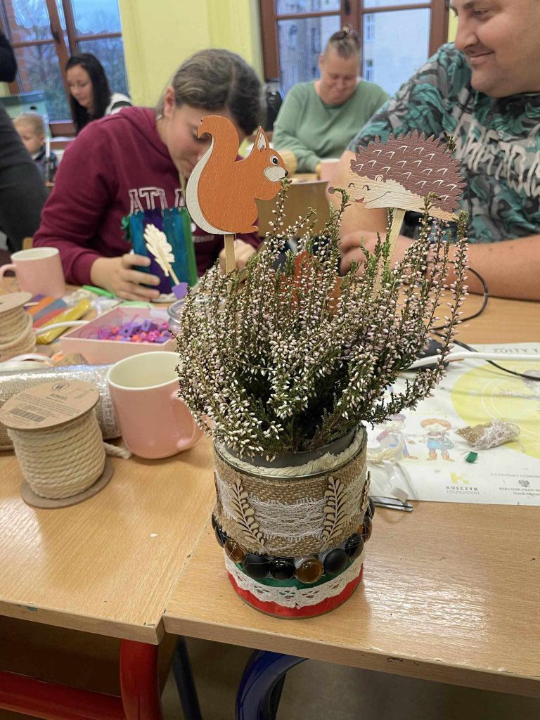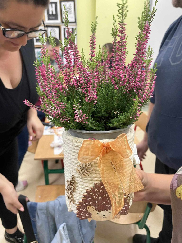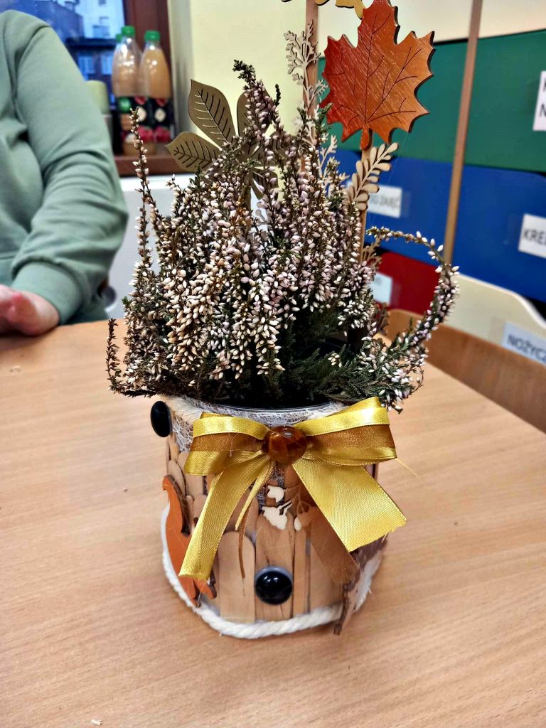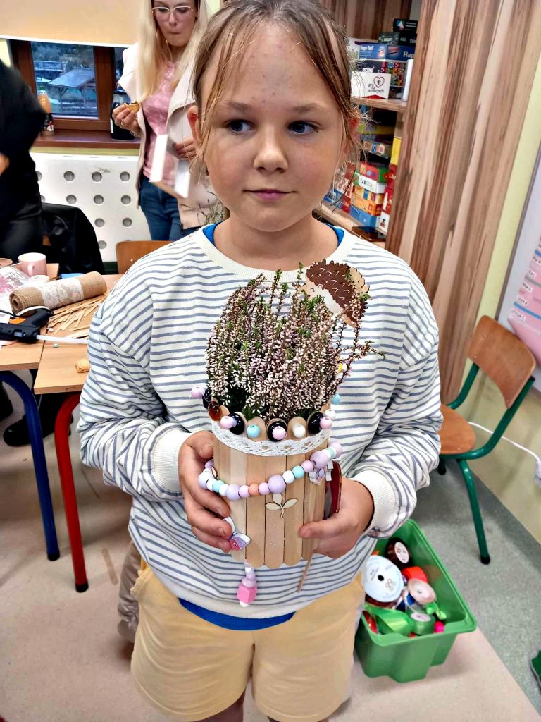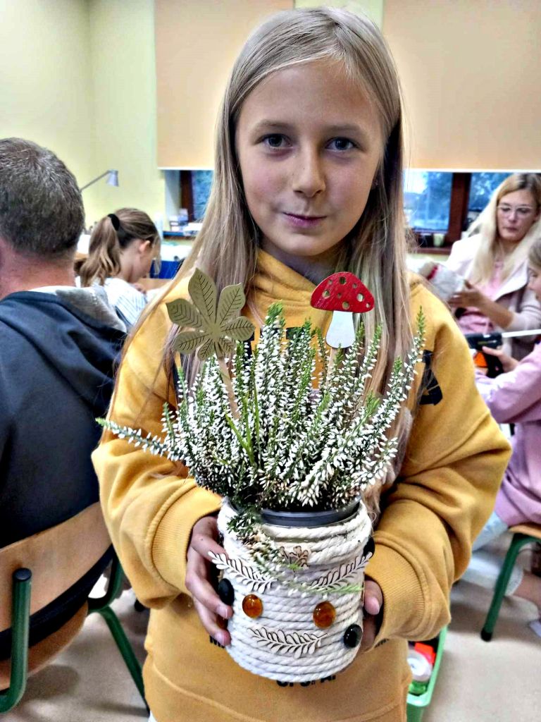 W zeszłym tygodniu spotkaliśmy się z rodzicami i dziećmi, aby zrobić doniczki na jesienne roślinki – wrzosy. Używaliśmy koralików, wstążek, patyczków, juty, koronek i kamyczków, aby powstały oryginalne – nasze własne osłonki na kwiaty.