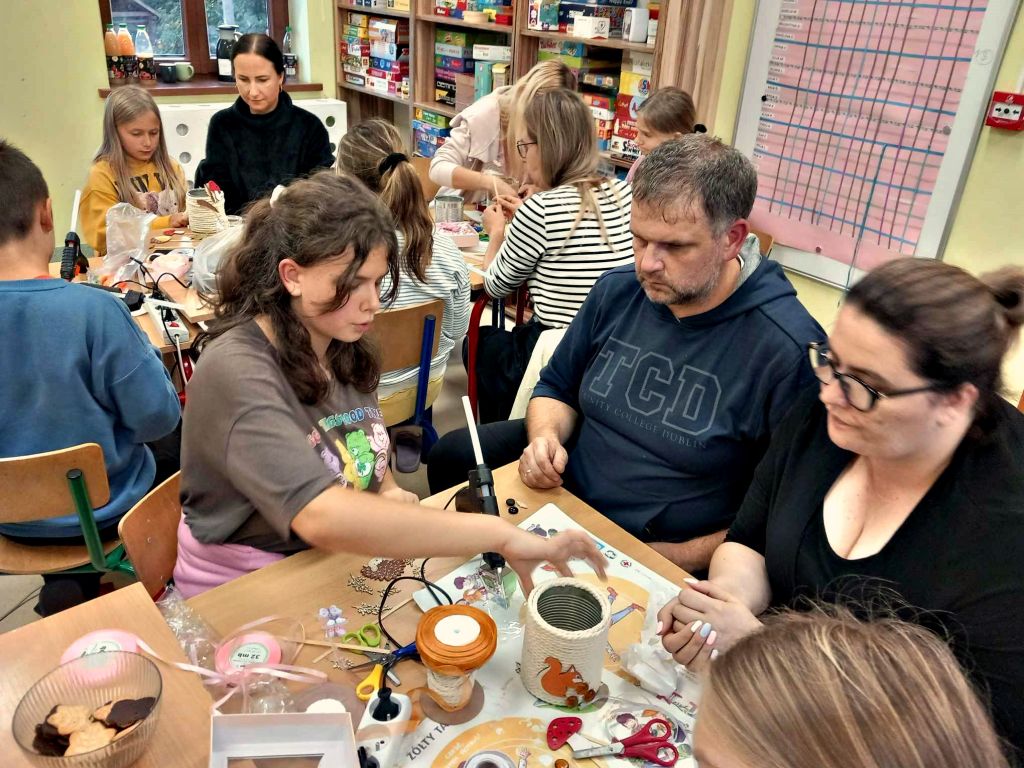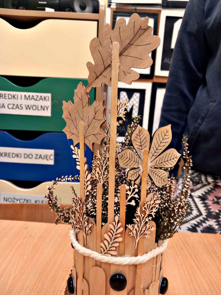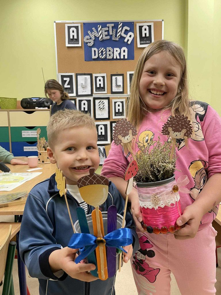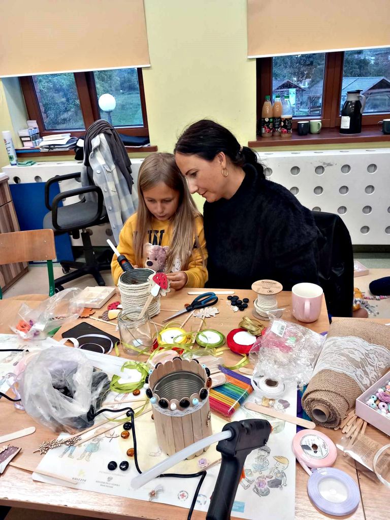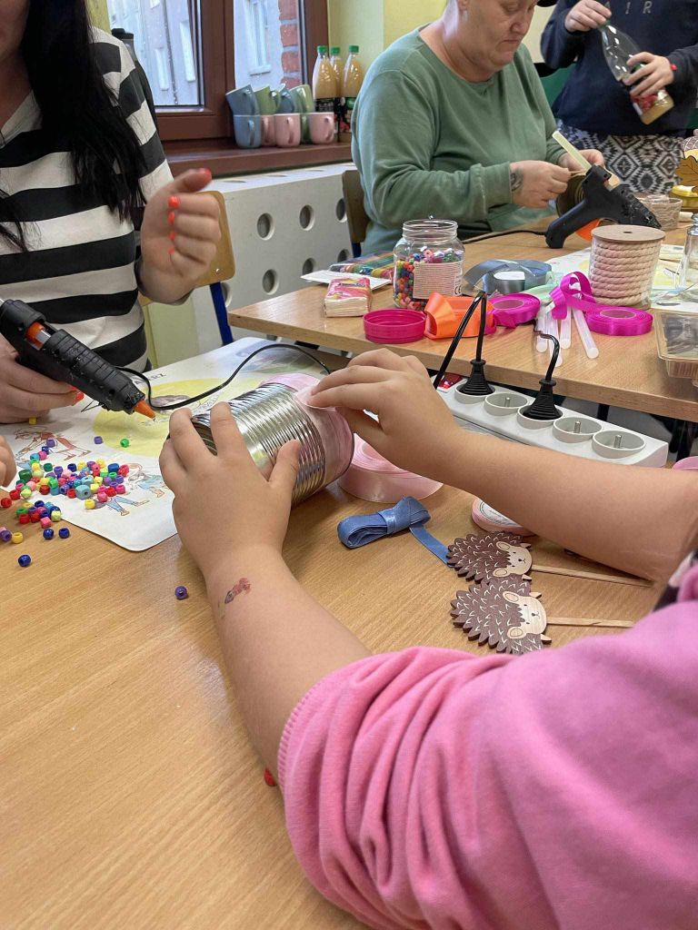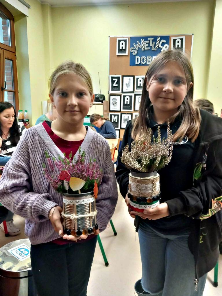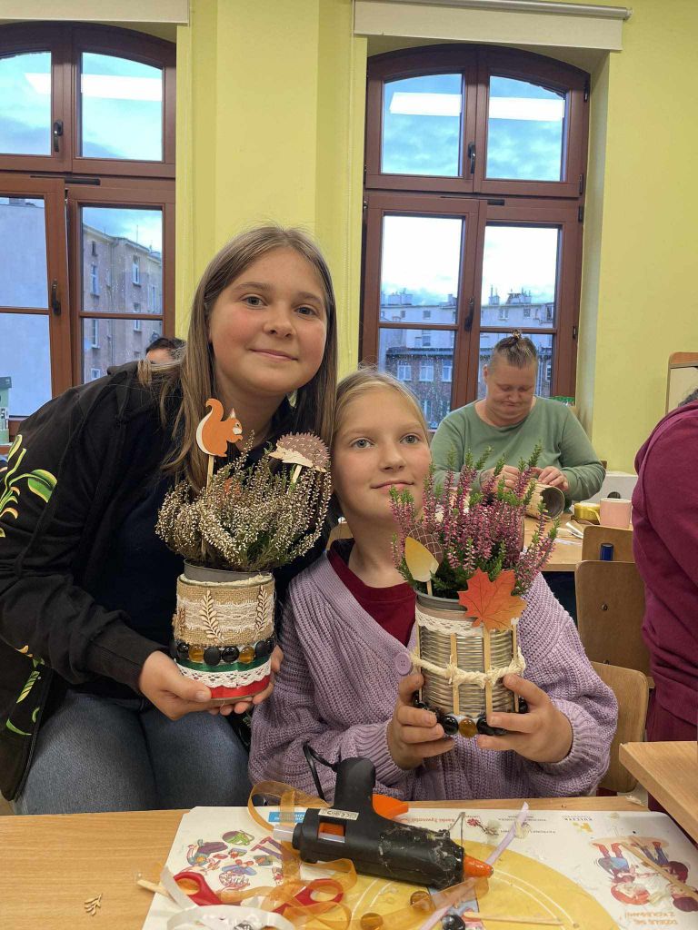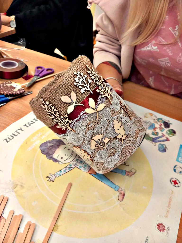 W zeszłym tygodniu spotkaliśmy się z rodzicami i dziećmi, aby zrobić doniczki na jesienne roślinki – wrzosy. Używaliśmy koralików, wstążek, patyczków, juty, koronek i kamyczków, aby powstały oryginalne – nasze własne osłonki na kwiaty.