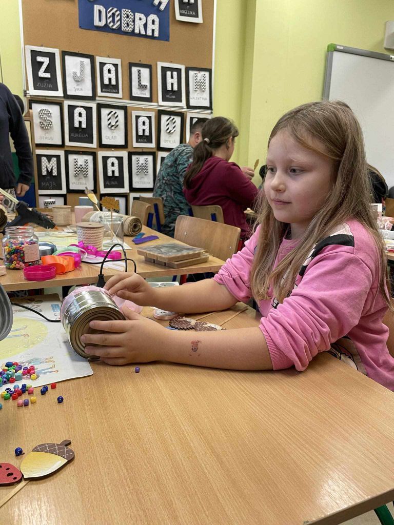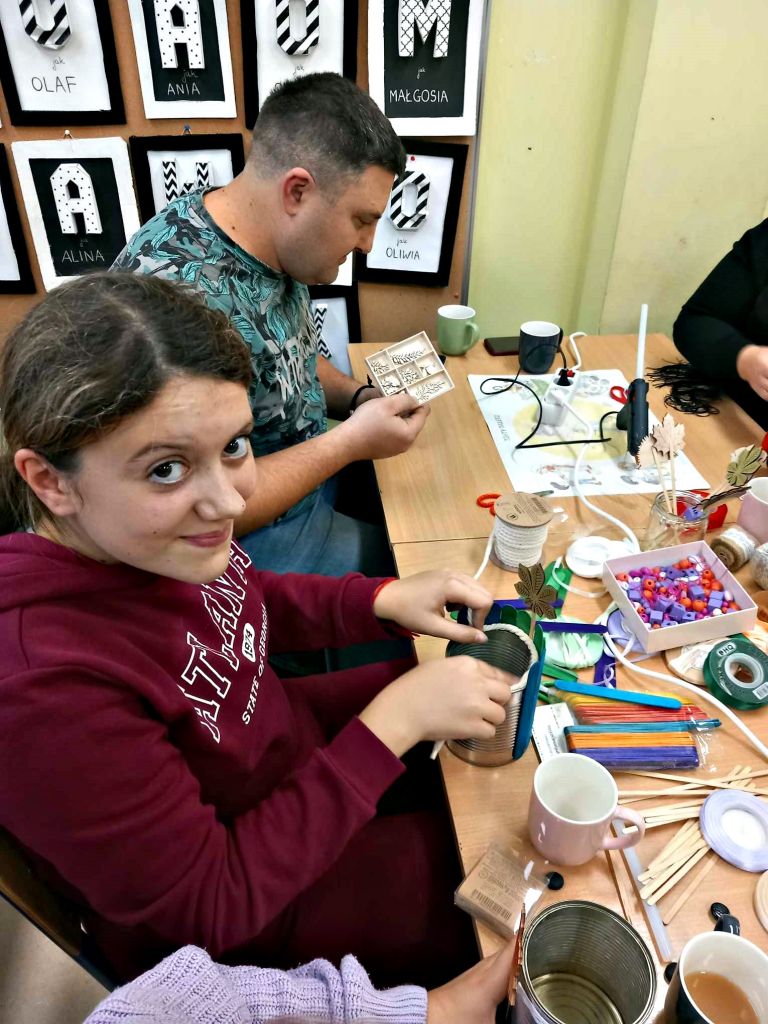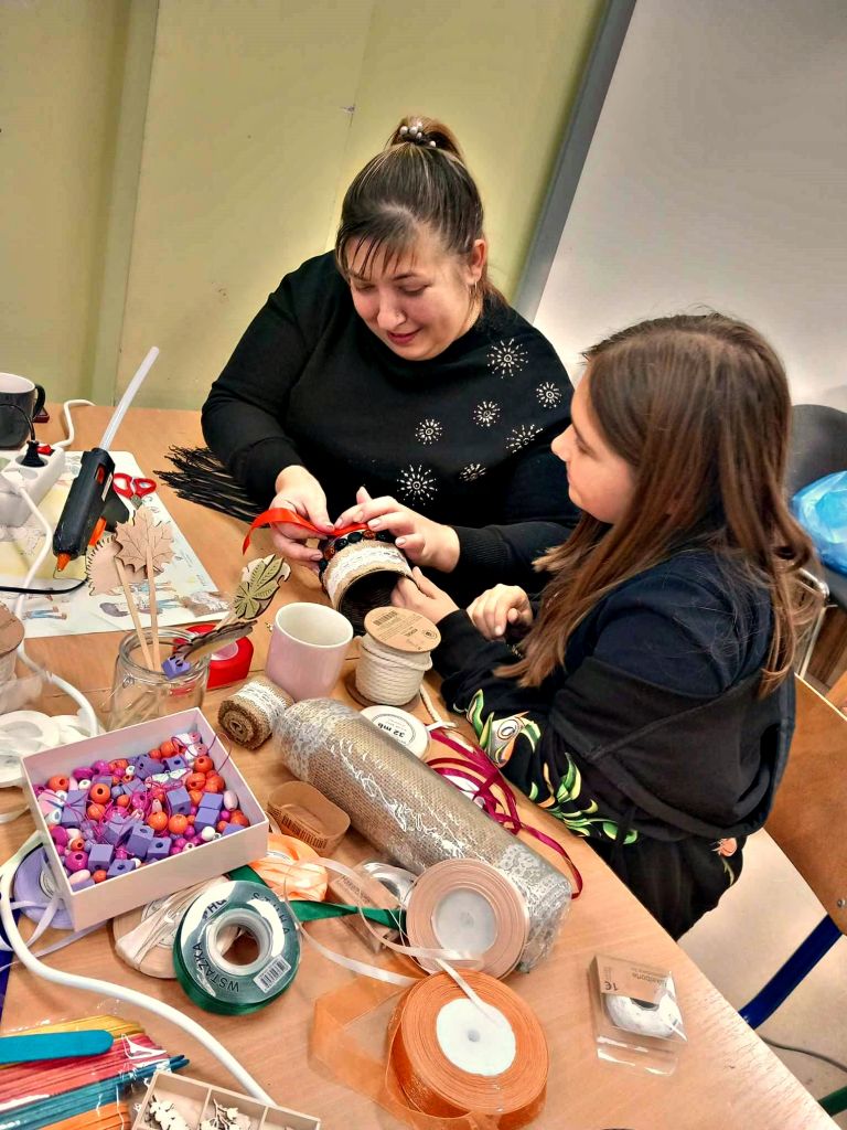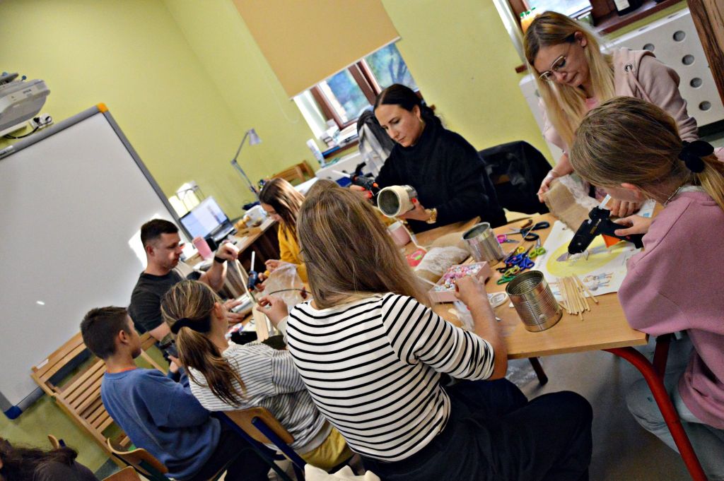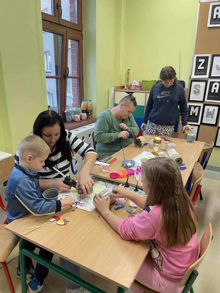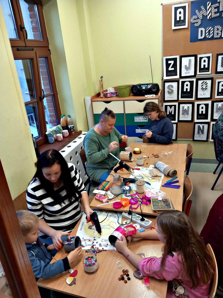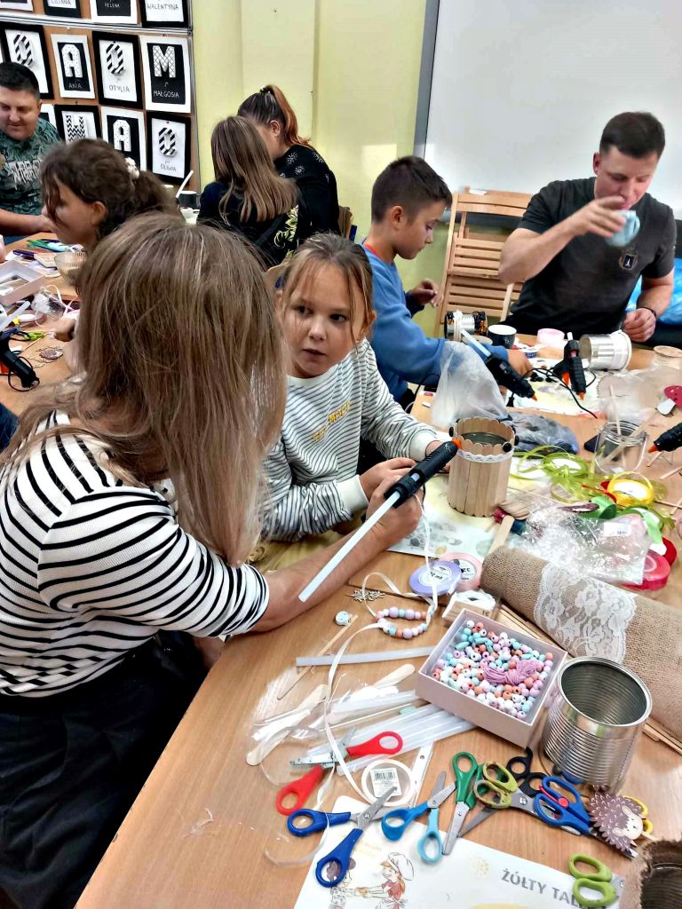 W zeszłym tygodniu spotkaliśmy się z rodzicami i dziećmi, aby zrobić doniczki na jesienne roślinki – wrzosy. Używaliśmy koralików, wstążek, patyczków, juty, koronek i kamyczków, aby powstały oryginalne – nasze własne osłonki na kwiaty.