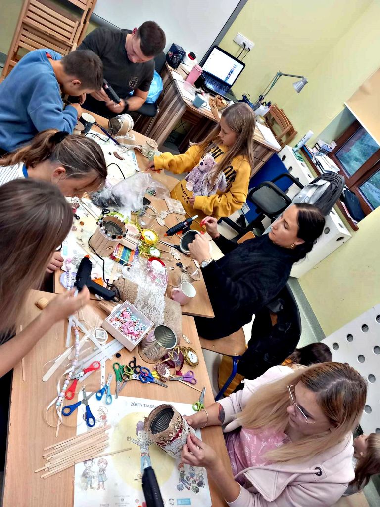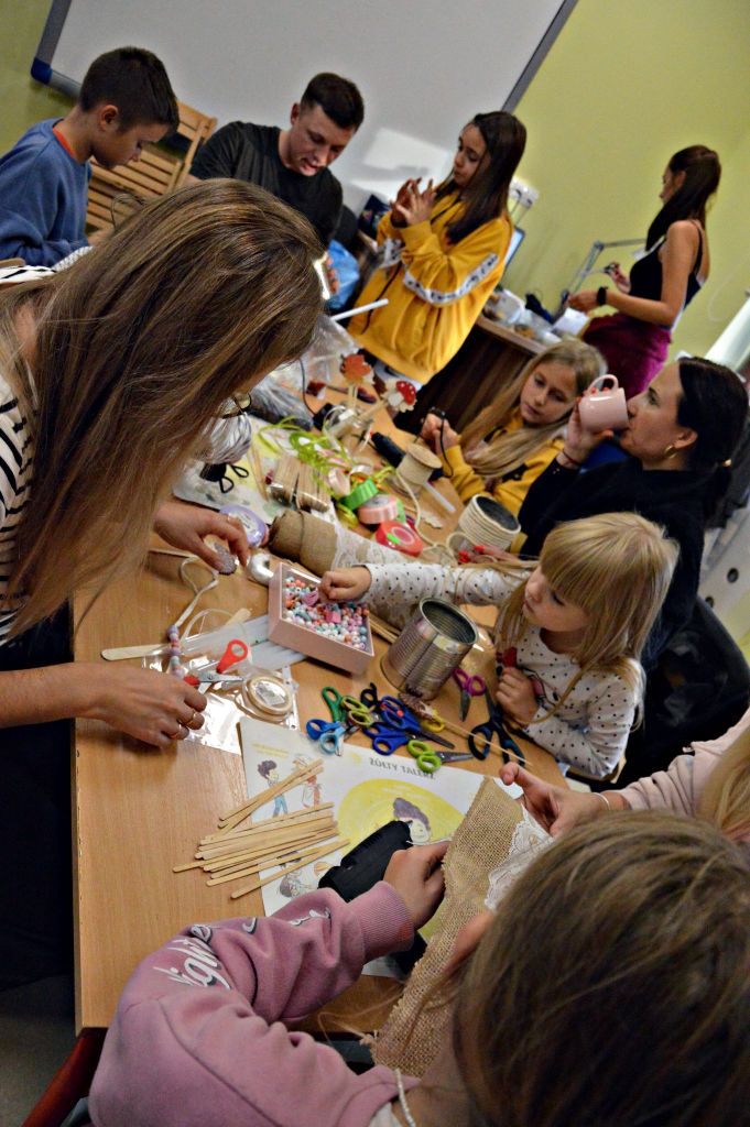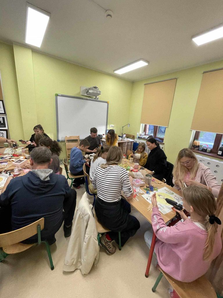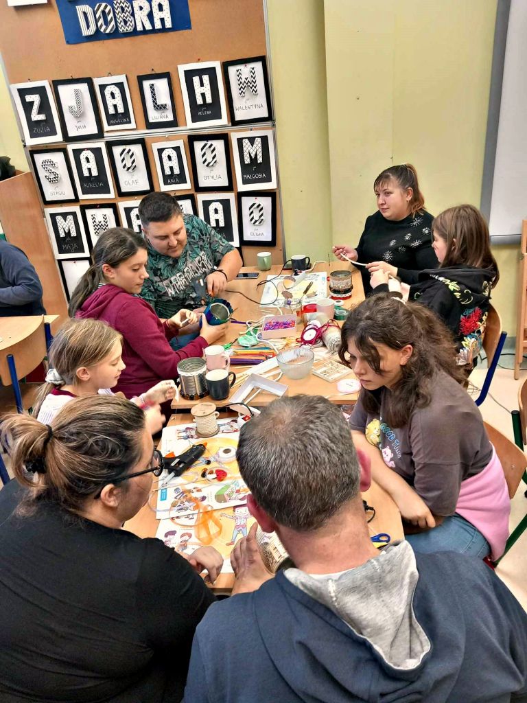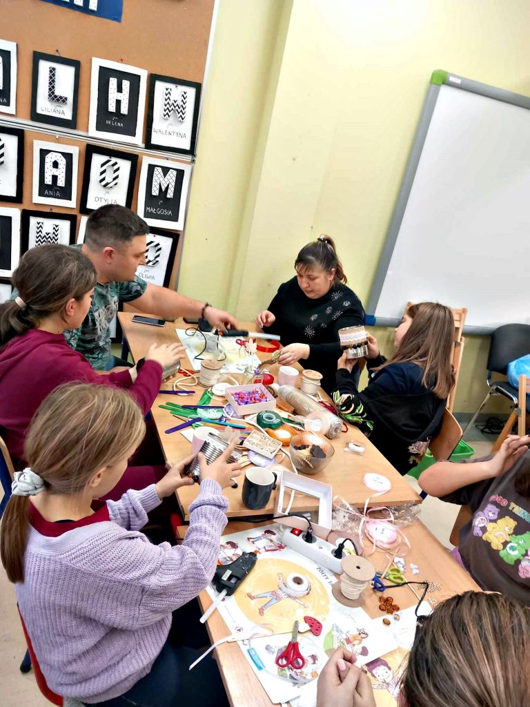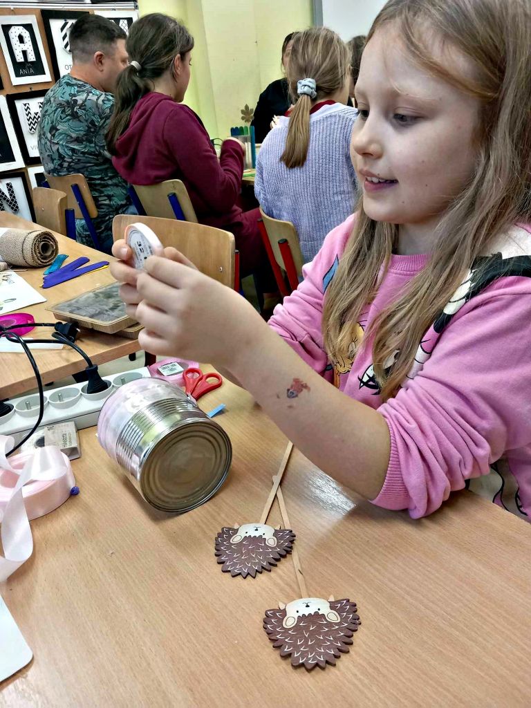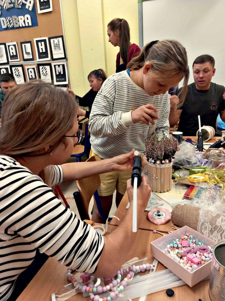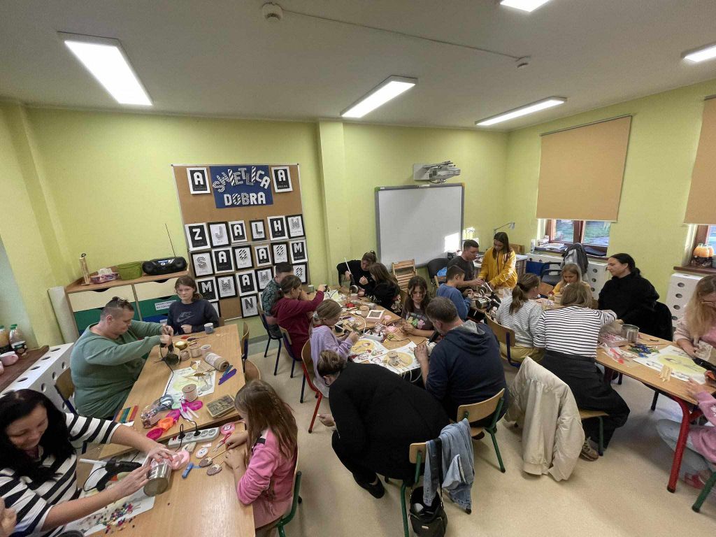 W zeszłym tygodniu spotkaliśmy się z rodzicami i dziećmi, aby zrobić doniczki na jesienne roślinki – wrzosy. Używaliśmy koralików, wstążek, patyczków, juty, koronek i kamyczków, aby powstały oryginalne – nasze własne osłonki na kwiaty.