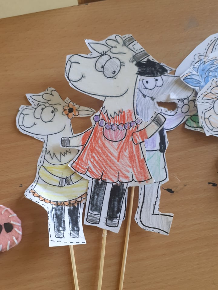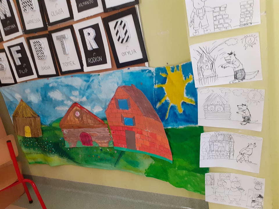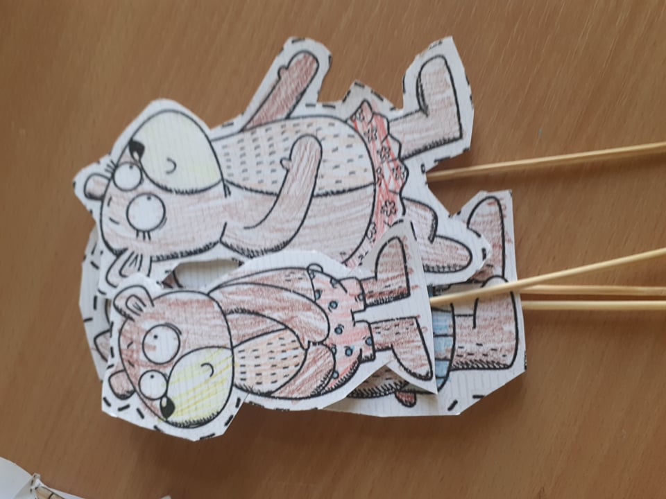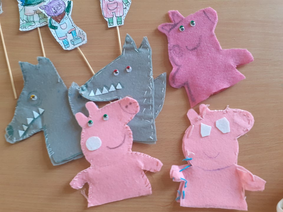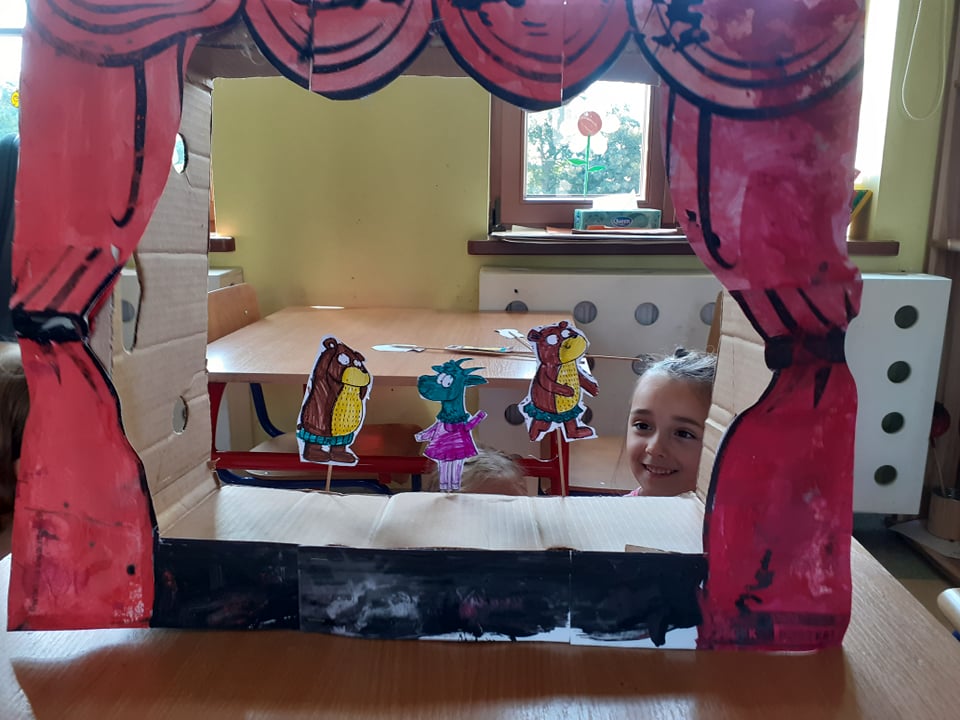 Tydzień pełen postaci teatralnych i z bajek. Tworzyliśmy scenerię do mini przedstawienia „Wilk i trzy świnki”, po uprzednim zapoznaniu się z historią i przygotowaniu postaci na patyczkach. Spodobało nam się to tak bardzo, że zrobiliśmy również postaci do „Złotowłosej i trzech niedźwiadków” oraz „O wilku i koźlątkach”. Karton, wydrukowana kurtyna i teatr gotowy! Tak niewiele pracy, a tak wiele dobrej zabawy.