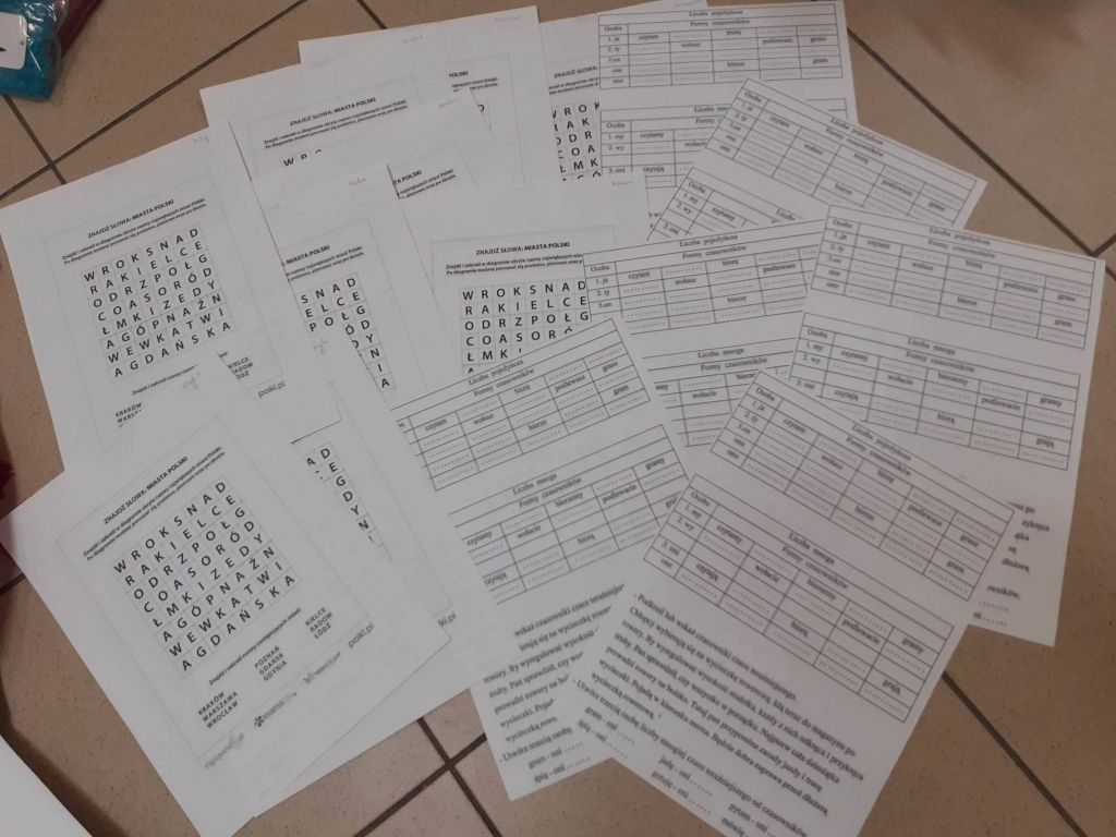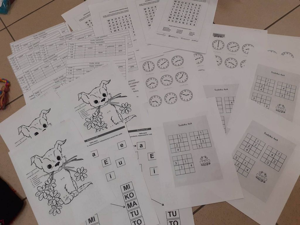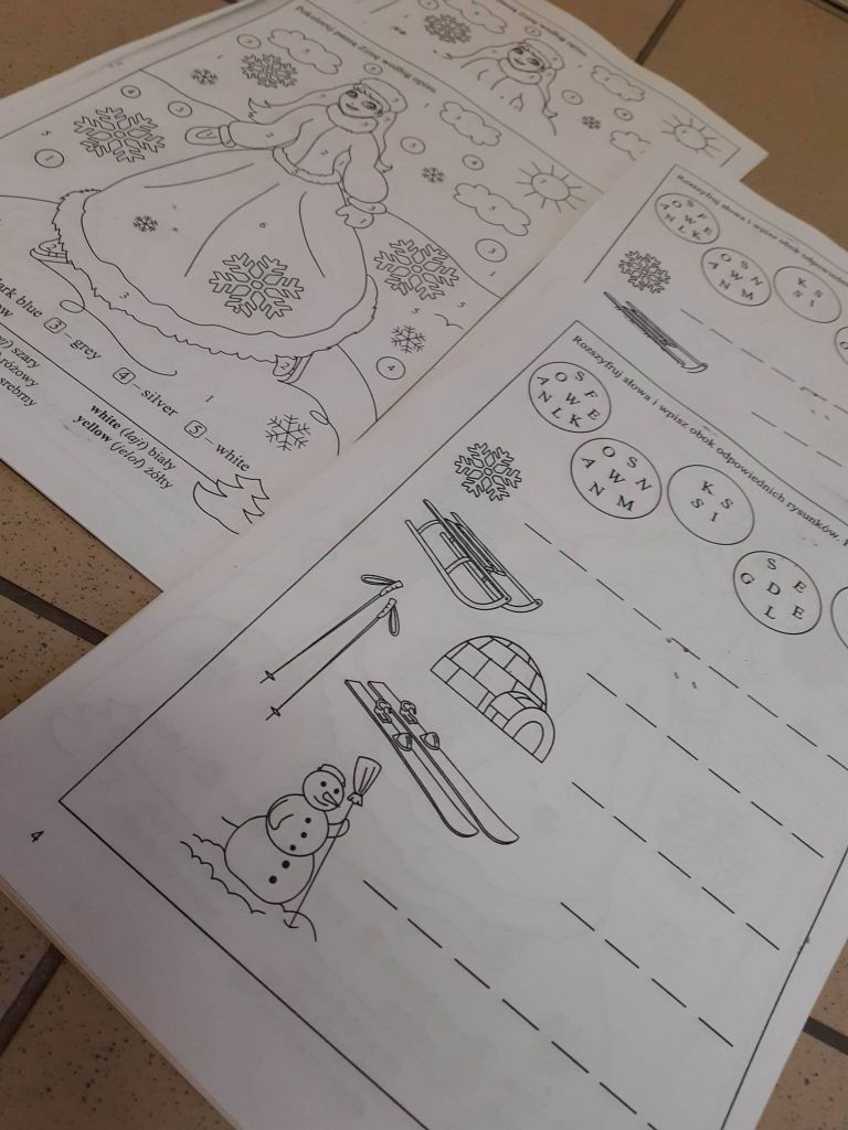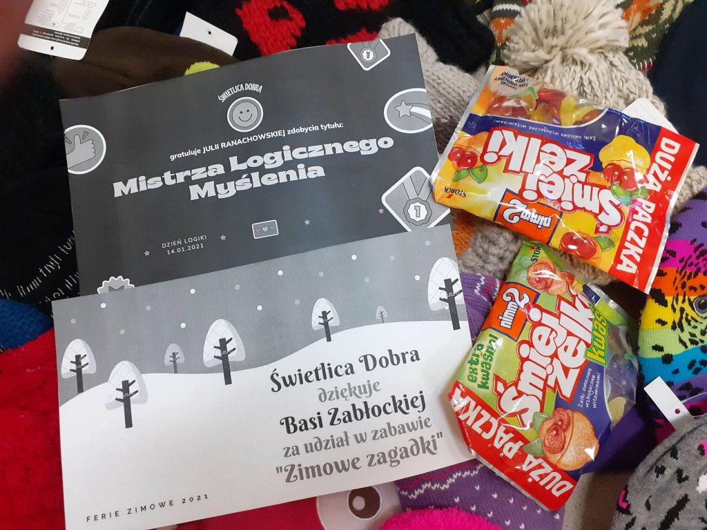 Zawitała do nas zima, więc na czas mrozów i padającego śniegu dzieci otrzymały od nas ciepłe czapki i opaski. Było to możliwe dzięki sympatykowi Caritas, który sprawił nam w ten sposób miłą niespodziankę. Bardzo dziękujemy 🙂 Dzieci dostały także w pakietach gry i kolorowanki na chwile oderwania od komputera i przyjemne spędzenie czasu. Każdy dostał też karty pracy do nauki j. angielskiego, które nawiązywały do obecnej pory roku, ćwiczenia na odczytywanie godziny z zegara, na poprawne stosowanie form gramatycznych czy na właściwe wykonywanie działań matematycznych. Nie mogło zabraknąć czegoś z zakresu profilaktyki – nasi podopieczni w formie gry i zabawy mogli porozmawiać o swoich emocjach – co ich bawi, smuci, denerwuje itp. Wystarczyło rzucić kostkami i odpowiedzieć na pytanie, które się na nich pojawiło. Wiemy, jak ważne, ale zarazem trudne są rozmowy o emocjach, więc mamy nadzieję, że taka forma znacznie im ułatwi dzielenie się swoimi odczuciami. Doceniliśmy także zaangażowanie Basi w rozwiązywanie zagadek zimowych oraz bystrość umysłu, jaką wykazała się Julia podczas dnia zagadek logicznych. Dziewczynki zostały nagrodzone dyplomami i drobnymi słodkościami.