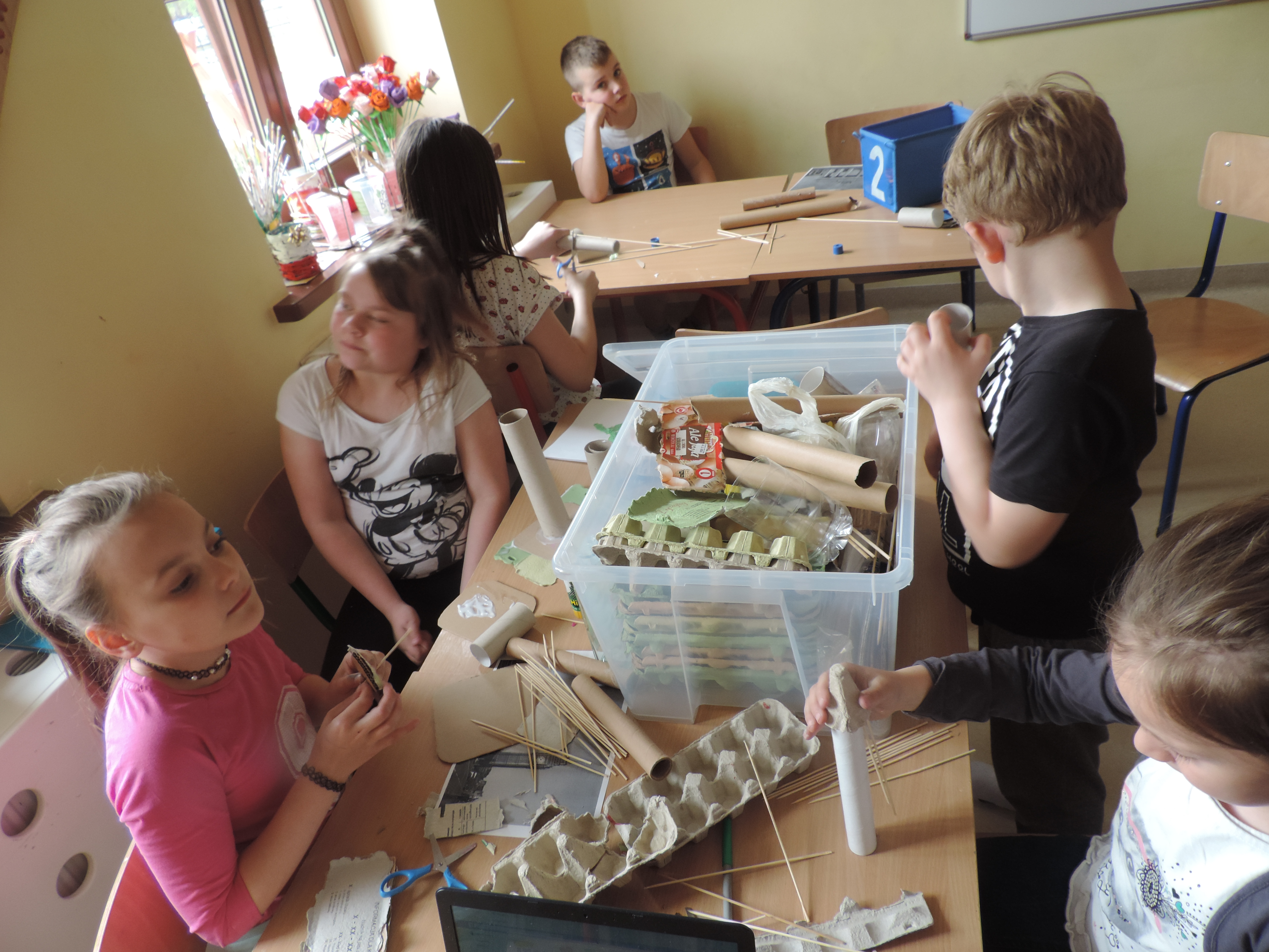 Na zajęciach z Alvaro połączyliśmy recycling z nauką języka angielskiego. Przypomnieliśmy sobie kilka krajów i ich stolic w języku angielskim. Zadanie, jakie później wyznaczył nam Alvaro nie było proste – musieliśmy z przedmiotów, które teoretycznie mogłyby znaleźć się już w śmietniku, stworzyć budowle, z których słyną europejskie stolice. I tak udało nam się zbudować Bramę Brandenburską, Big Bena i Wieżę Eiffla. Na szczęście udało nam się spostrać temu zadaniu, choć troszkę się przy tym namęczyliśmy. Ale sił dodał nam pyszny deser, jaki zjedliśmy po posiłku. Wystarczyło jeszcze uruchomić wyobraźnię i gotowe!