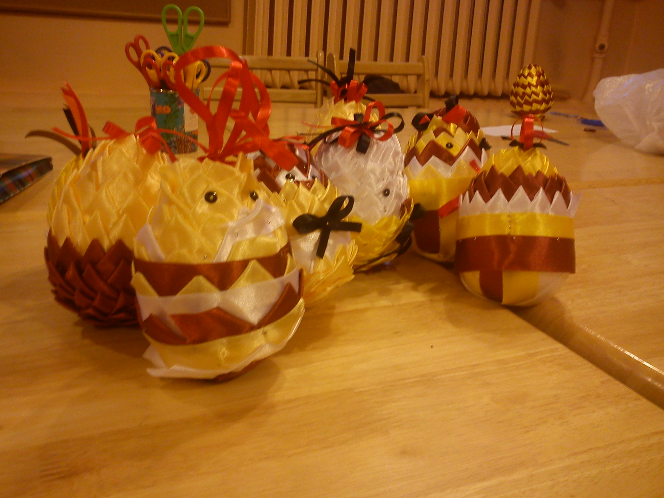 Na ostatnich zajęciach przygotowywaliśmy ozdoby świąteczne w postaci pięknie udekorowanych jajek. Uczyliśmy się techniki zdobienia styropianowych jaj przy pomocy materiałowych wstążek. To łatwy do opanowania, ale wymagający dokładności sposób na wykonanie małych dzieł sztuki. Wszyscy z tej próby cierpliwości wyszli zwycięsko, czego efektem są wspaniale wykonane ozdoby. Pomimo dostępności dokładnie tych samych materiałów każda z prac jest niepowtarzalna. Uczestnicy zajęć swoje ozdoby zabrali do domów, by udekorować je przed zbliżającymi się świętami.