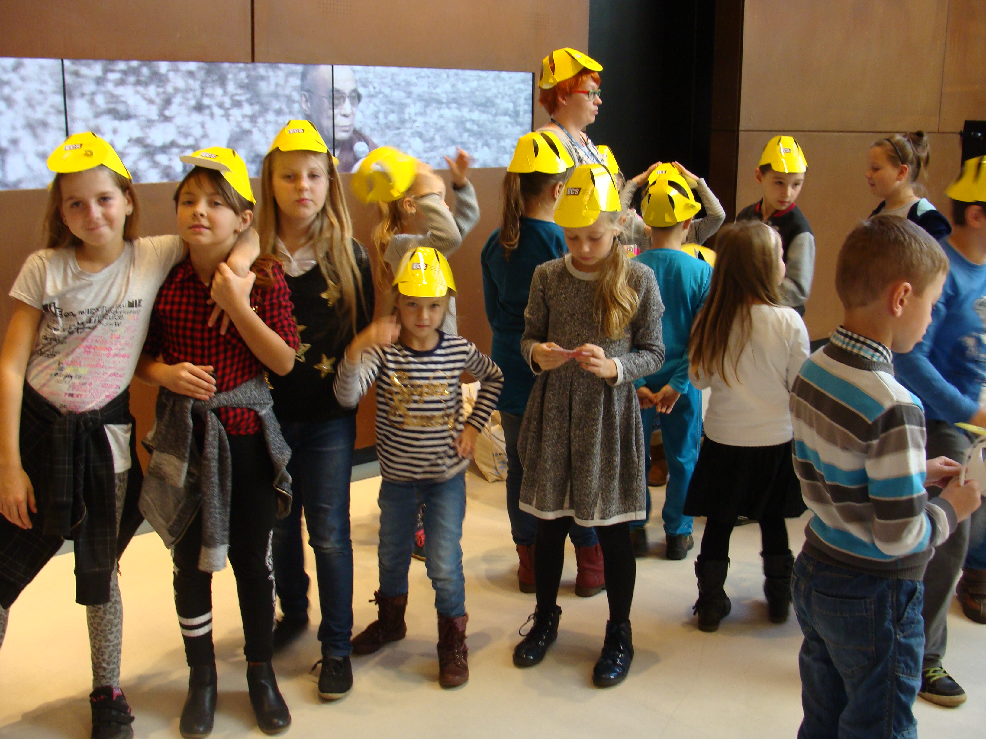 „I oto nasz wyczekany wyjazd kulturalny do ECS. Było bardzo interesująco. Dowiedzieliśmy co to znaczy solidarność i poznaliśmy kilka ciekawostek sprzed lat np. że w ciągu miesiąca można było kupić na rodzinę tylko 20 dkg cukierków na rodzinę 🙁 albo, że ustawiano się w gigantycznych kolejkach całymi rodzinami po artykuły codziennego użytku. Potem zrobiliśmy samodzielnie piękne kaski prawie takie jakie ma BOB Budowniczy 😉 Na koniec stworzyliśmy swój napis SOLIDARNOŚĆ – na zdjęciach możecie zobaczyć, jak wygląda nasza SOLIDARNOŚĆ”