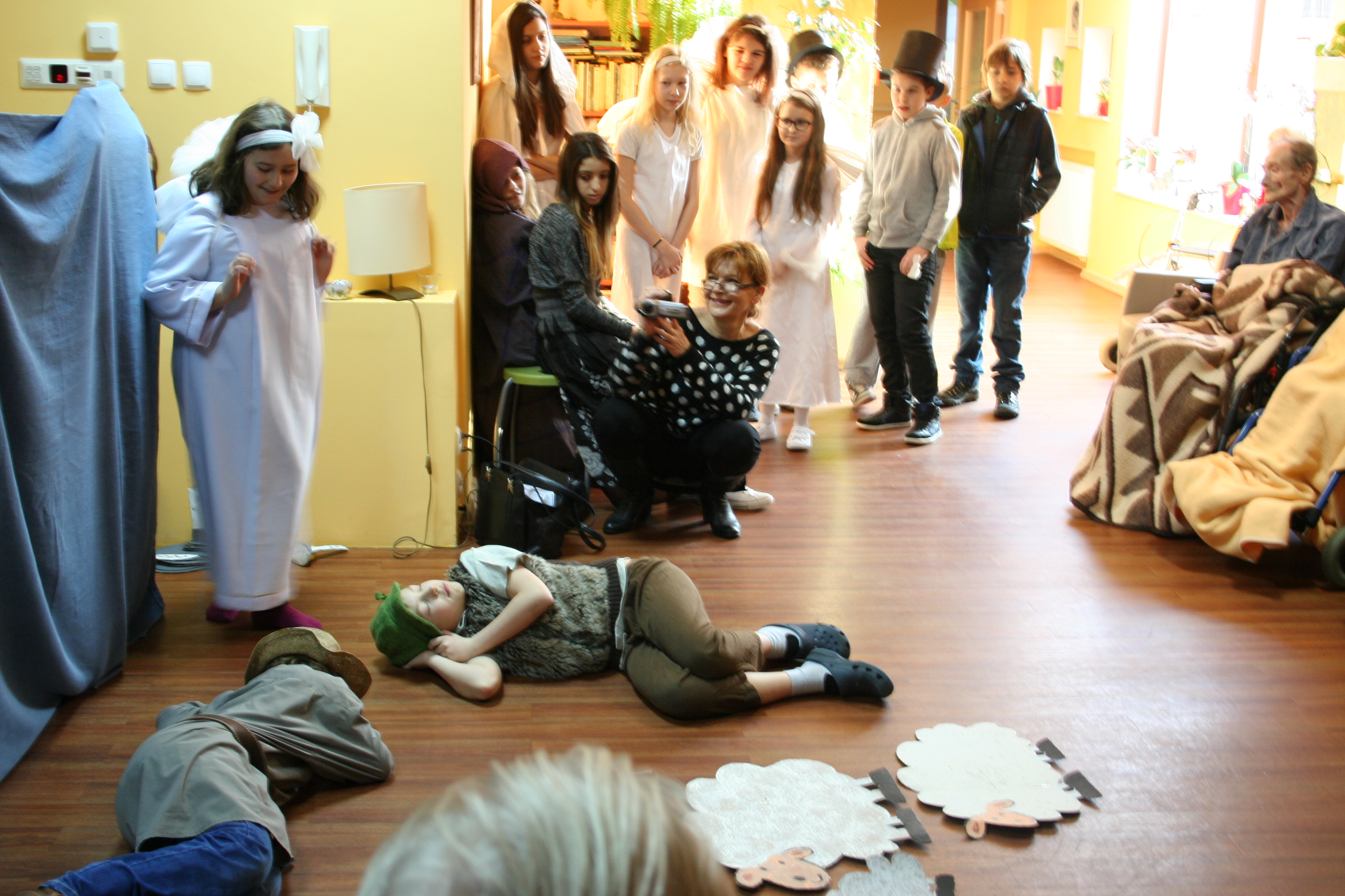 W skupieniu i przejęciu nasi podopieczni oraz personel śledzili kolejne wydarzenia opowieści Dickens’a odegrane na Scenie Hospicyjnej. Emocji było niemało, co wyrażone zostało gromkimi brawami oraz słowami uznania i podziwu dla młodych aktorów.