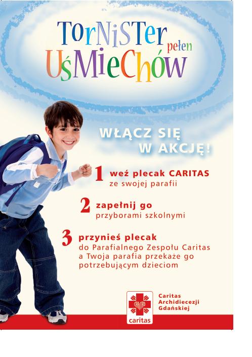 Od 2 lipca trwa akcja Caritas pn. TORNISTER PEŁEN UŚMIECHÓW  polegająca na współpracy diecezjalnej Caritas, parafii – Parafialnych Zespołów Caritas i wiernych.  Parafia poprzez PZC przekazuje puste plecaki ludziom dobrej woli, którzy po wypełnieniu ich artykułami szkolnym zwracają je do parafii.