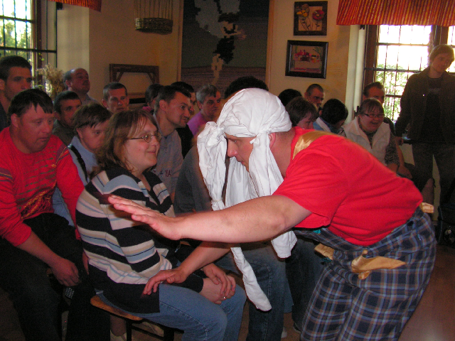 To był słoneczny, majowy dzień, gdy pod naszą strzechę zawitał teatrzyk z Krakowa. Oglądaliśmy przedstawienie, pięknie rymowane wierszem. Była to forma teatru interaktywnego, więc wszyscy brali w nim udział, zaróno nasi podopieczni, jak i pracownicy. Prostota, wdzięk i poczucie humoru aktorów rozbudziły w naszych sercach radość i chęć do dobrej zabawy. Było super!
