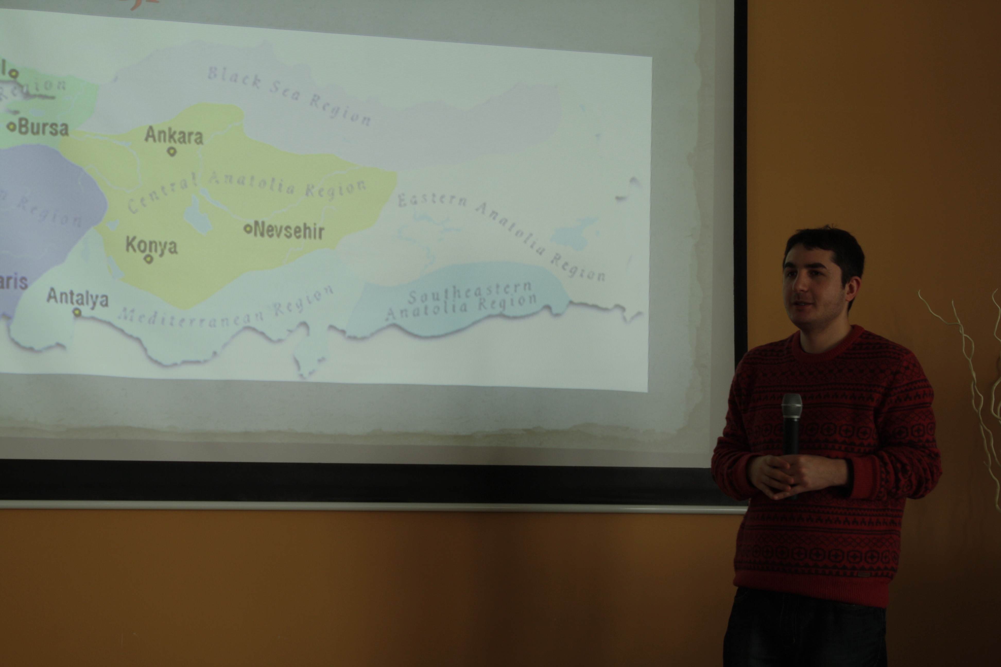 9 kwietnia w naszym Centrum przy ul. Fromborskiej odbył się międzynarodowy wykład na temat Turcji zaprezentowany przez młodego wolontariusza Cihan’aUnlu, pochodzącego z Izmiru. W jednym z filmów zaprezentował przepiękną krainę- Capadoccię- „ziemię pięknych koni”, kraina historyczna w tureckiej Anatolii, znana przede wszystkim z charakterystycznych form tufowych, tworzących księżycowy krajobraz, oraz z domów i kościołów wykutych w tufowych skałach. Kapadocja była aż do średniowiecza silnym ośrodkiem chrześcijaństwa oraz miejscem narodzin idei życia klasztornego. Wiele skalnych domów wciąż jest zamieszkanych. Choć z zewnątrz wyglądają na prymitywne jaskinie, w środku niewiele różnią się od zwykłych mieszkań, z elektrycznością (obowiązkowo z telewizorem i anteną satelitarną) oraz wodą. Jednak zdecydowana większość skalnych domostw jest już pusta – mieszkańcy opuścili je ze względów bezpieczeństwa.