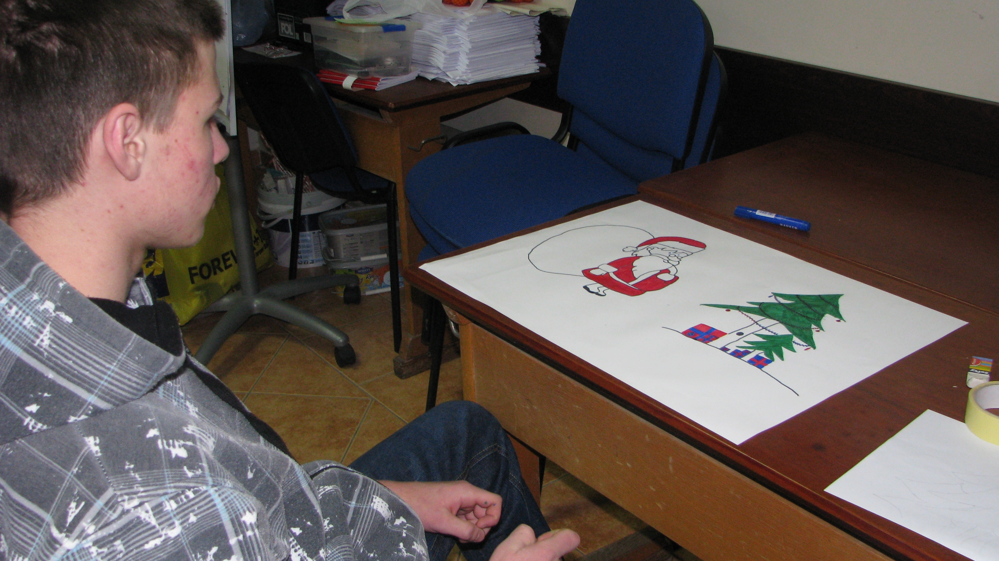 Nasi uczestnicy są niezwykle aktywni i postanowili uczestniczyć w malowaniu plakatów na akcję „Mikołaj Puk Puk”.