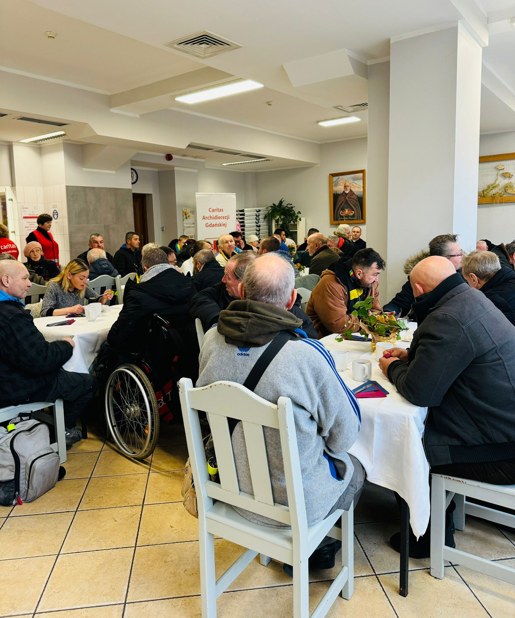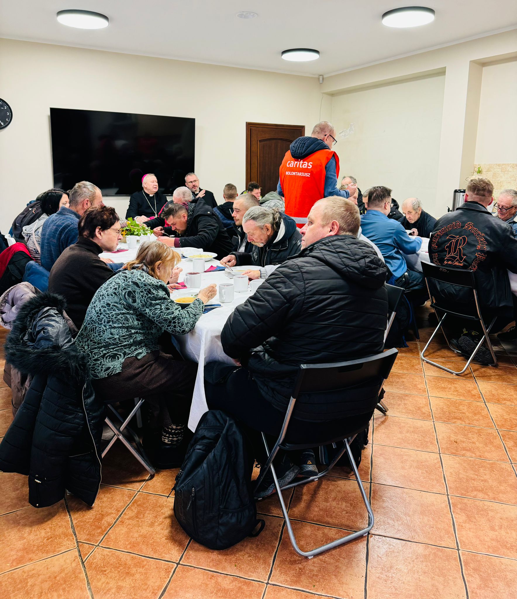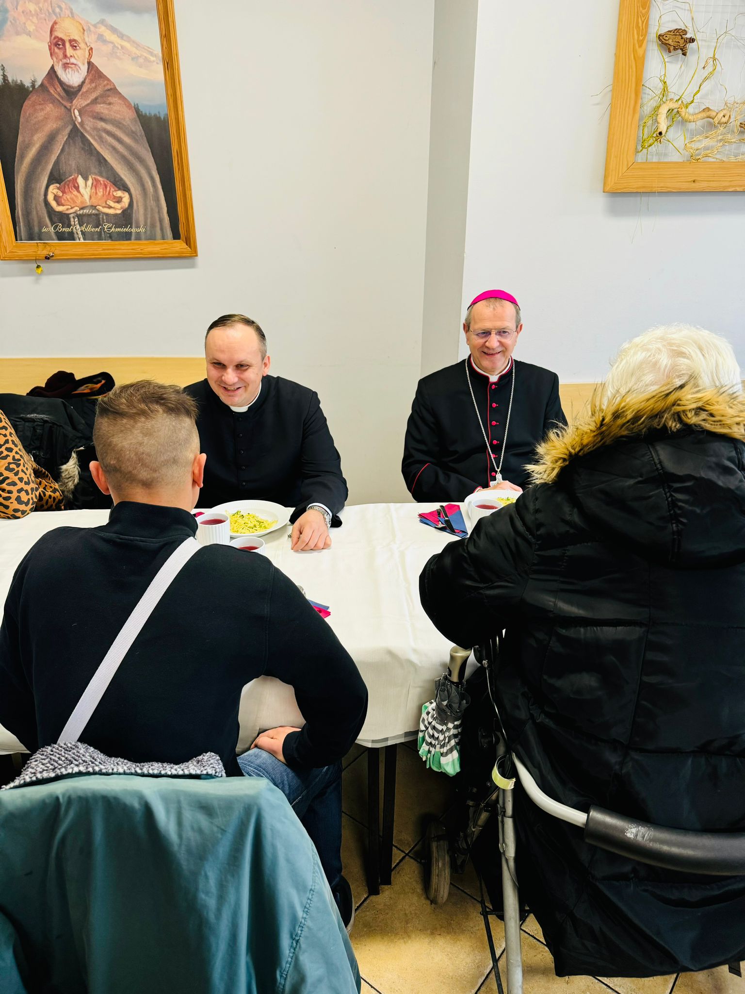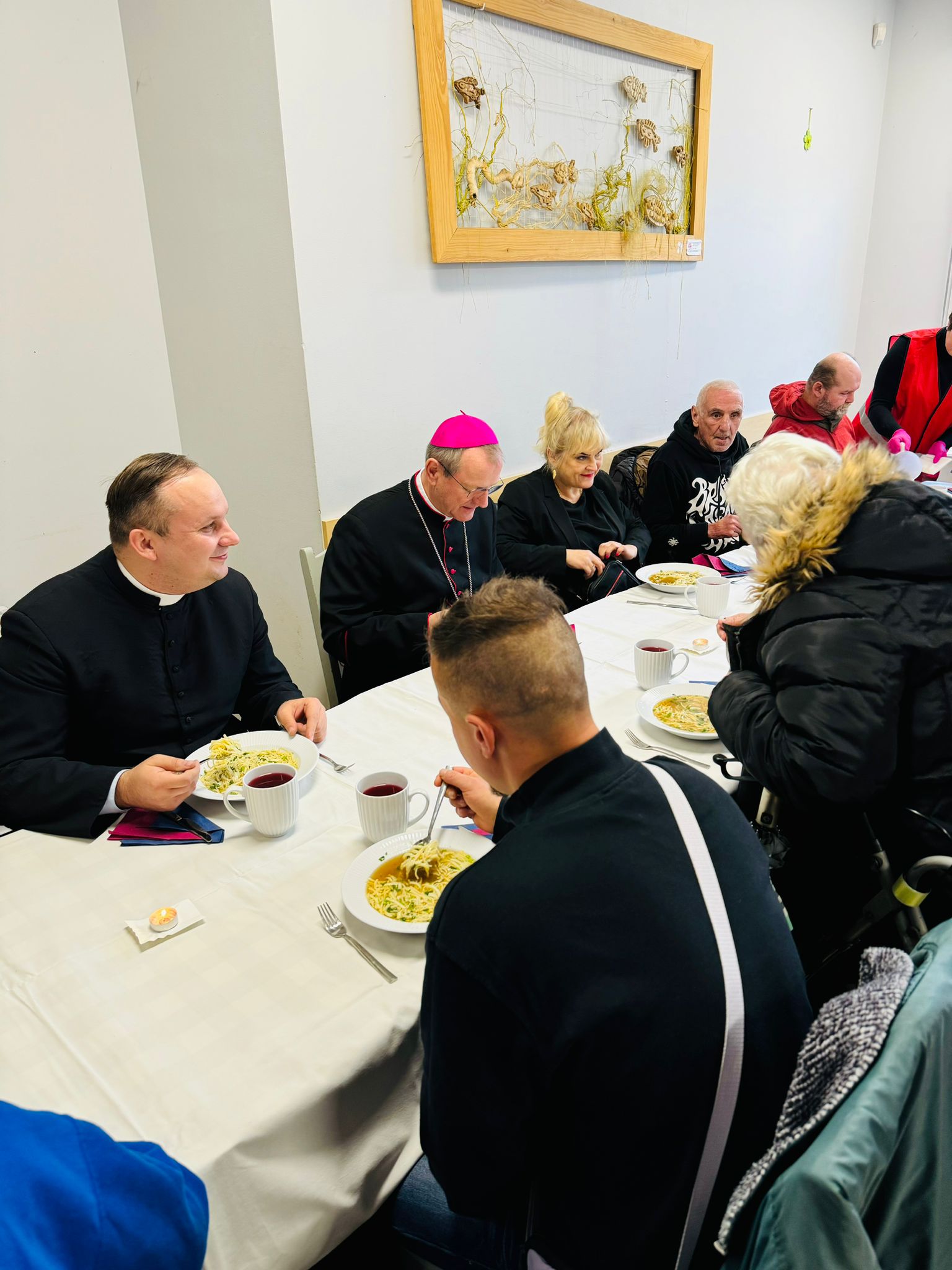 W Jadłodajni Gdańskiej Caritas do wspólnego, uroczystego stołu zasiedli Potrzebujący, Arcybiskup Tadeusz Wojda, Biskup Wiesław Szlachetka, Dyrektor CAG ks. Andrzej Wiecki oraz Wicedyrekor CAG ks. Piotr Weigelt