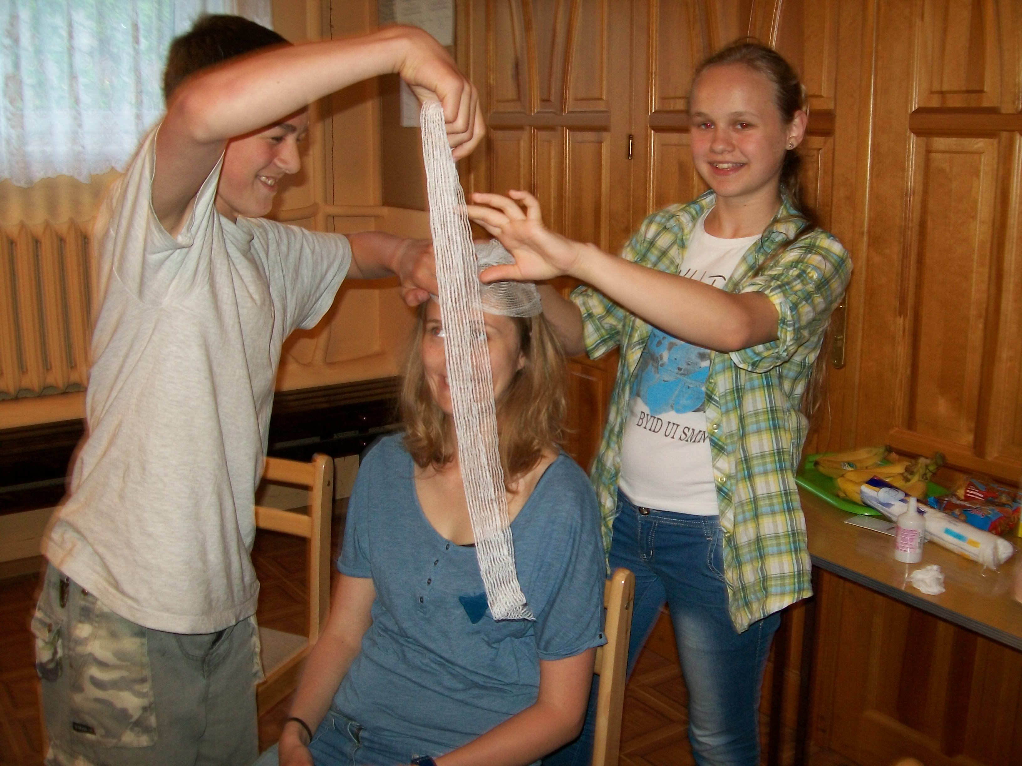 Pani Maria Gierusz, lekarka, przyjechała do nas, by pokazać, jak w przypadku zagrożenia pomóc sobie i innym – innymi słowy – przeprowadziła szkolenie z pierwszej pomocy. Dowiedzieliśmy się, jak zareagować między innymi w sytuacji, gdy ktoś straci przytomność, zasłabnie czy się zadławi. Wiemy już też jak ułożyć człowieka w pozycji bocznej ustalonej, jak wezwać pomoc i jak unieruchomić złamaną rękę. Nowe umiejętności ćwiczyliśmy na fantomie a bandażowania uczyliśmy się na sobie nawzajem i trzeba przyznać, że było przy tym trochę zabawy 🙂