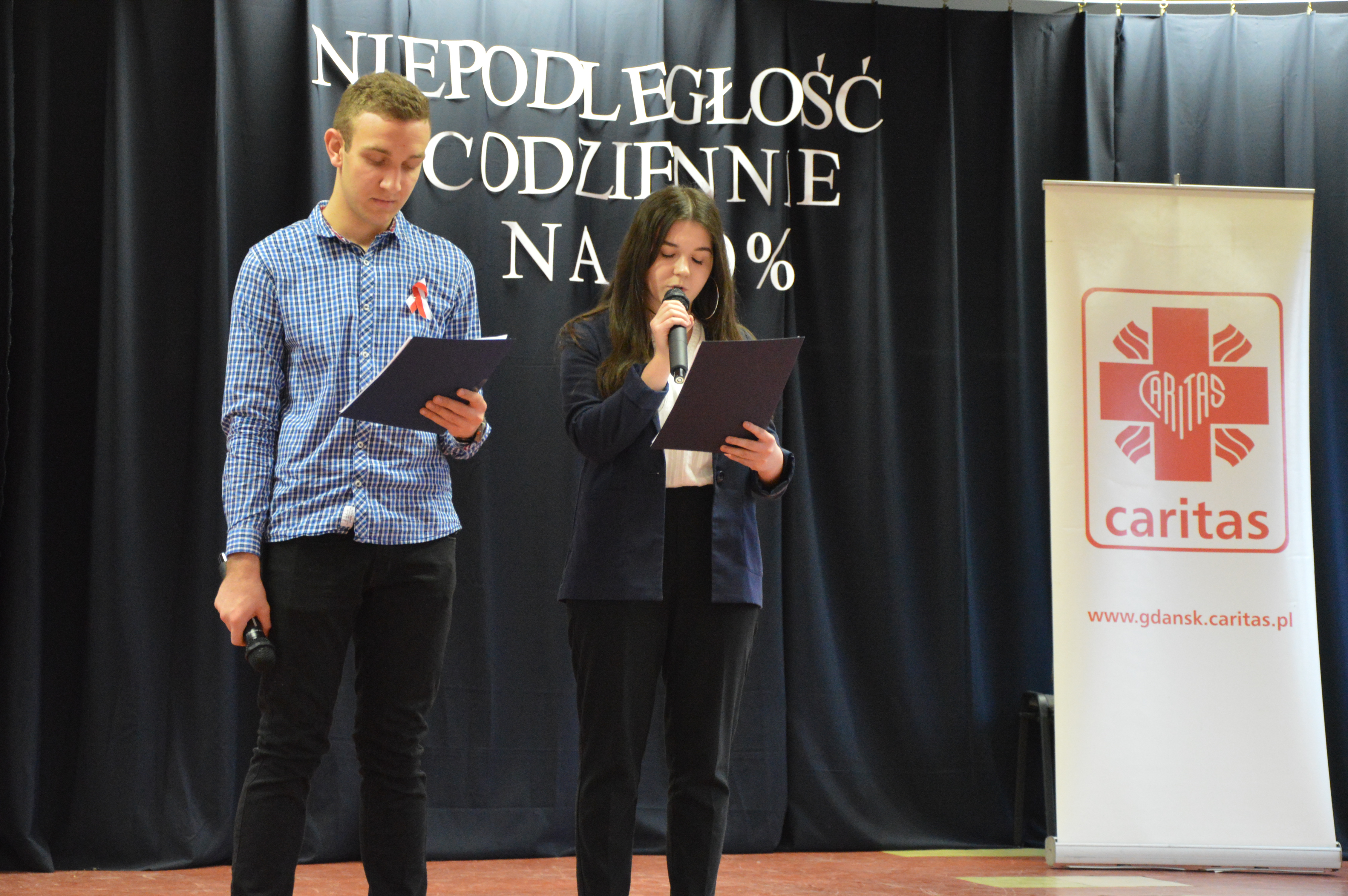 22 listopada Szkolne Koło Caritas z IX LO w Gdyni zorganizowało widowisko muzyczne dla seniorów dotyczące Legionów Polski i Marszałka Józefa Piłsudskiego nawiązując do setnej rocznicy odzyskania Niepodległości jak i do 151 rocznicy urodzin Marszałka Józefa Piłsudskiego. Przygotowane przedstawienie było kolejnym etapem projektu „Niepodległość – Codziennie na 100%” w ramach programu „100 projektów na 100-lecie Odzyskania Niepodległości Polski” organizowanego przez Caritas Polska oraz Biedronkę, w którym uczestniczą wolontariusze IX LO. Na spotkanie zaprosili m.in. uczestników zaprzyjaźnionego domu seniora z Orłowa oraz członków Związku Piłsudczyków w Gdyni. Przygotowane teksty i piosenki wywołały wiele wspomnień i wzruszeń wśród zaproszonych gości, a także samych wolontariuszy.