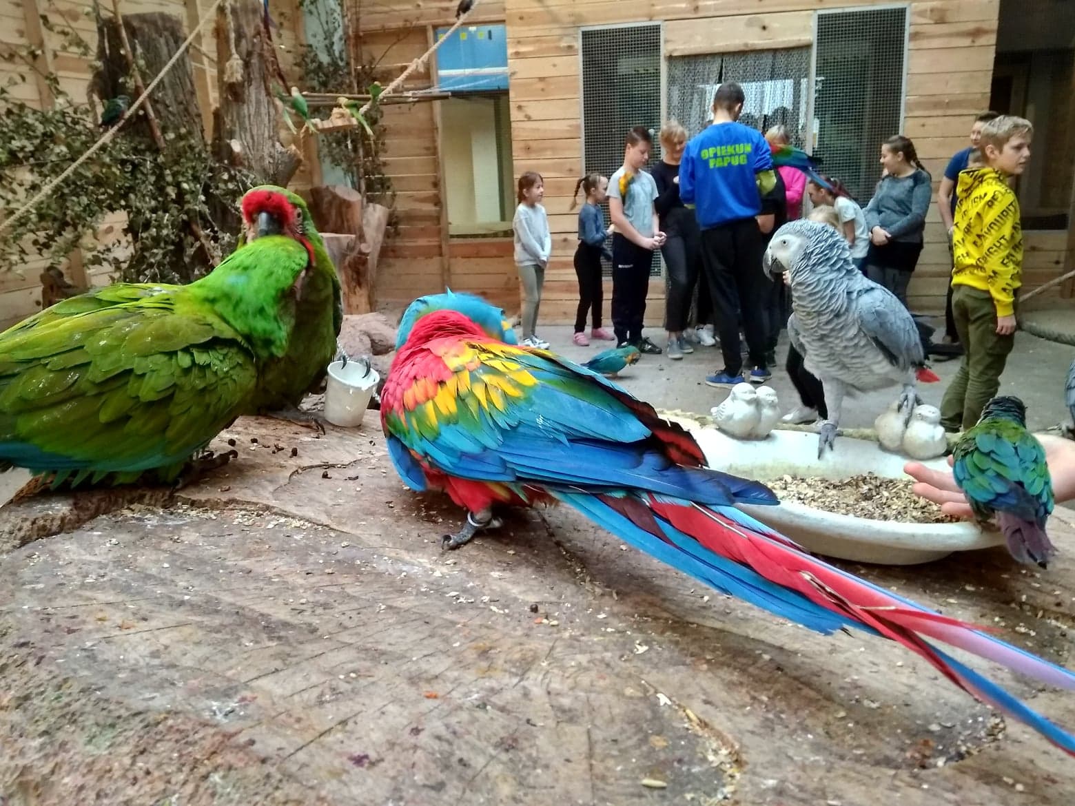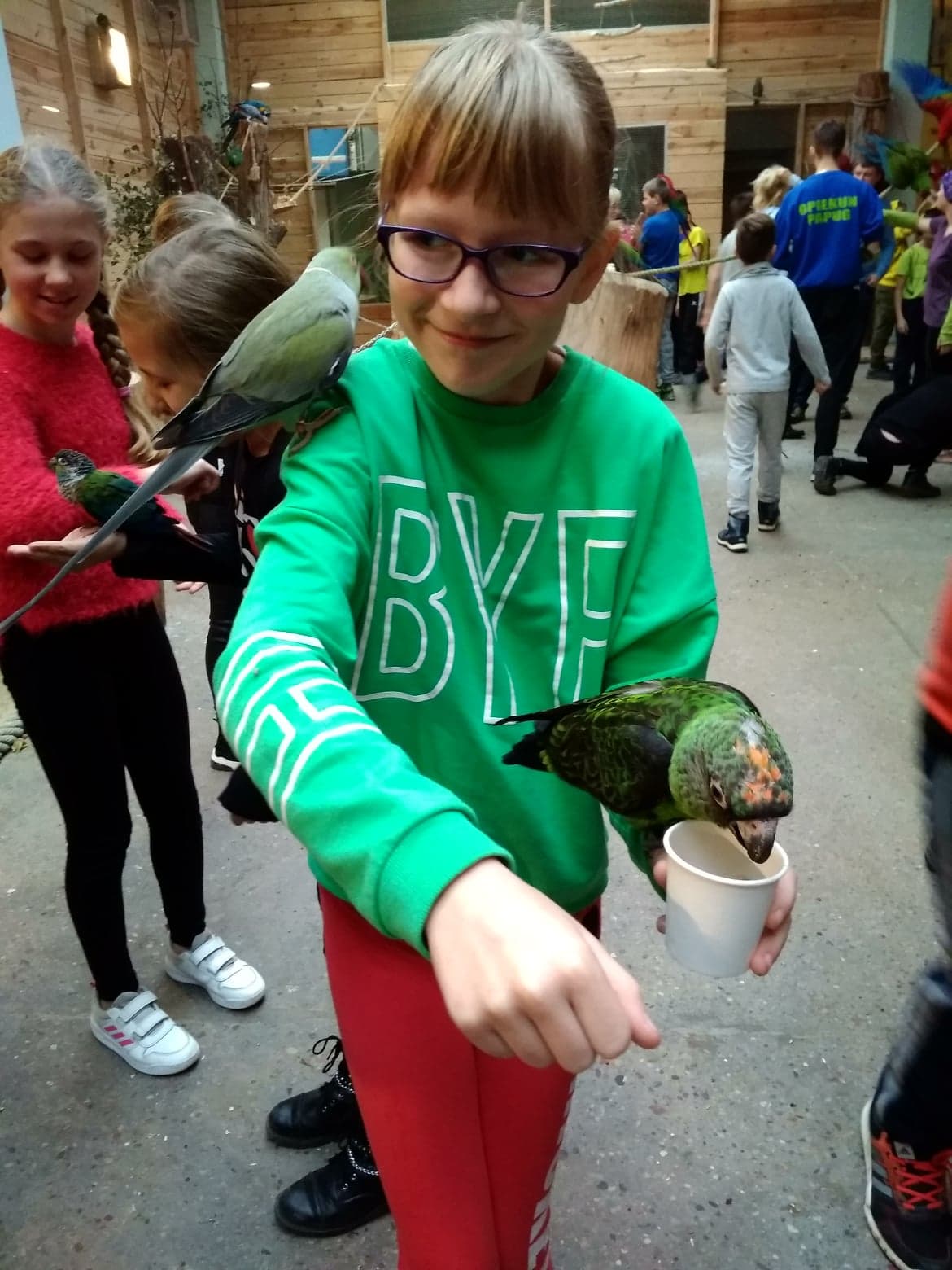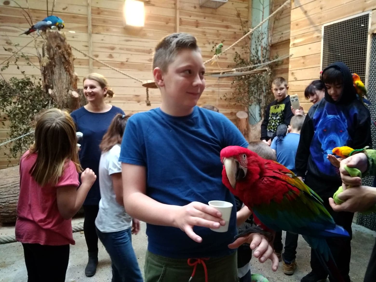 W sobotę rano około 50-osobowa grupa dzieci ze świetlic żukowskich odwiedziła gdańską Papugarnię. Po wejściu wyglądało to, jakbyśmy przenieśli się w inny wymiar. Mnóstwo papug różnej wielkości i ubarwienia, bardzo głośnych i towarzyskich od razu zaczęło do nas podlatywać, siadać na głowach i ramionach, próbując wyrwać nam z rąk kubki z karmą. Podczas wizyty poznaliśmy też surykatki i lemur. Co niektórzy mieli okazję wziąć udział w karmieniu tych drugich. Ta wizyta z pewnością na długo zostanie w naszej pamięci.
