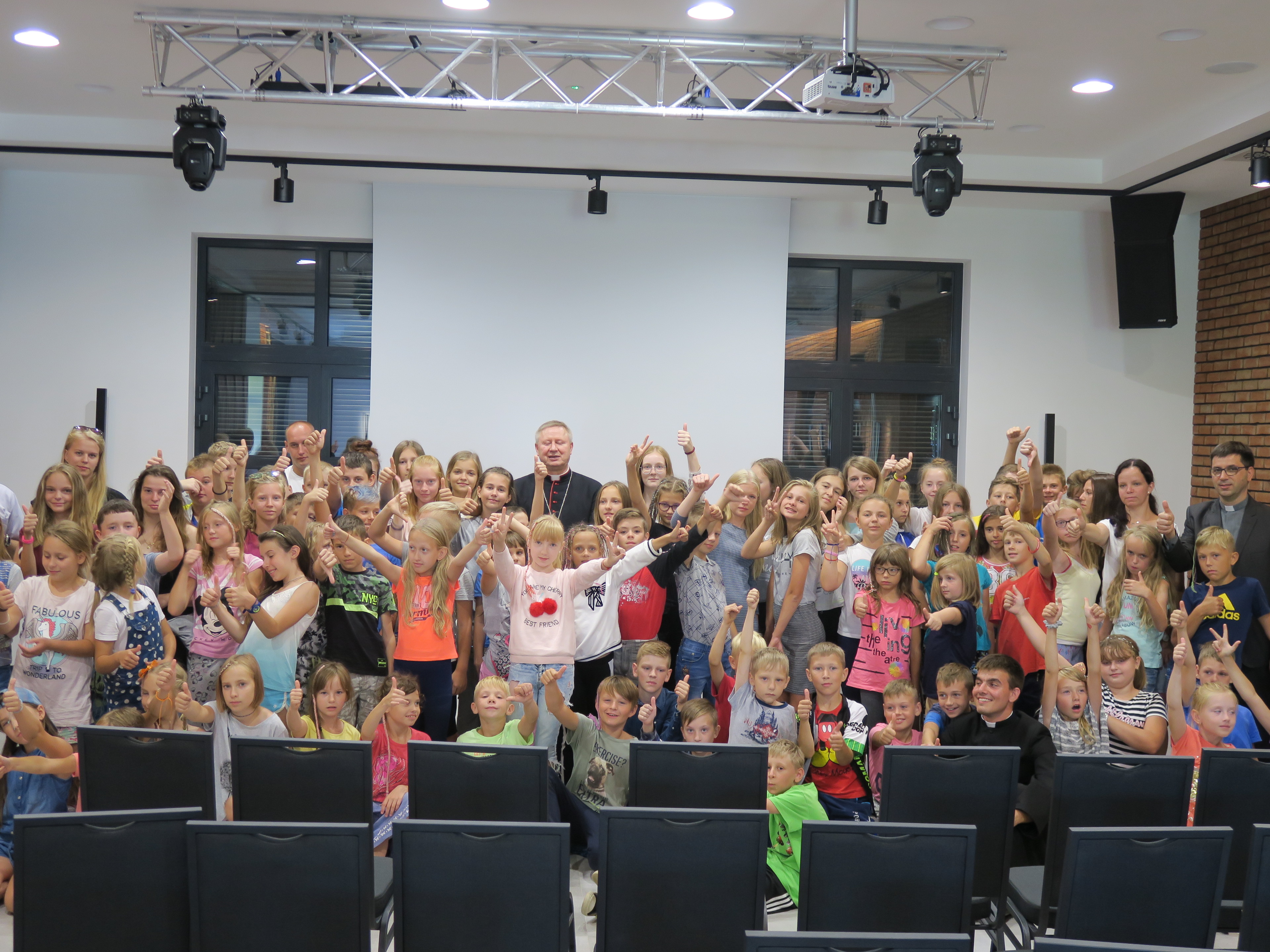 Spotkanie rozpoczęło się na dużej sali w nowym budynku, gdzie ks. Janusz Steć, dyrektora gdańskiej Caritas przywitał zarówno dzieci jak i ks. biskupa. Zaraz po przywitaniu ks. Janusz podziękował wszystkim zaangażowanym w to, aby kolonie te mogły się odbyć, m.in. wychowawcą, wolontariuszom, dobrodziejom, pracownikom ośrodka.