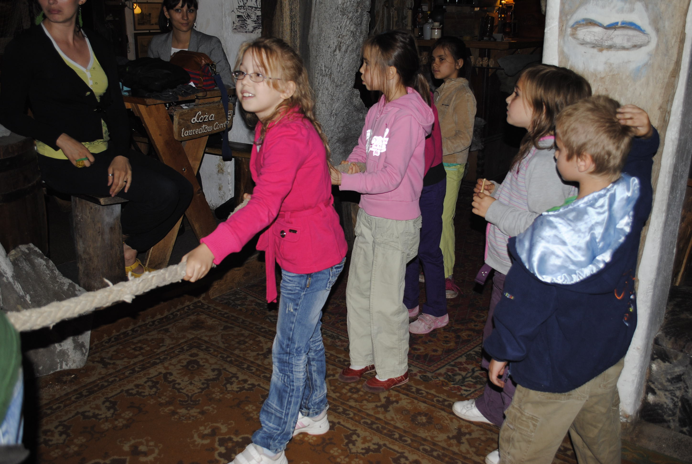W dniu wczorajszym wraz ze świetlicą z Sopotu wybraliśmy się do Gdańska Głównego. Tym razem czekała na nas morska przygoda. Otóż odwiedziliśmy Skansen Żeglugi „Zejman” – niesamowite miejsce. Właściciele Skansenu przywitali nas tuż przed wejściem. Za ogrodzeniem stał wrak statku „Helena”. Bardzo duże wrażenie zrobiła na nas informacja o tym, że coś co znajduje się naokoło drzwi wejściowych to kości szczęki wieloryba 🙂 Po wejściu do środka wszyscy zaniemówiliśmy. Miejsce jest mroczne, ale natychmiast uwagę przykuwa niezliczona ilośc najróżniejszych przedmiotów, eksponatów, bibelotów i to wszystko związane z morzem i żeglugą. Ilość rzeczy była tak duża, że niewiadomo na co zwrócić uwagę. Właściciel Skansenu, który prowadził warsztaty podzielił nas na cztery rywalizujące ze sobą wachty. Najpierw oprowadził nas po całym Skansenie opowiadając o różnych eksponatach i zadając nam pytania, za które każda wachta dostawała punkty. Widzieliśmy kości czaszki wieloryba, robiliśmy sobie zdjęcia ze szczęką rekina, dowiedzieliśmy się m.in. po co jest dzwon na statku, do czego służy „zegar z ruchomymi wskazówkami” i wiele innych żeglarskich ciekawostek. Wśród konkurencji był konkurs plastyczny wybranego eksponatu znajdującego się w Skansenie, przeciąganie liny, wbijanie gwoździa w beczkę, liczenie danych eksponatów itp. Wszyscy bawili się niezwykle dobrze. A dobrej zabawie towarzyszyło zdobywanie informacji oraz atmosfera tajemniczości miejsca, które ma „własną duszę”.