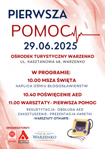 W pierwszy weekend wakacji, zapraszamy do Ośrodka Turystycznego Warzenko na warsztaty z udzielania pierwsze pomocy.