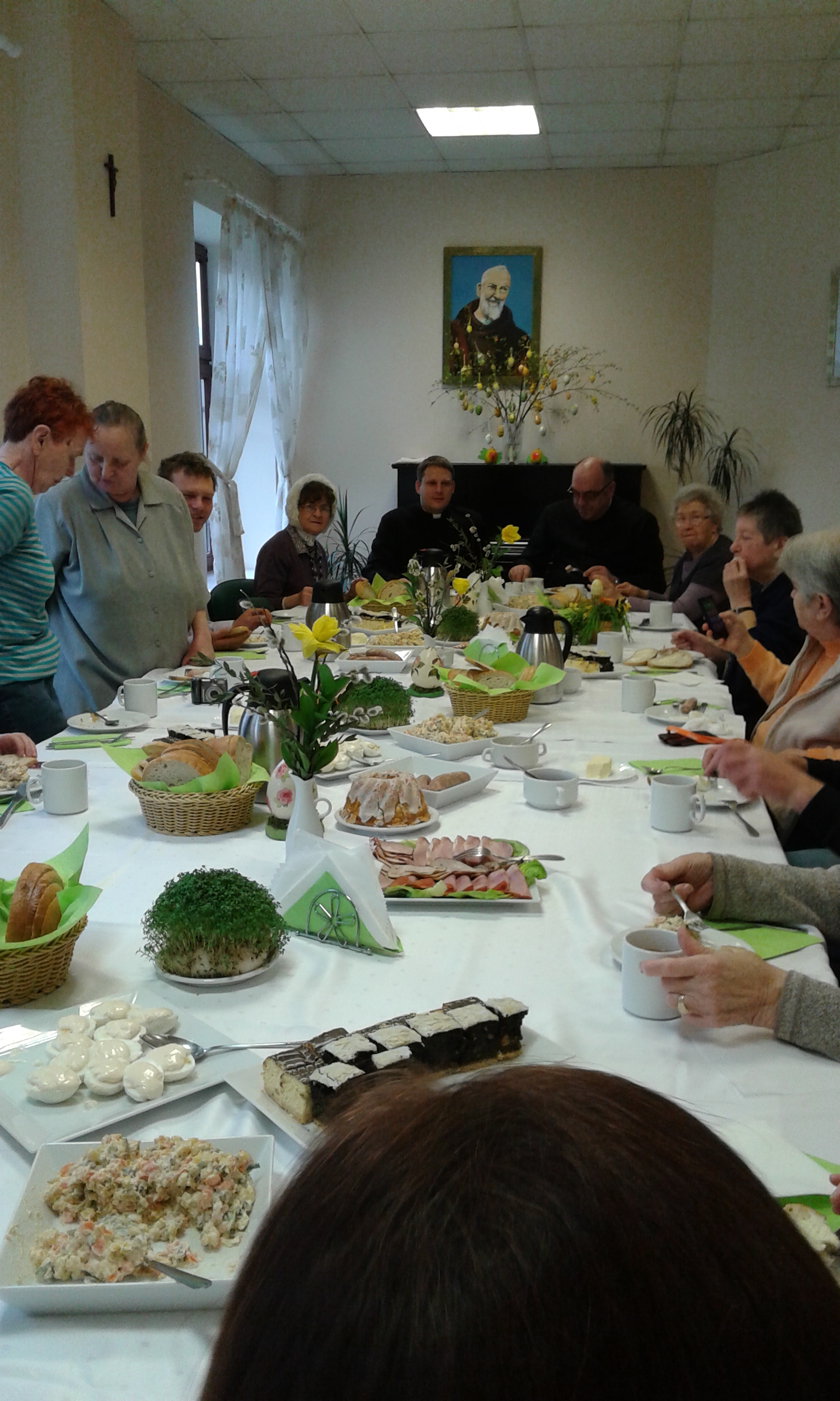 Dobra nowina rozbrzmiewa od rana w naszych sercach i w naszej placówce. Eucharystia i wspólny posiłek pozwoliły nam cieszyć się z łaski i nadziei, jaka niesie Zmartwychwstanie. Byli z nami nasi przyjaciele – ks. Piotr, ks. Stanisław i Pani Jadwiga. Kapłani poświęcili pokarmy, złożyliśmy sobie życzenia dzieląc się święconym jajkiem, symbolem nowego życia i odrodzenia. Wspólnie zasiedliśmy do stołu, aby jedząc cieszyć się i radować wspólną obecnością. Świąteczne śniadanie upłynęło w radosnej atmosferze, uśmiechom i dobrym chwilom nie było końca!