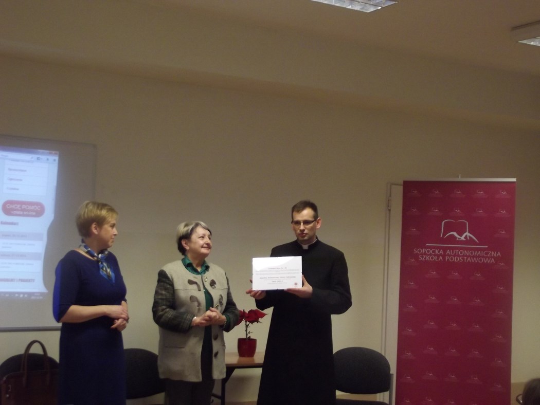 Na początku grudnia dyrektor Domu Hospicyjnego ks. Tomasz Kosewski wraz z wolontariuszką Panią Barbarą Dettlaff gościli w Sopockiej Autonomicznej Szkole Podstawowej. W nawiązaniu do tradycji tych spotkań pierwsza część dotyczyła książki „Oskar i Pani Róża”, której tytułowy bohater zmaga się z chorobą nowotworową.  W tym cierpieniu wspiera go wolontariuszka Pani Róża.