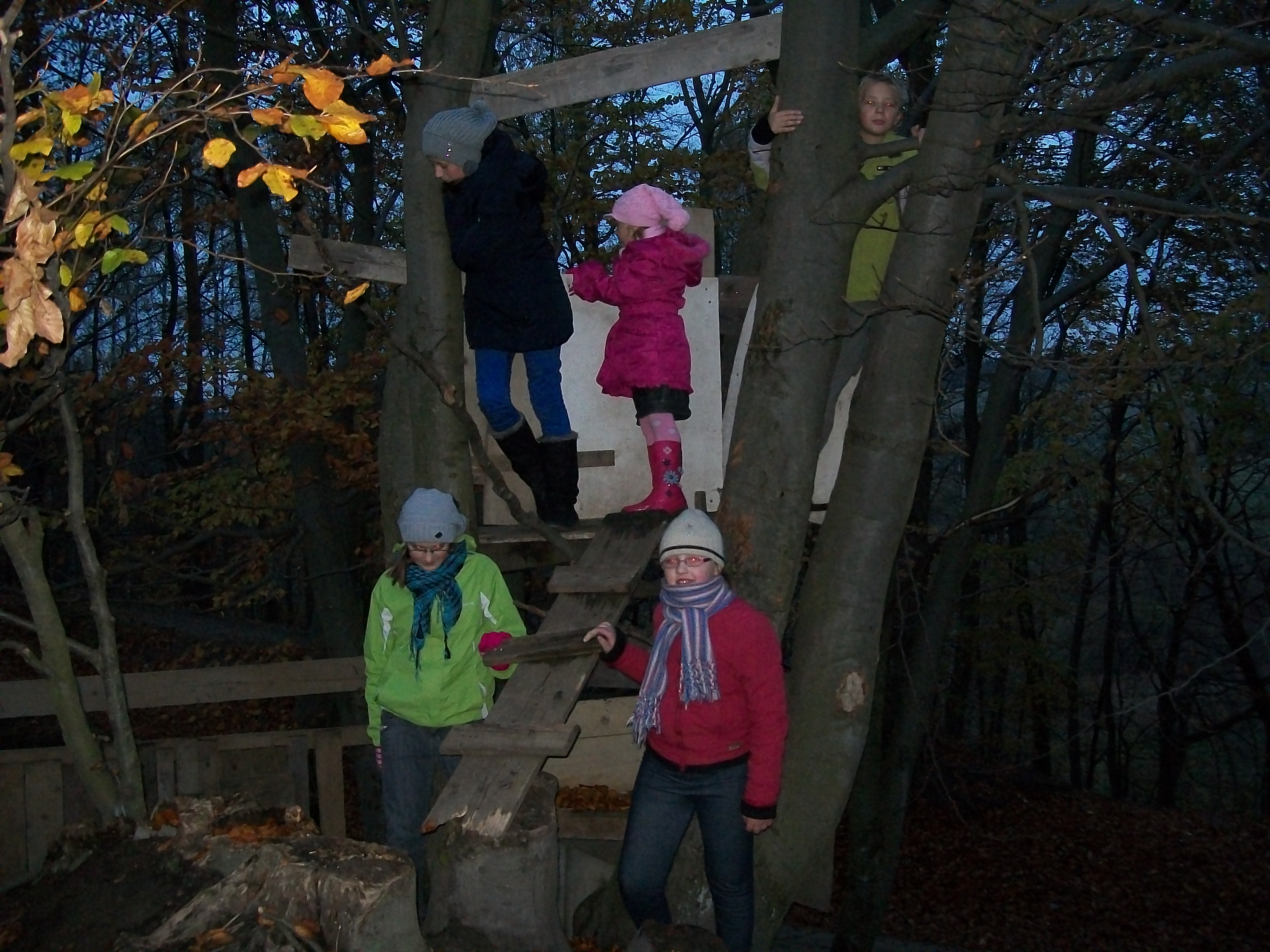 Nasze ostatnie październikowe spotkanie zakończyło się wyjściem do pobliskiego lasu. Był to przeddzień Uroczystości Wszystkich Świętych. Poszliśmy więc na poszukiwanie świętych. Wspinaliśmy się na drzewa, by dojrzeć ich w górze.  Szukaliśmy ich wśród  sosen, świerków i brzóz. Wreszcie natrafiliśmy na  domek na drzewie. Myśleliśmy, że tam kogoś znajdziemy, ale nikogo tam nie zastaliśmy.