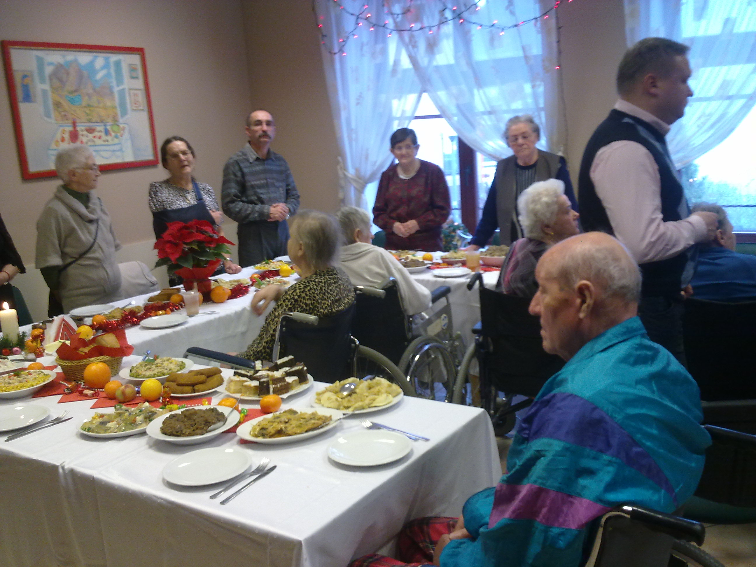 W ten szczególny dla nas czas wigilii Bożego Narodzenia zebraliśmy się przy stole, aby wspólnie oczekiwać nowonarodzonego Chrystusa. Ponad 20 osób – pracowników, pacjentów i ich rodzin, wolontariuszy oraz przyjaciół placówki zebrało się na wspólnej wieczerzy, dzieląc się opłatkiem, życzeniami oraz tym co najważniejsze – braterską miłością i bliskością bliźniego. Po odczytaniu fragmentu ewangelii i podzieleniu się opłatkiem zasiedliśmy do stołu. Były tradycyjne postne potrawy, były kolędy, zapanował między nami prawdziwy bożonarodzeniowy nastrój.