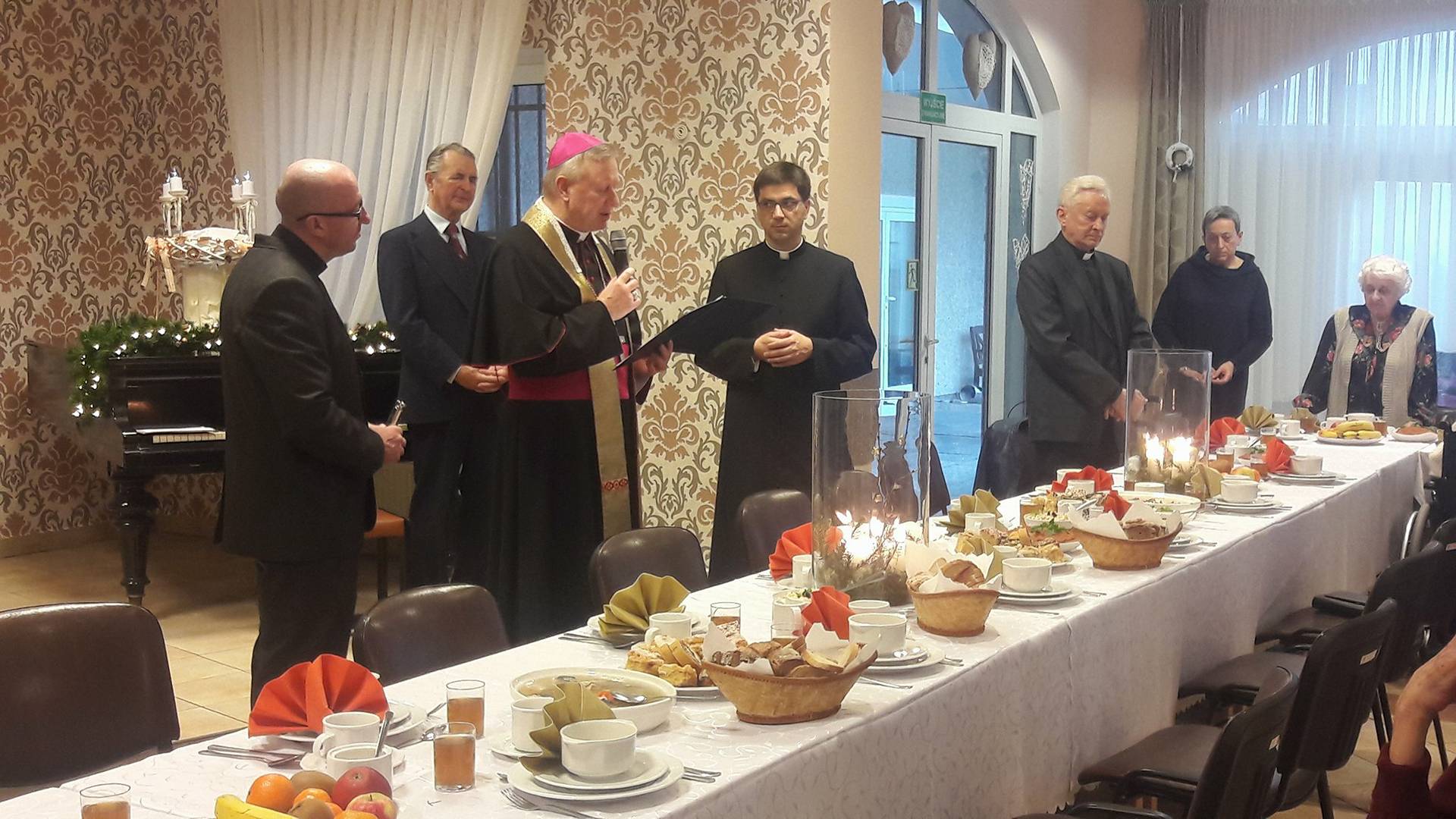 Wieczór wigilijny w polskiej tradycji to jeden z najbardziej uroczystych i wzruszających momentów w roku. I taka też była tegoroczna Wigilia w naszym Centrum Pomocowym Caritas im. Jana Pawła II. Przy wigilijnym stole – 24 grudnia 2017 roku, w samo południe, odwiedził nas m.in ks. biskup Wiesław Szlachetka. Nie mogło zabraknąć również Dyrektora Caritas Archidiecezji Gdańskiej ks. Janusza Stecia. Spotkanie wigilijne rozpoczęło się od czytania Ewangelii, później uczestnicy wieczerzy podzielili się opłatkiem i złożyli sobie życzenia, a następnie wszyscy zasiedli do świątecznego stołu. Na pięknie udekorowanych stołach zagościły tradycyjne potrawy: pyszne pierogi z kapustą i grzybami, ryba w galarecie, barszcz z uszkami, kompot z suszu, karp smażony, ryba po grecku, śledź w oleju. W sali przepełnionej świątecznymi dekoracjami potrawy smakowały wyjątkowo. Wspólnemu ucztowaniu towarzyszyły polskie kolędy w wykonaniu mieszkańców, ich rodzin, wolontariuszy, zaproszonych gości- do akompaniamentu fortepianu oraz akordeonu. Było nastrojowo, bardzo świątecznie, bo przecież najważniejsze żeby w ten dzień nikt nie był sam. Na zakończenie wigilijnego spotkania rozdane zostały świąteczne paczki, które sprawiły wszystkim mnóstwo radości.