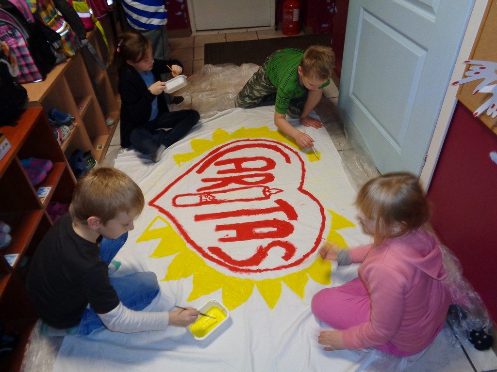 Wychowankowie z grupy „Anielska Kraina” w ramach przygotowań do rozpoczęcia akcji „Wigilijnego Dzieła Pomocy Dzieciom” wykonali wielki plakat na płótnie przedstawiający rozgrzane przez ludzi dobrej woli serce, które z kolei dociera do różnych dzieci dzięki dzialalności Caritas.