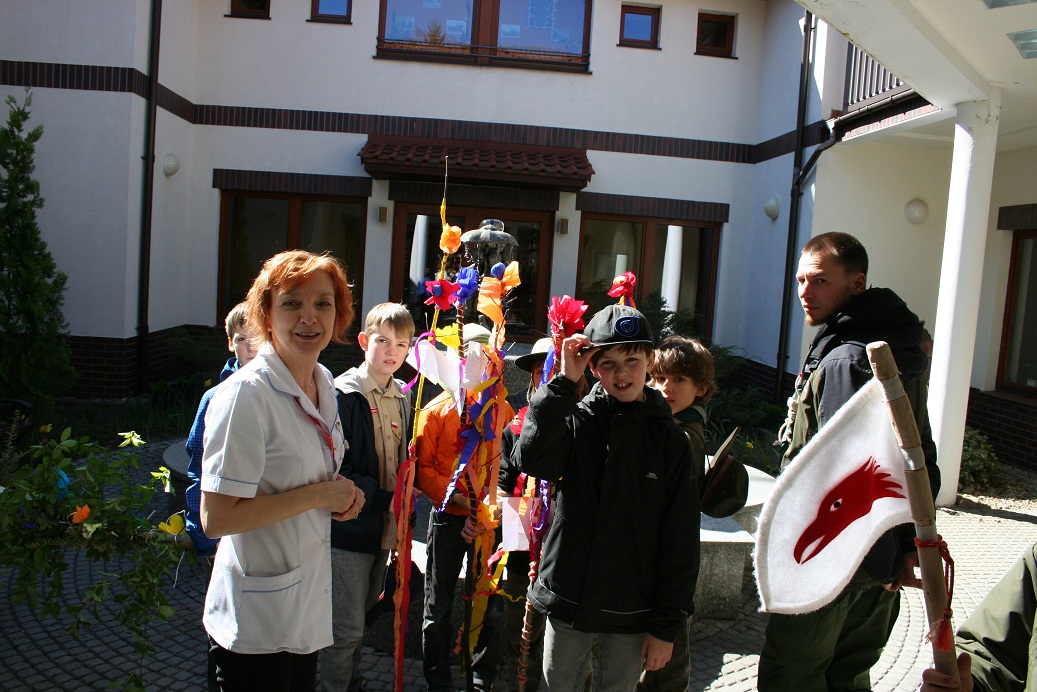 W Środę 16 kwietnia gościliśmy w naszym Domu Hospicyjnym drużynę skautów ze szkoły podstawowej Lokomotywa w Sopocie. Gości w progi naszego domu wprowadziła Pani Danuta – pielęgniarka oddziałowa, pokazując jednocześnie pięknie rozwijające się bratki, którymi dwa tygodnie wcześniej skauci ozdobili nasz teren i budynek. Dziś zaskoczyli nasz ponownie – obdarowali naszych podopiecznych piękną dwumetrową „palmą radości” oraz wykonanymi samodzielnie mniejszymi kolorowymi palmami z dołączonymi życzeniami na kartkach – to dzieło drużyny chłopięcej.
