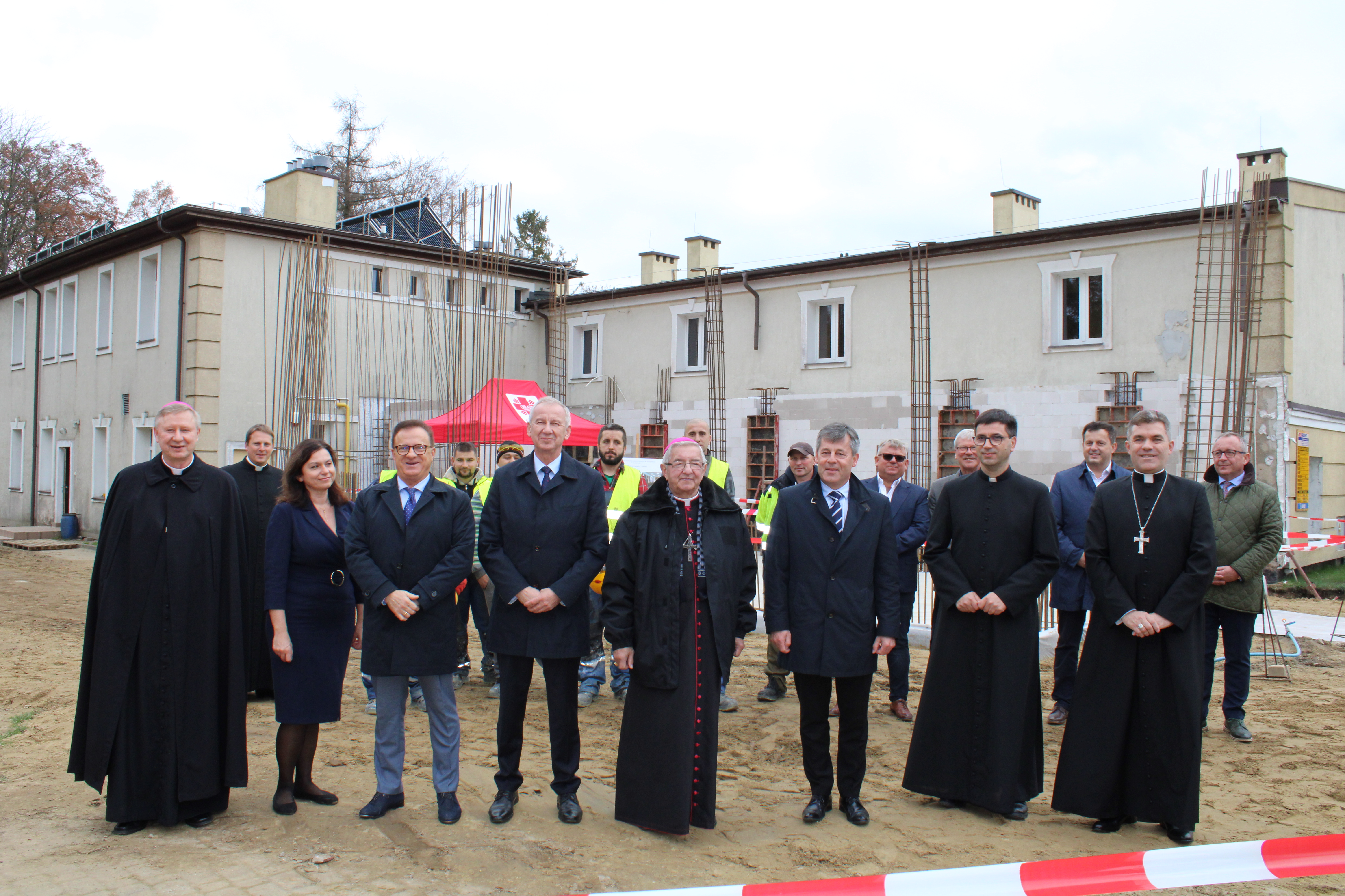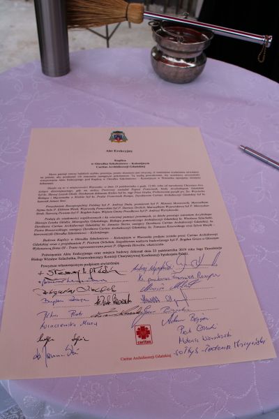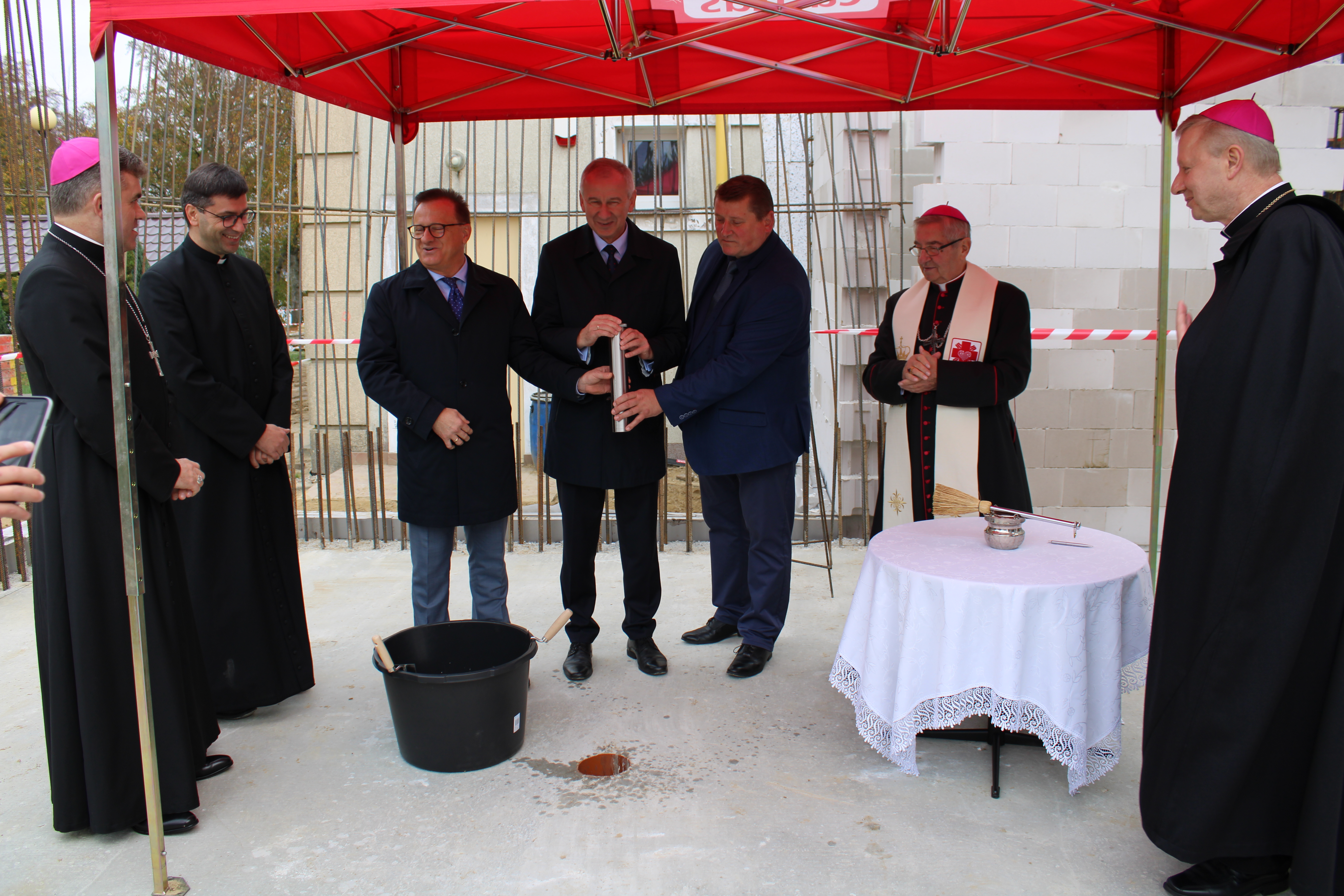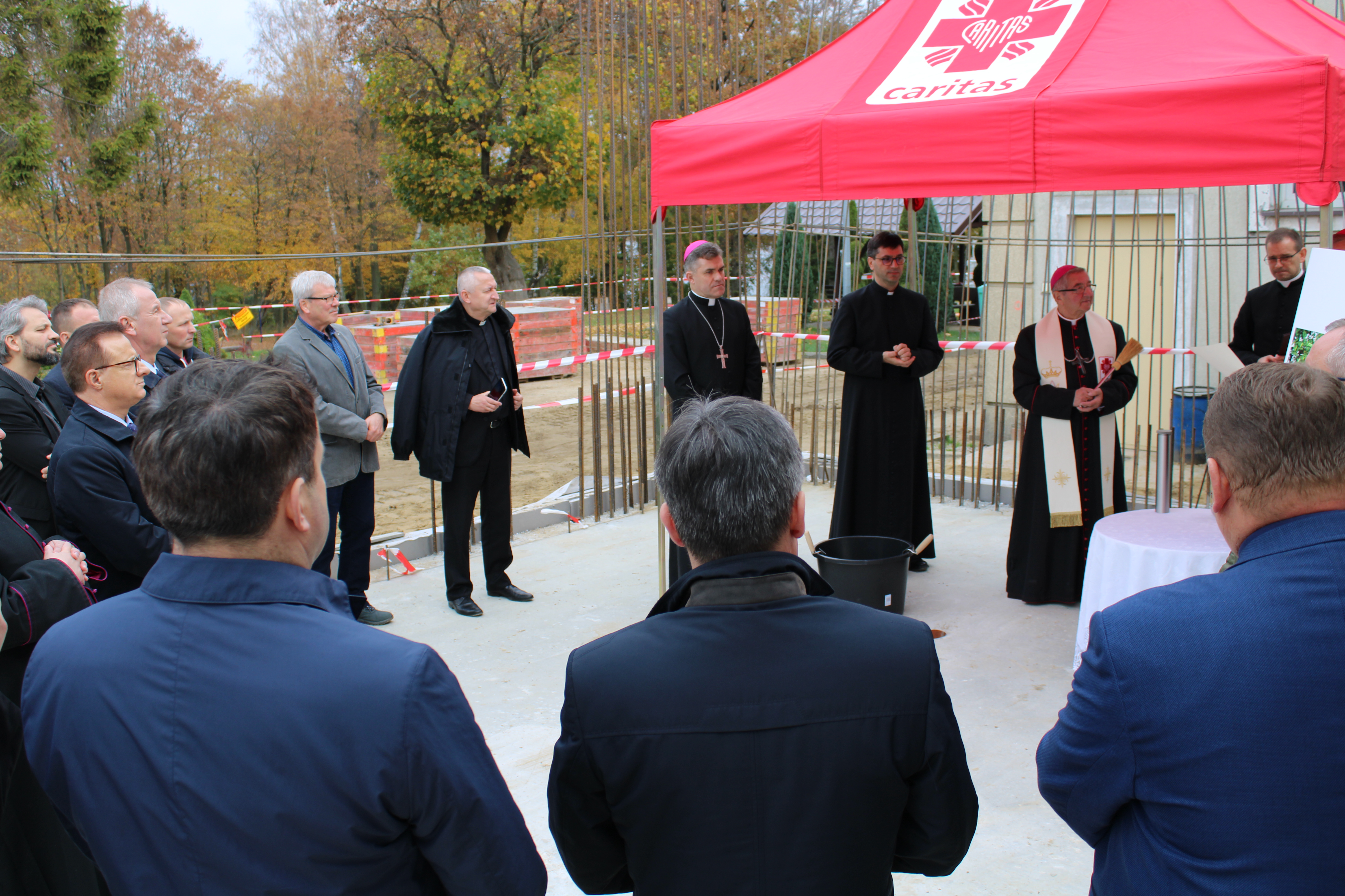 W dniu 23 października 2019 r. o godz. 12:00 w Ośrodku Warzenko znajdującym się przy ul. Kasztanowej 48 odbyła się uroczystość wmurowania kamienia węgielnego pod budowę Kaplicy. Kamień węgielny oraz powstające mury Kaplicy poświęcili JE Ks. Bp. Sławoj Leszek Głódź, Ks. Bp Wiesława Szlachetka oraz Ks. Bp. Zbigniew Zieliński. W uroczystości brało udział wielu znamienitych gości, w szczególności Starosta Kartuski P. Bogdan Łapa, Wicestarosta Kartuski P. Piotr Fikus, Wójt Gminy Przodkowo P. Andrzej Wyrzykowski, Prezes WFOŚiGW w Gdańsku P. Maciej Kazienko, Proboszcz Parafii w Kielnie Ks. Franciszek Rompa, projektant budynku Kaplicy P. Piotr Orlicki, inspektor nadzoru P. Bogdan Gruca, właściciel firmy OL-Trans, która buduje Kaplicę P. Olgierd Hewelt wraz z kierownikiem budowy i pracownikami oraz Sołtys wsi Warzenko P. Tadeusz Skrzyński. Gospodarzami tego niecodziennego i niezwykle ważnego wydarzenia dla Caritas Archidiecezji Gdańskiej byli: Dyrektor Caritas Archidiecezji Gdańskiej Ks. Janusz Steć, wicedyrektor Ks. Piotr Brzozowski, wicedyrektor Ks. Tomasz Kosewski oraz Sylwia Motyka – Kierowniczka Ośrodka w Warzenku.